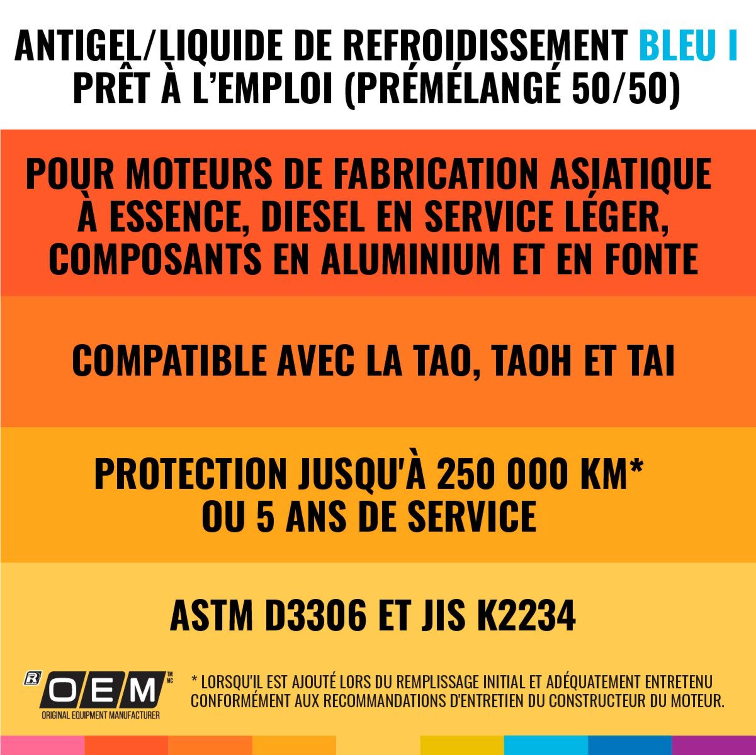 Liquide de refroidissement d'origine Bleu I spécialement conçu pour les véhicules asiatiques et les camionnettes nécessitant un antigel et liquide de refroidissement à base de phosphate à technologie d'acide organique dans les moteurs en aluminium