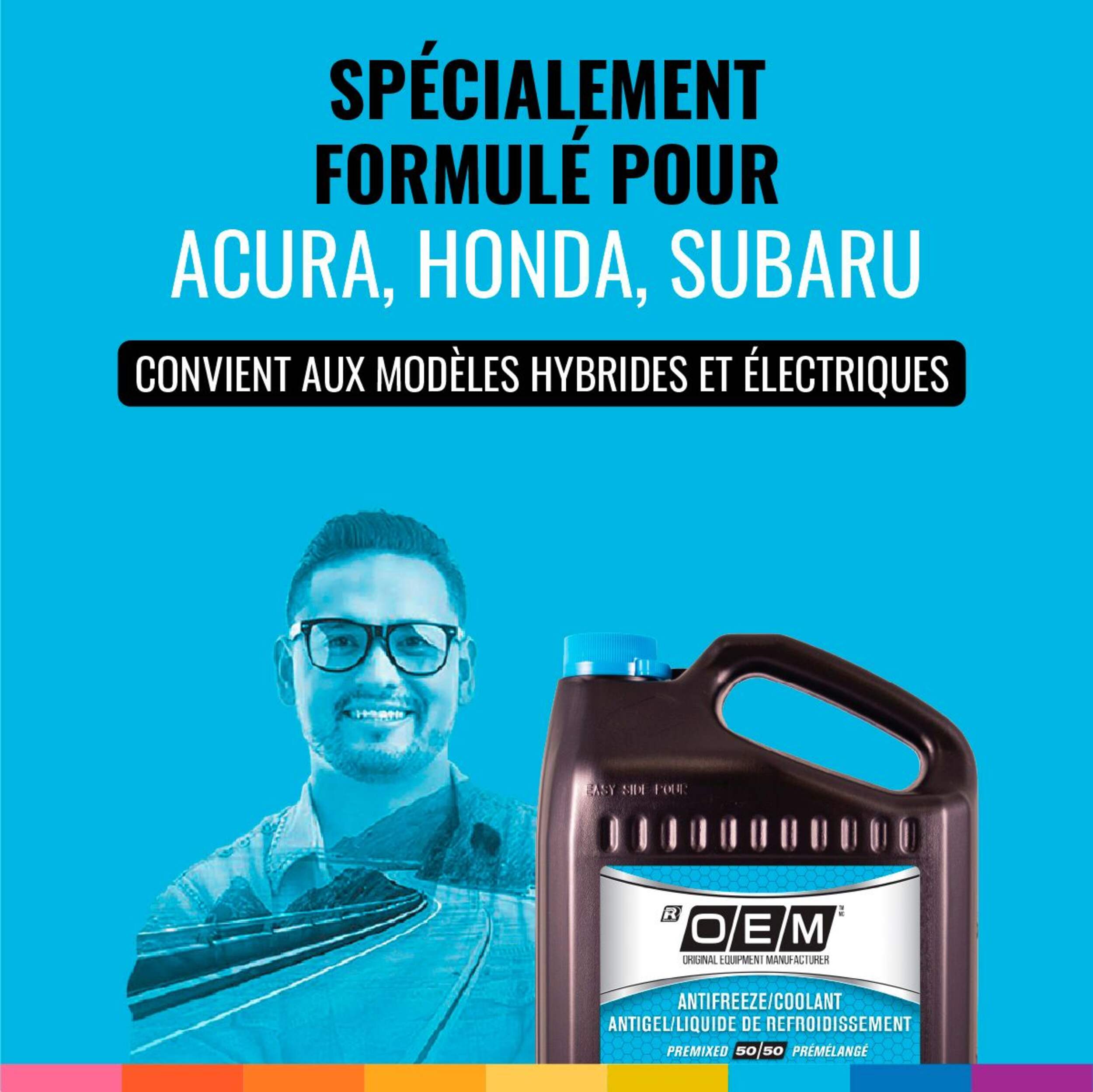 Le liquide de refroidissement antigel prêt à l'emploi à durée prolongée du fabricant d'origine Blue I est spécialement formulé pour les véhicules Acura Honda et Subaru et convient aux modèles hybrides et électriques. Ce liquide de refroidissement prémélangé de qualité supérieure offre une protection exceptionnelle contre les températures extrêmes, prévenant la surchauffe du moteur en été et le gel en hiver. Conçu pour protéger contre la rouille, la corrosion et les piqûres, cet antigel assure la longévité de tous les métaux du système de refroidissement.