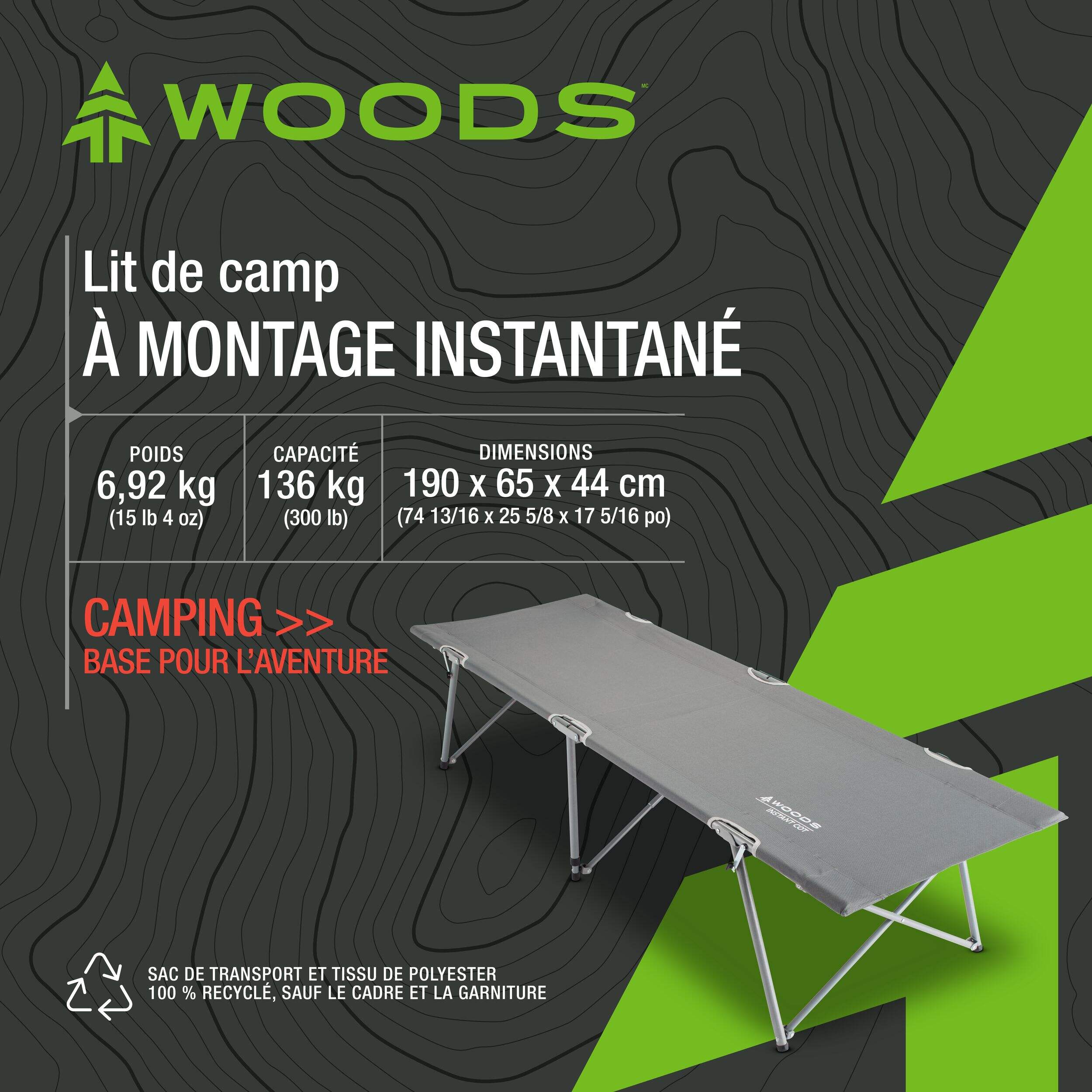 Le lit de camping Woods Instant est une solution fiable pour un sommeil confortable et surélevé durant tout voyage de camping. Grâce à son système de cadre facile à plier, il s'installe rapidement et offre une base robuste qui vous permet de vous reposer au-dessus du sol, vous protégeant des surfaces inégales et des conditions humides. Idéal pour les campeurs qui veulent maximiser l'espace, ce lit libère de l'espace de rangement en dessous, ce qui rend votre aire de camping plus organisée.