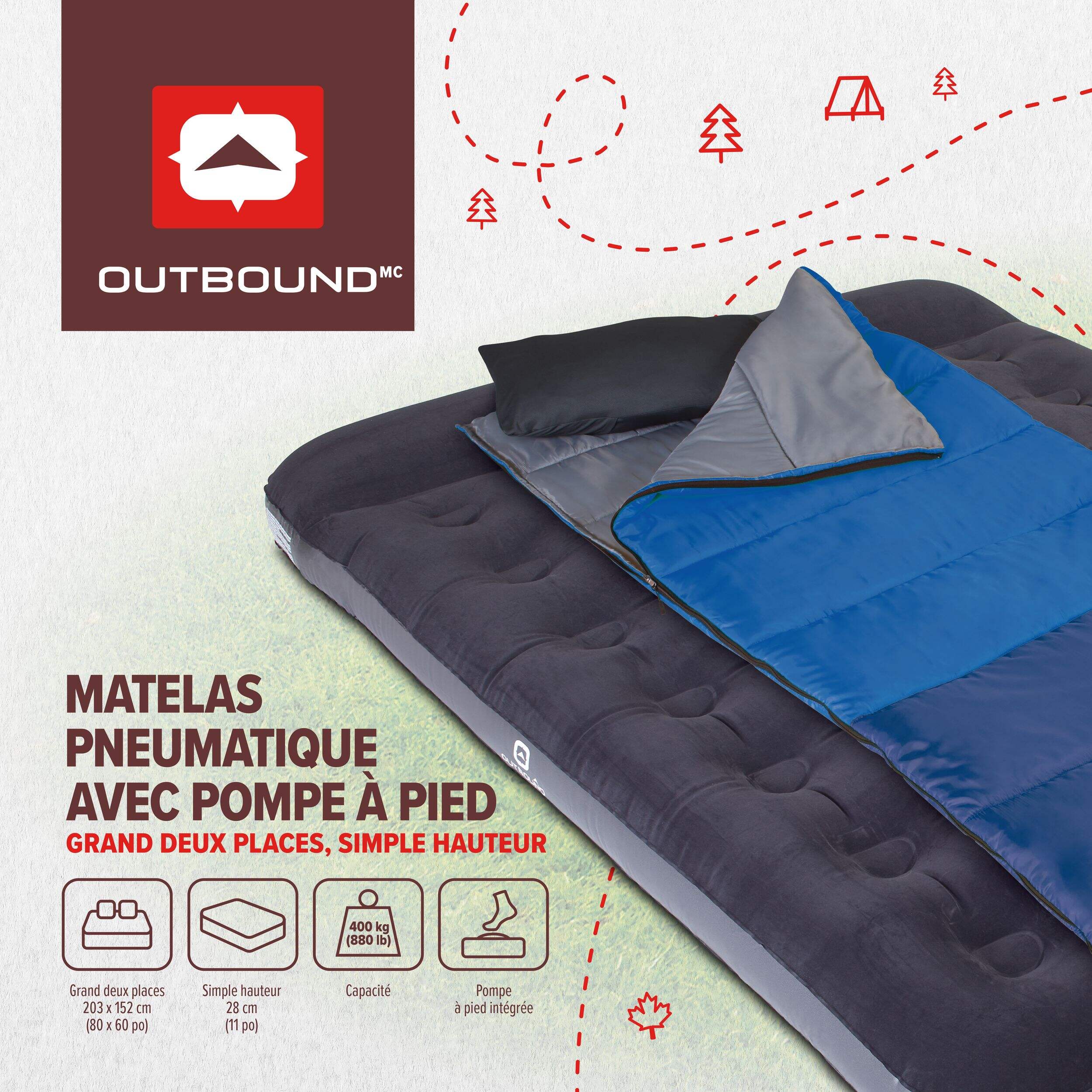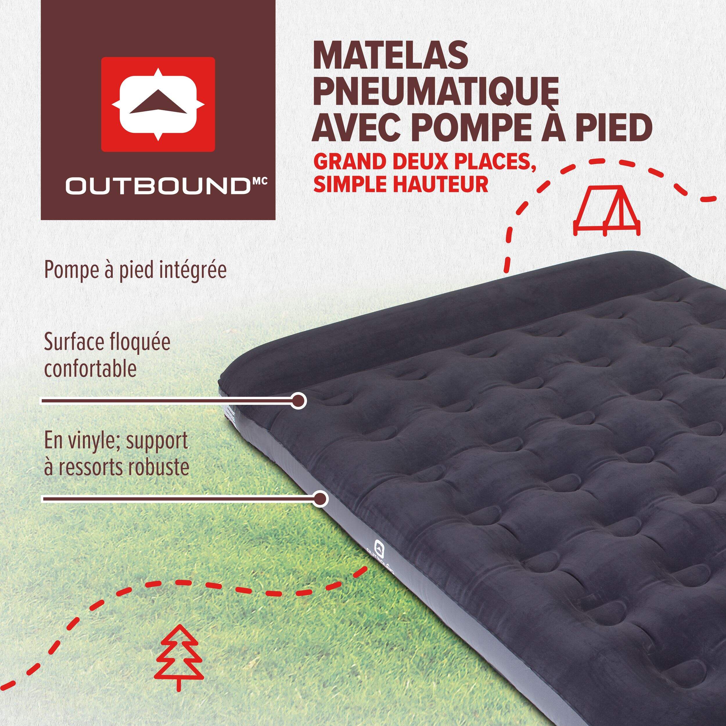 Faites du camping en tout confort grâce au matelas pneumatique grand Outbound. Ce matelas pneumatique en vinyle robuste se gonfle n'importe où grâce à la pompe à pied intégrée, ce qui vous permet de dire adieu aux maux de dos causés par le sommeil sur un sol rocailleux. Le dessus floqué vous garde bien au chaud, tandis que le nécessaire de réparation garantit que ce matelas pneumatique durera saison après saison. Il se gonfle et se dégonfle facilement entre deux aventures pour un rangement compact. Grâce à la structure à ressorts qui offre la même sensation qu'un vrai matelas, vous vous réveillerez frais et dispos pour la journée à venir.