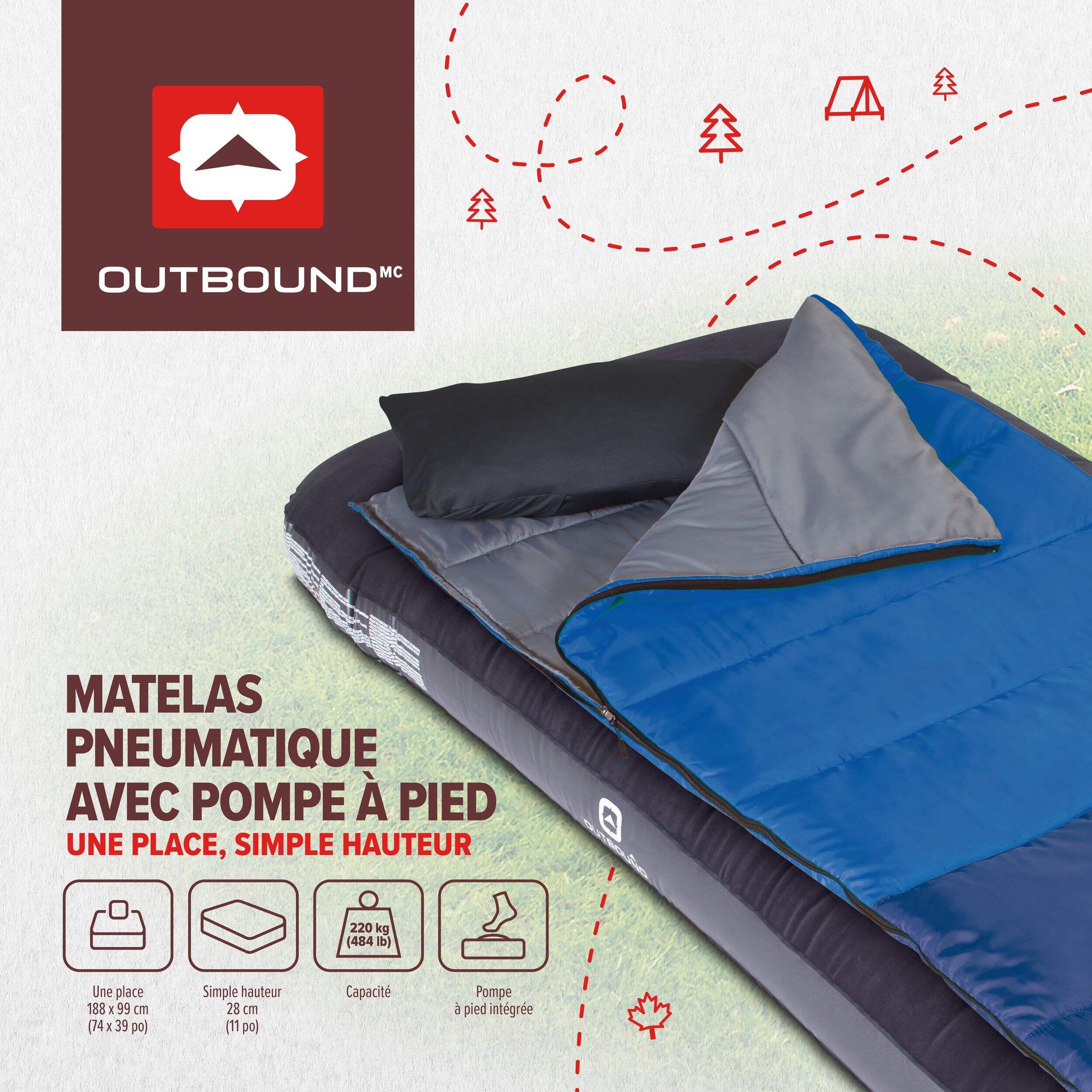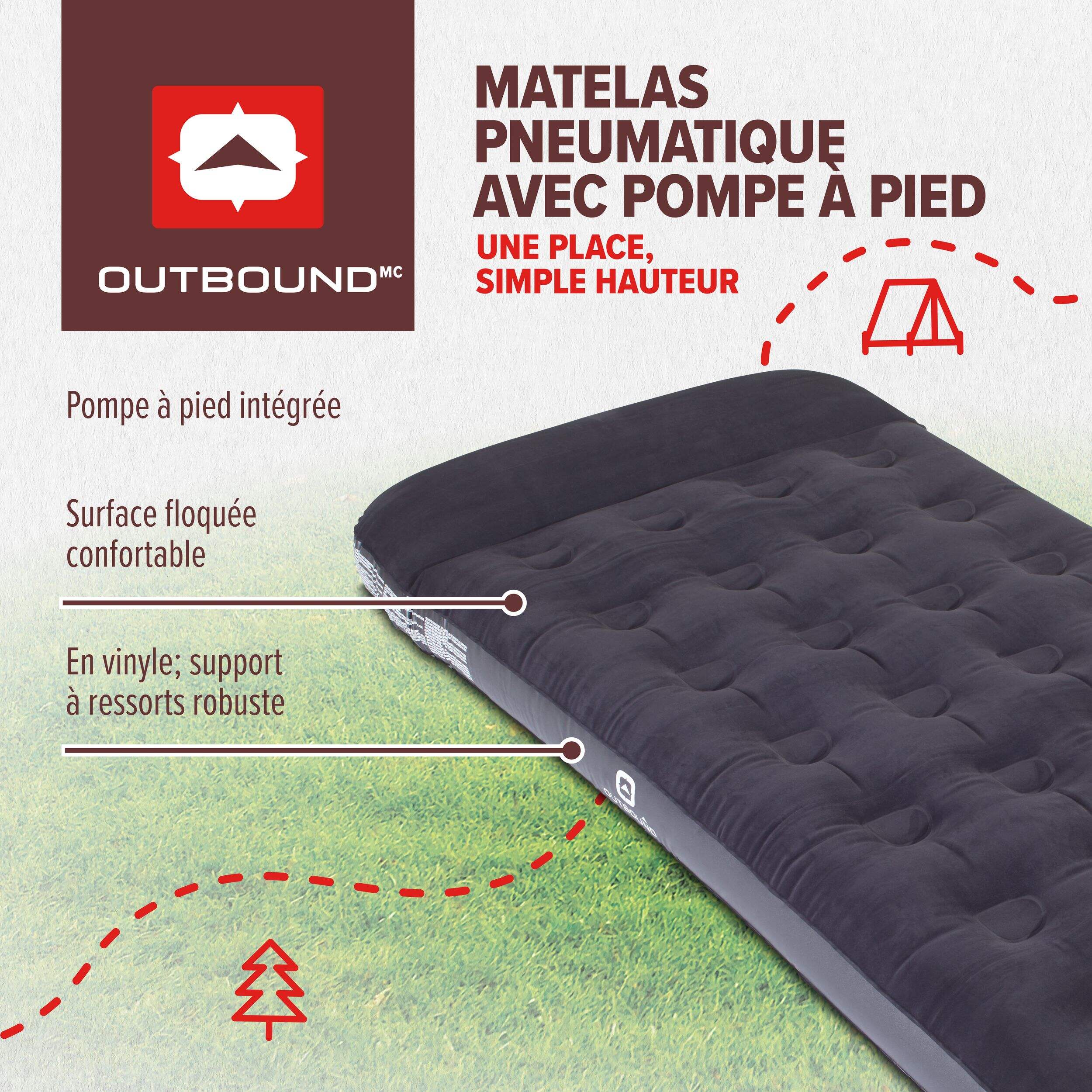 Faites du camping en tout confort grâce au matelas pneumatique simple Outbound. Ce matelas pneumatique en vinyle robuste se gonfle en 5 à 7 minutes grâce à la pompe à pied intégrée, ce qui vous permet de le gonfler facilement n'importe où sans avoir à transporter une pompe externe encombrante. Le dessus floqué offre une surface de sommeil confortable, tandis que l'intérieur à boudins rebondit après chaque rappel. Avec une capacité de poids de 484 lb, deux dormeurs peuvent se reposer en toute tranquillité sur ce matelas pneumatique durable. Le matin venu, le lit à une place offre suffisamment d'espace pour s'étirer avant les aventures de la journée.