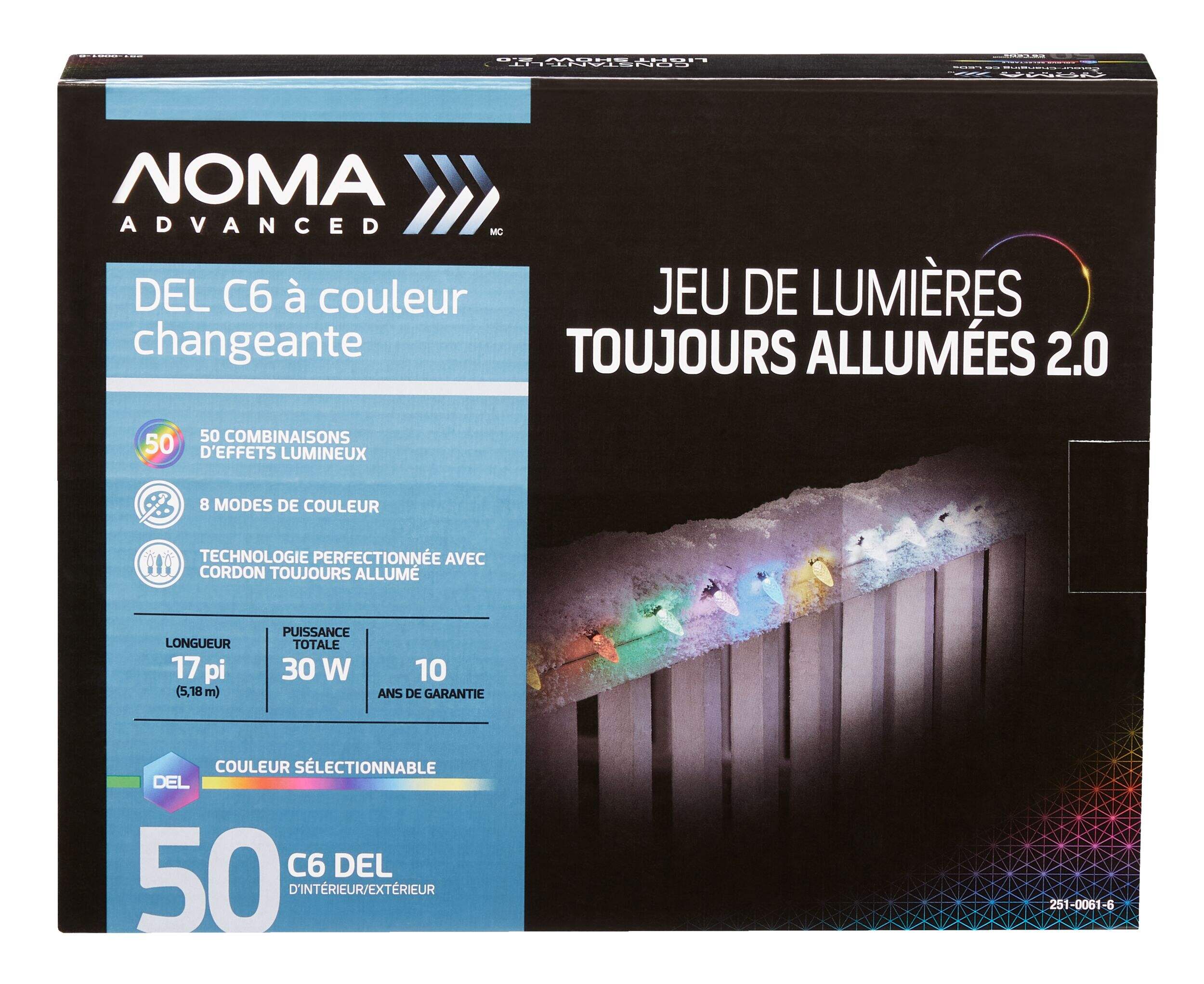 Les lumières à effets lumineux NOMA Advanced toujours allumées représentent la prochaine génération de lumières à effets lumineux NOMA Advanced 2.0. Grâce à la technologie à éclairage constant NOMA Advanced, ces lumières à DELC6 restent lumineuses même si une ampoule brûle ou se desserre et les douilles étanches empêchent l'humidité de se former à l'intérieur des ampoules. Avec 50 différentes combinaisons d'effets lumineux, y compris scintillement, luciole et couleurs alternées, ces lumières de Fêtes à télécommande vous permettent de créer un effet lumineux différent chaque jour de la saison.