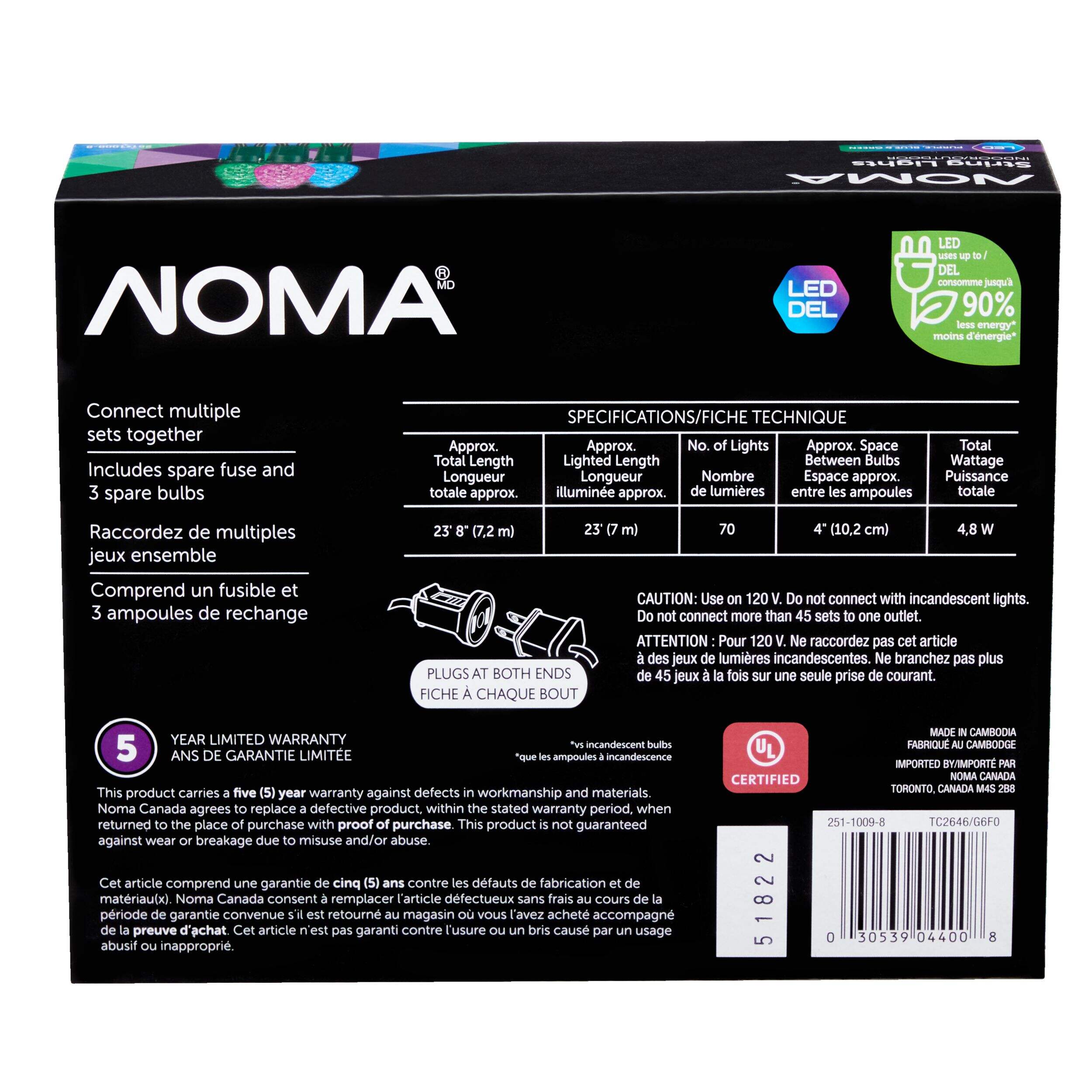 Doté de 70 lumières à DEL d'extérieur multicolores, cet ensemble de lumières à DEL C6 NOMA est un fantastique moyen d'illuminer votre maison ou votre cour pendant les Fêtes. Ces lumières à DEL C6 comptent 70 ampoules à DEL écoénergétiques conçues pour l'intérieur ou l'extérieur, ce qui vous permet d'illuminer facilement vos arbres, fenêtres, clôtures, allées ou toits. Pour plus de lumière et une esthétique grandiose, connectez de nombreux jeux pour un décor époustouflant.