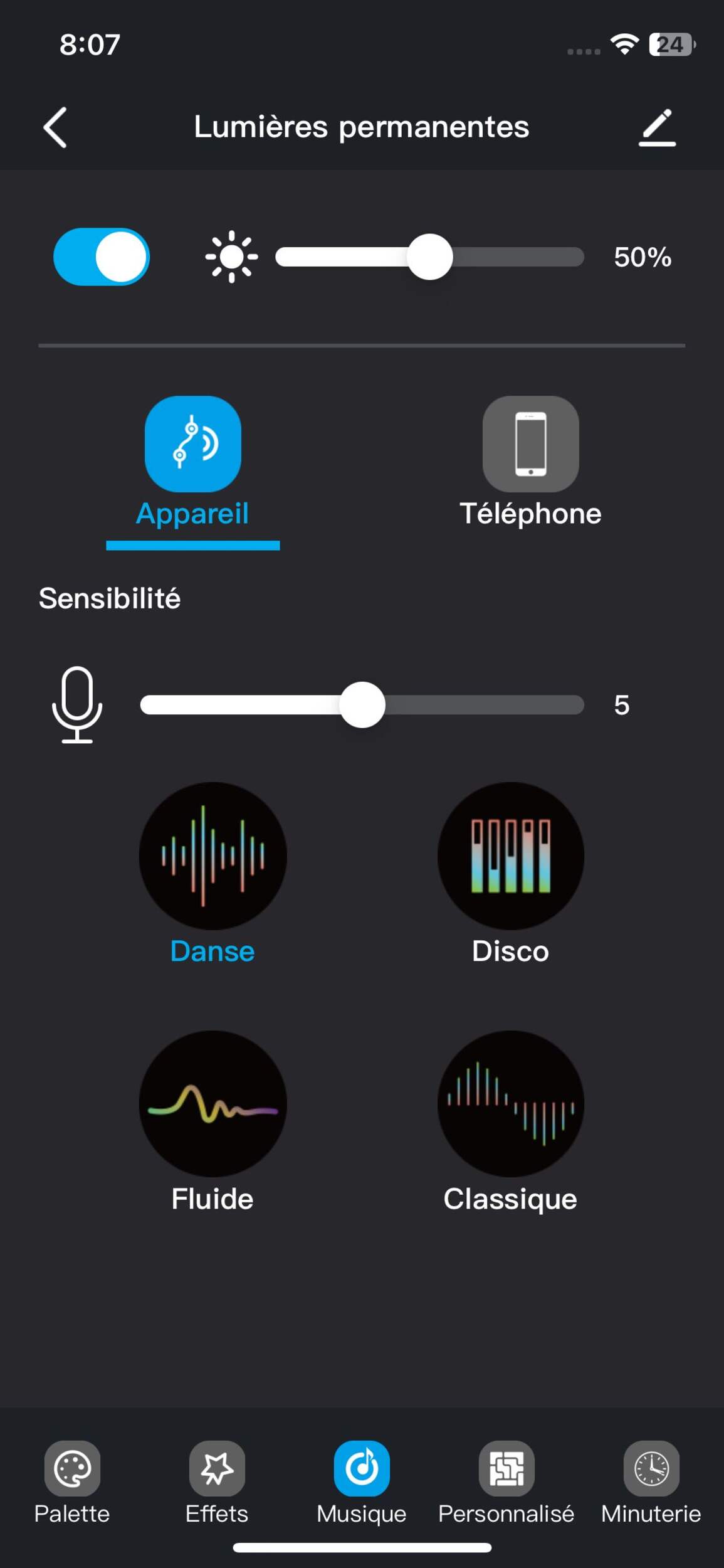 • Jeu de lumière dynamique synchronisé avec le rythme de la musique grâce au microphone intégré ou au microphone du téléphone de l'utilisateur