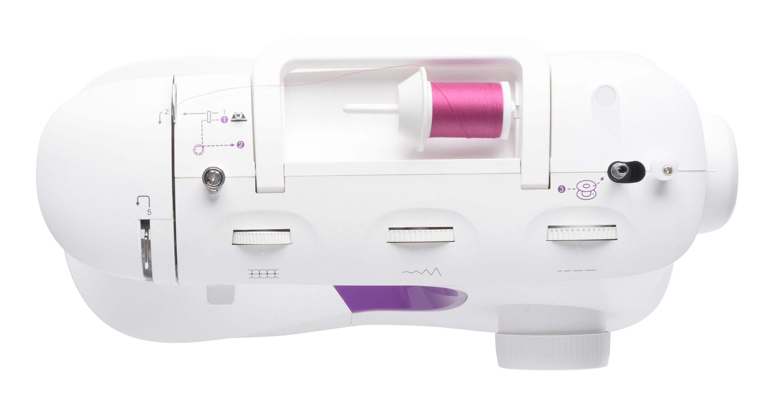 | Fonctionnalités avancées | Rangement des accessoires, Accoudoir libre, Cadre en métal robuste, Réglage inverse, Longueur de point réglable, Longueur de point réglable, Boutonnières en une étape, Enfileur automatique |
