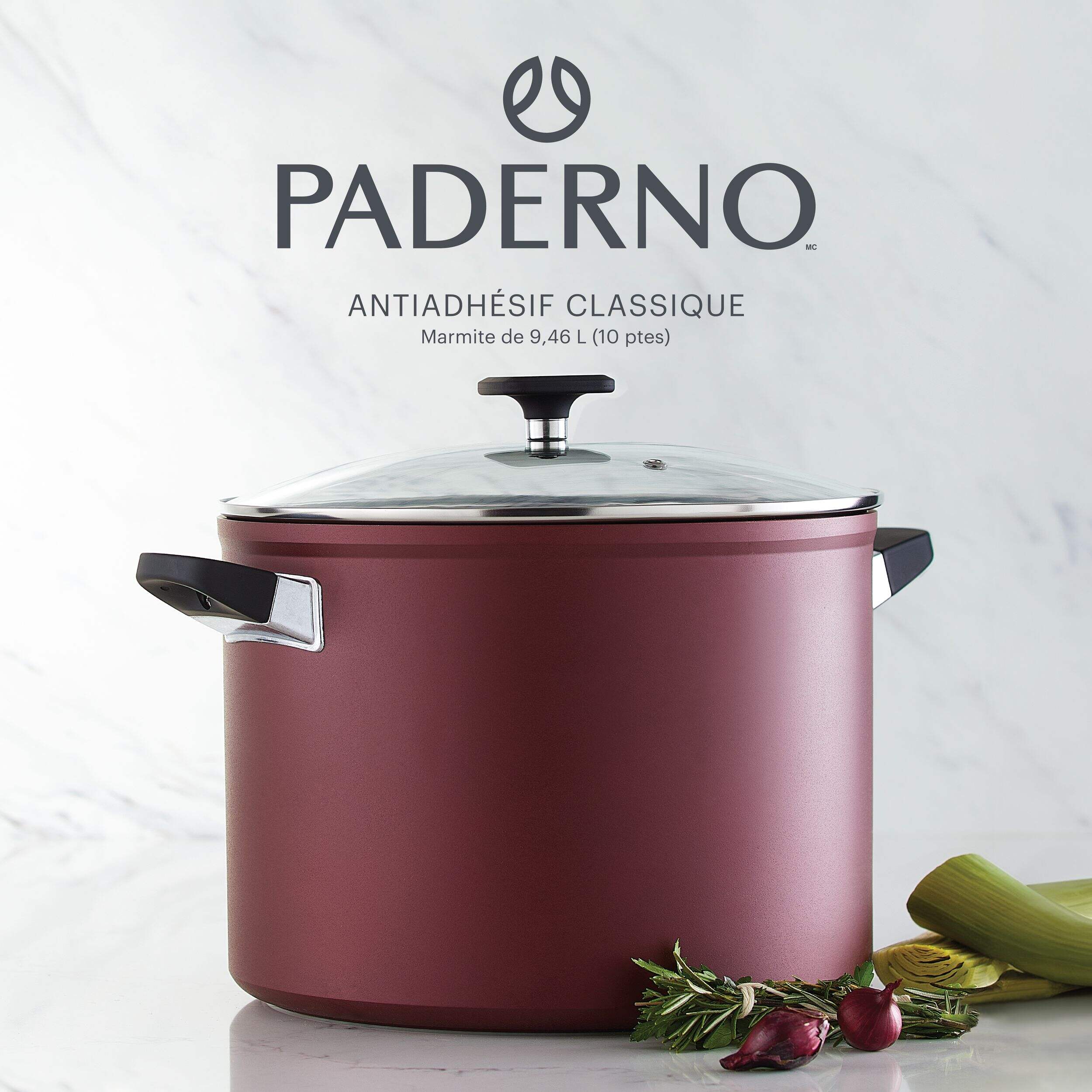Faites l'expérience de la joie de cuisiner grâce à la marmite antiadhésive classique PADERNO, 10 pintes. Cette marmite antiadhésive de 10 pintes est idéale pour préparer des soupes, des ragoûts et des sauces pour pâtes en famille. Son corps en aluminium robuste et son revêtement antiadhésif en quantanium — renforcé par du titane pour une plus grande durabilité — répartissent la chaleur de manière homogène et libèrent les aliments sans effort. Compatible avec toutes les cuisinières, y compris les cuisinières à induction, cette marmite est dotée de poignées froides qui vous permettent de passer de la cuisinière à la table sans perdre une seconde. Avec un fini antiadhésif sans PFOA et un extérieur résistant à la chaleur, cette marmite antiadhésive facilite la préparation de grandes quantités de nourriture. Pour une utilisation à long terme, laver à la main uniquement.