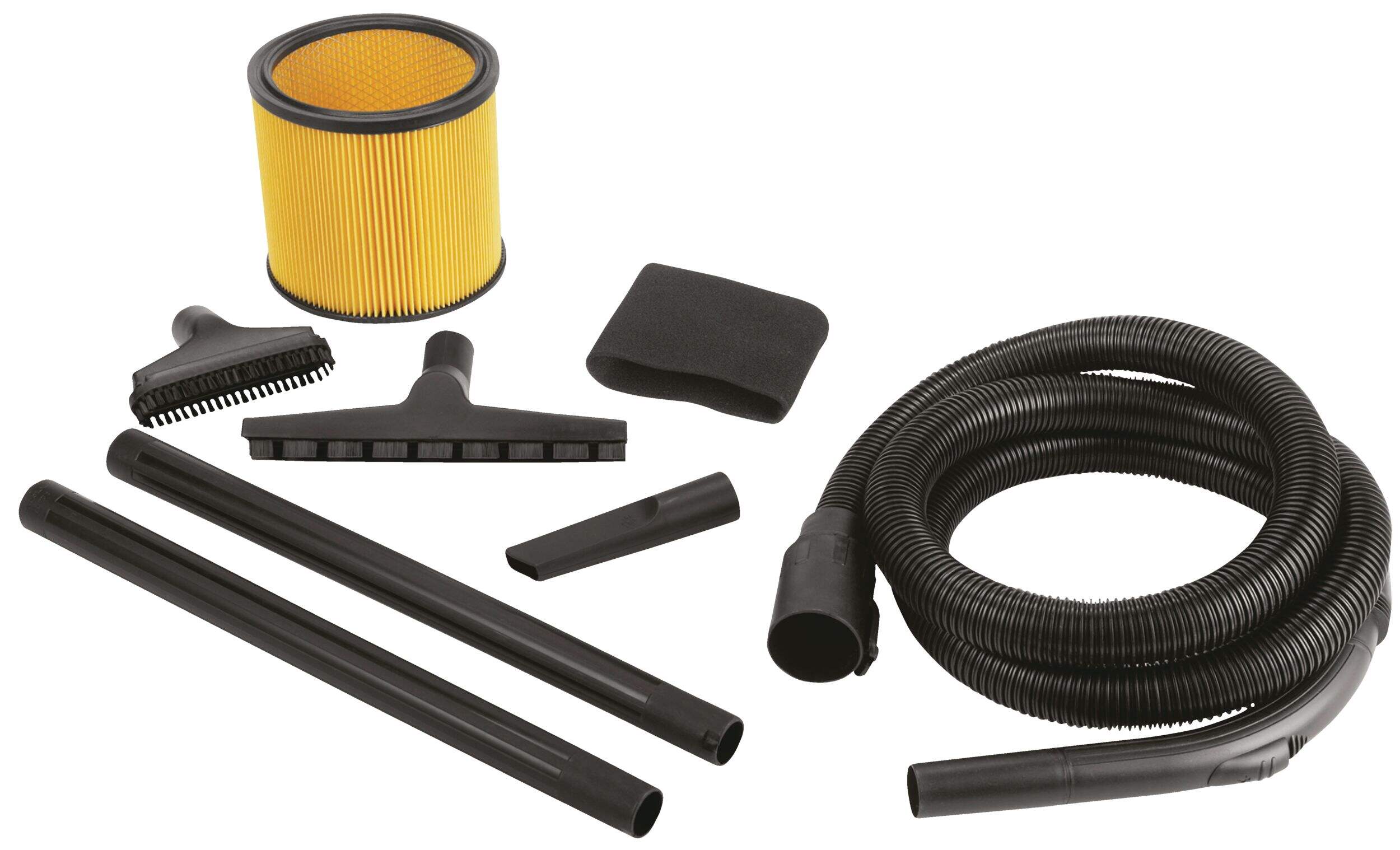 Comprend un boyau verrouillable d'un diamètre de 3,2 cm (1 1/4 po), 2 rallonges, un suceur polyvalent, un suceur plat, une brosse/raclette à plancher, un filtre à eau moussante et un filtre à cartouche