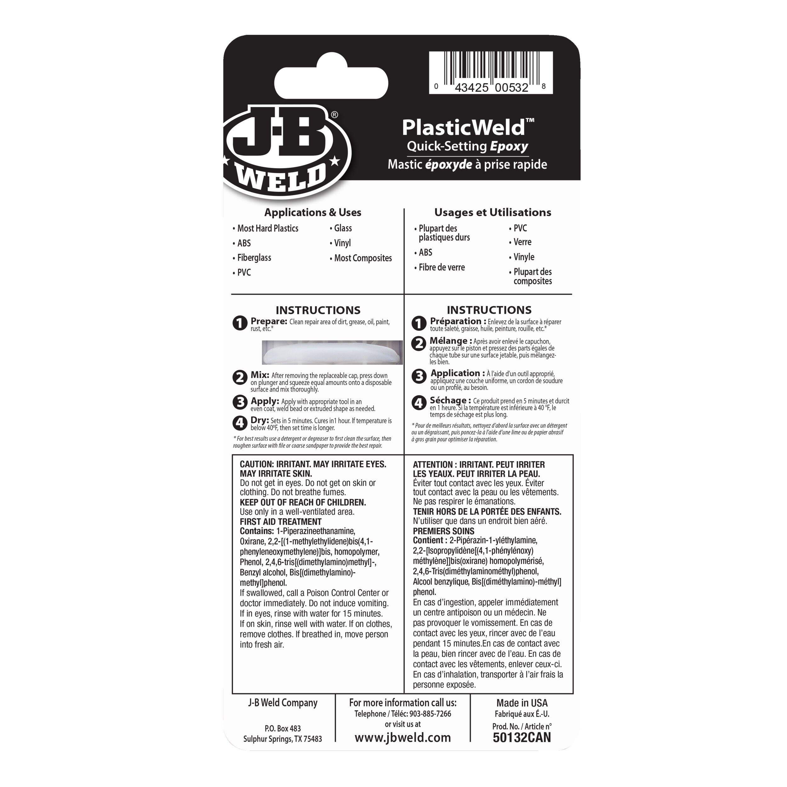 La seringue J-B Weld PlasticWeld est un système spécialement formulé de remplissage d'adhésif époxyde en deux parties qui permet des réparations solides et durables. PlasticWeld adhère à une variété de surfaces, comme le métal, les composites, la fibre de verre et autres. PlasticWeld sèche en 5 minutes à température ambiante et durcit complètement en 1 heure. Avec un taux de mélange de 1:1, PlasticWeld se combine pour une résistance à la traction de 3900 lb/po 2 et durcit en une couleur jaune translucide.