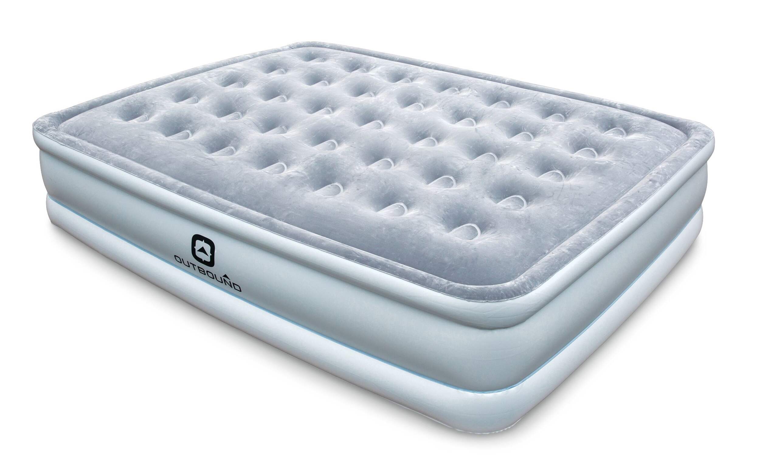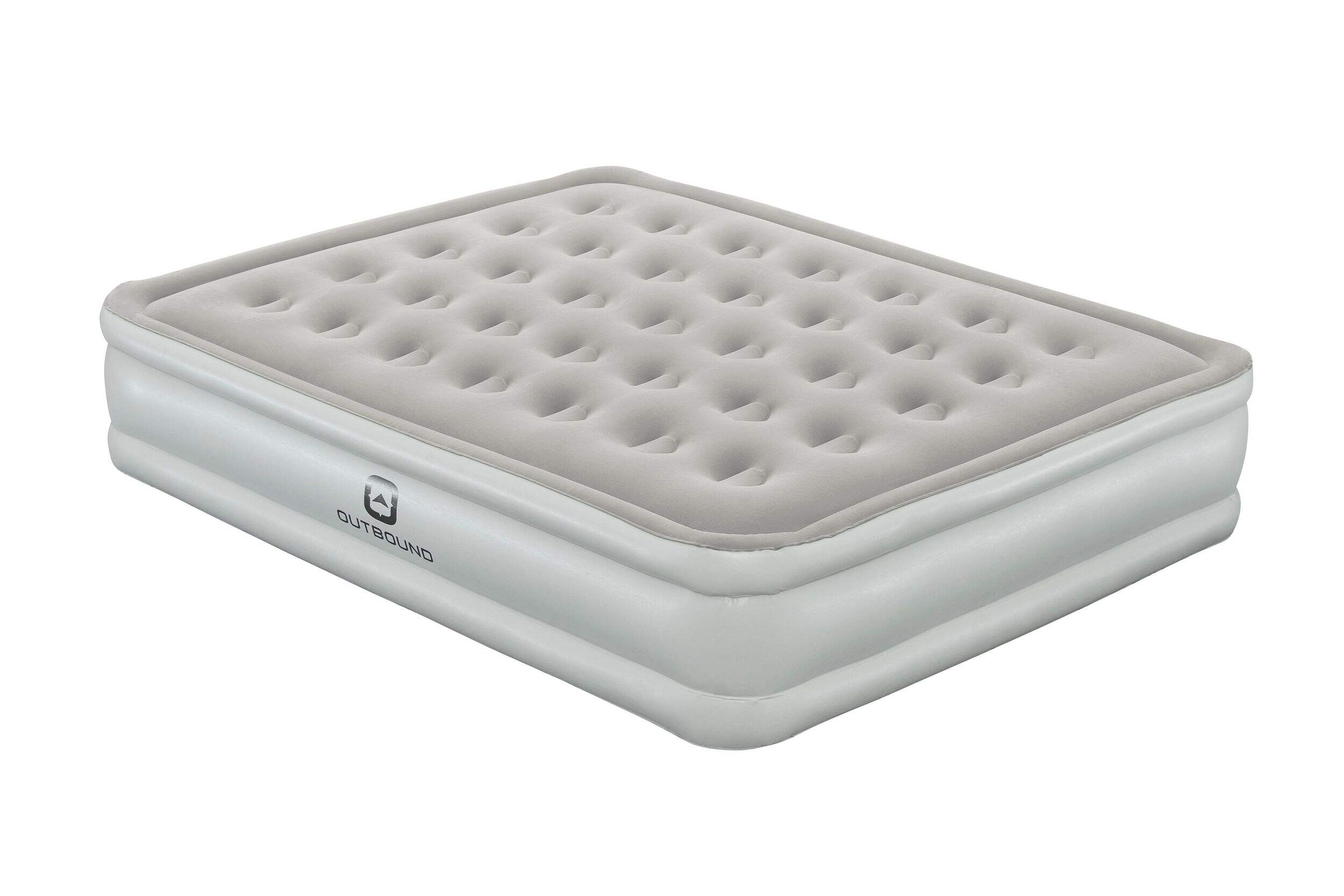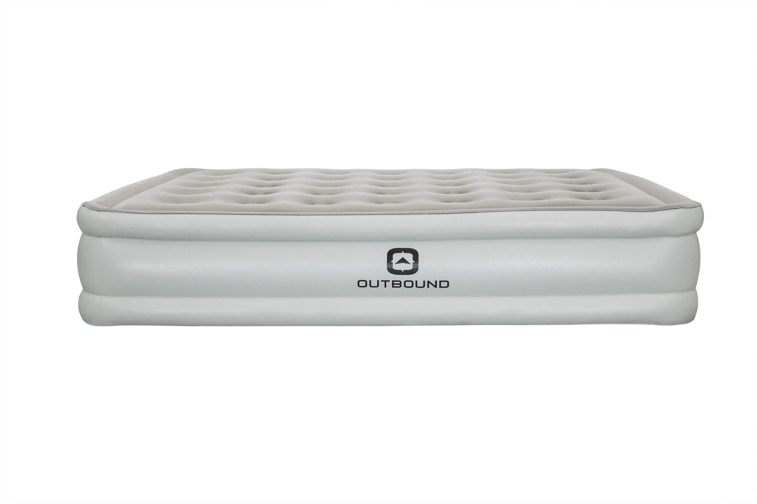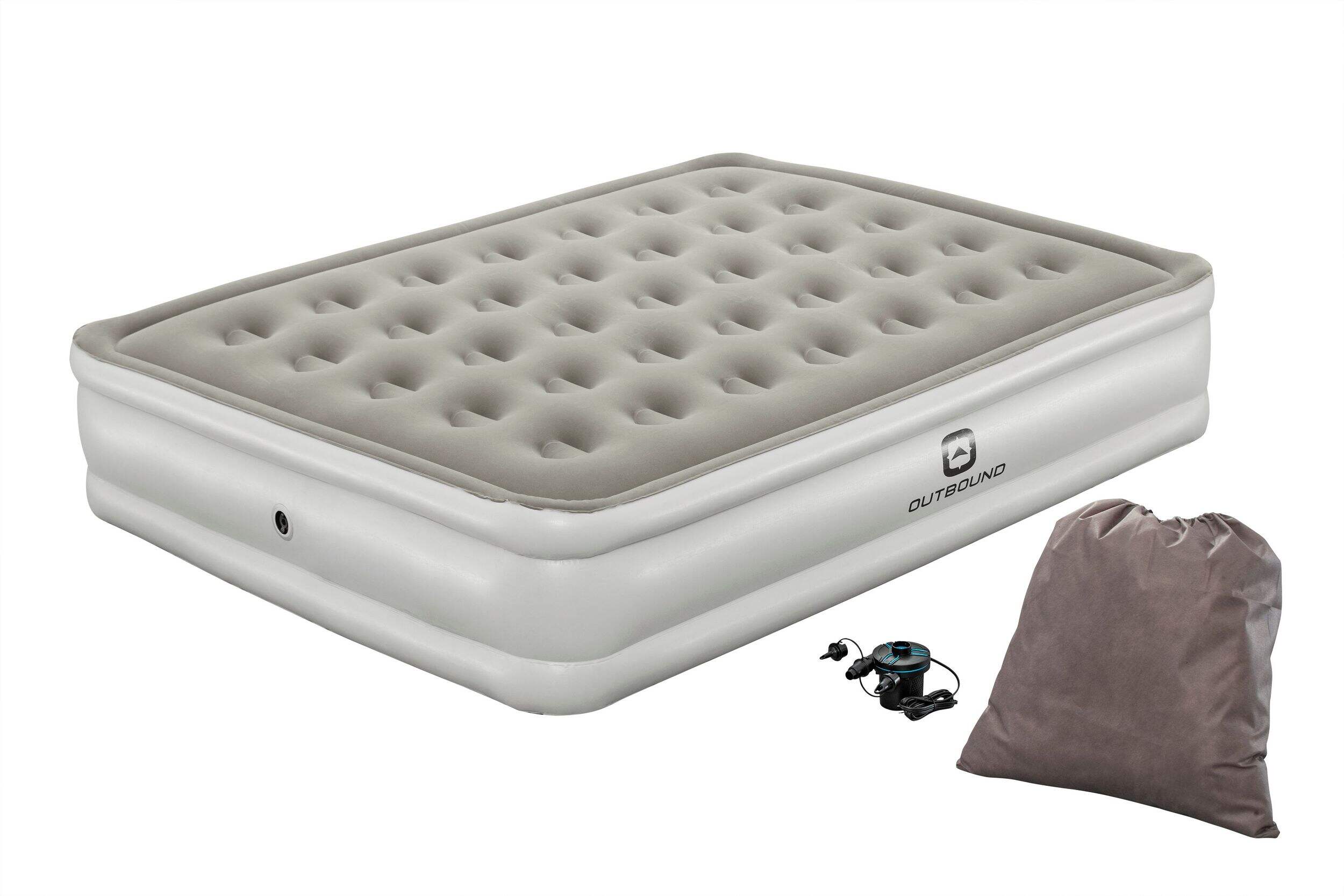 Le matelas pneumatique grand double hauteur Outbound offre un sommeil confortable et durable en camping. Sa surface floquée et sa construction en vinyle avec supports à ressort rendent le matelas pneumatique confortable. La pompe électrique de 110 V incluse permet un gonflage et un dégonflage rapides et faciles. Une pièce de réparation robuste et un sac de transport facilitent le rangement et le transport. Étirements normaux et pression qui diminuent après les premières utilisations. Ajoutez simplement de l'air pour atteindre la fermeté souhaitée et la pression se stabilisera après plusieurs utilisations.