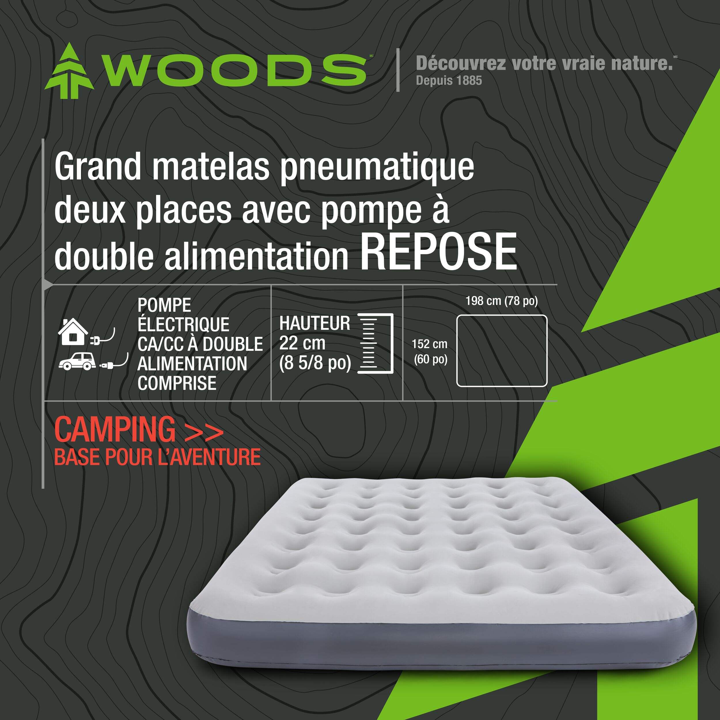 Le grand matelas gonflable hauteur simple Woods est une solution pratique et confortable pour dormir en camping, en voiture ou à la maison. Doté d'une pompe 2-en-1 compatible avec les prises C. A. et C. C., ce matelas pneumatique se gonfle et se dégonfle rapidement et facilement. Le matériau durable et résistant aux perforations assure une longue durée de vie, tandis que le grand lit offre amplement d'espace pour 2 adultes. Que vous soyez en plein air ou que vous receviez des invités, le matelas pneumatique gonflable Woods offre un confort et une stabilité fiables pour une nuit de sommeil reposante.