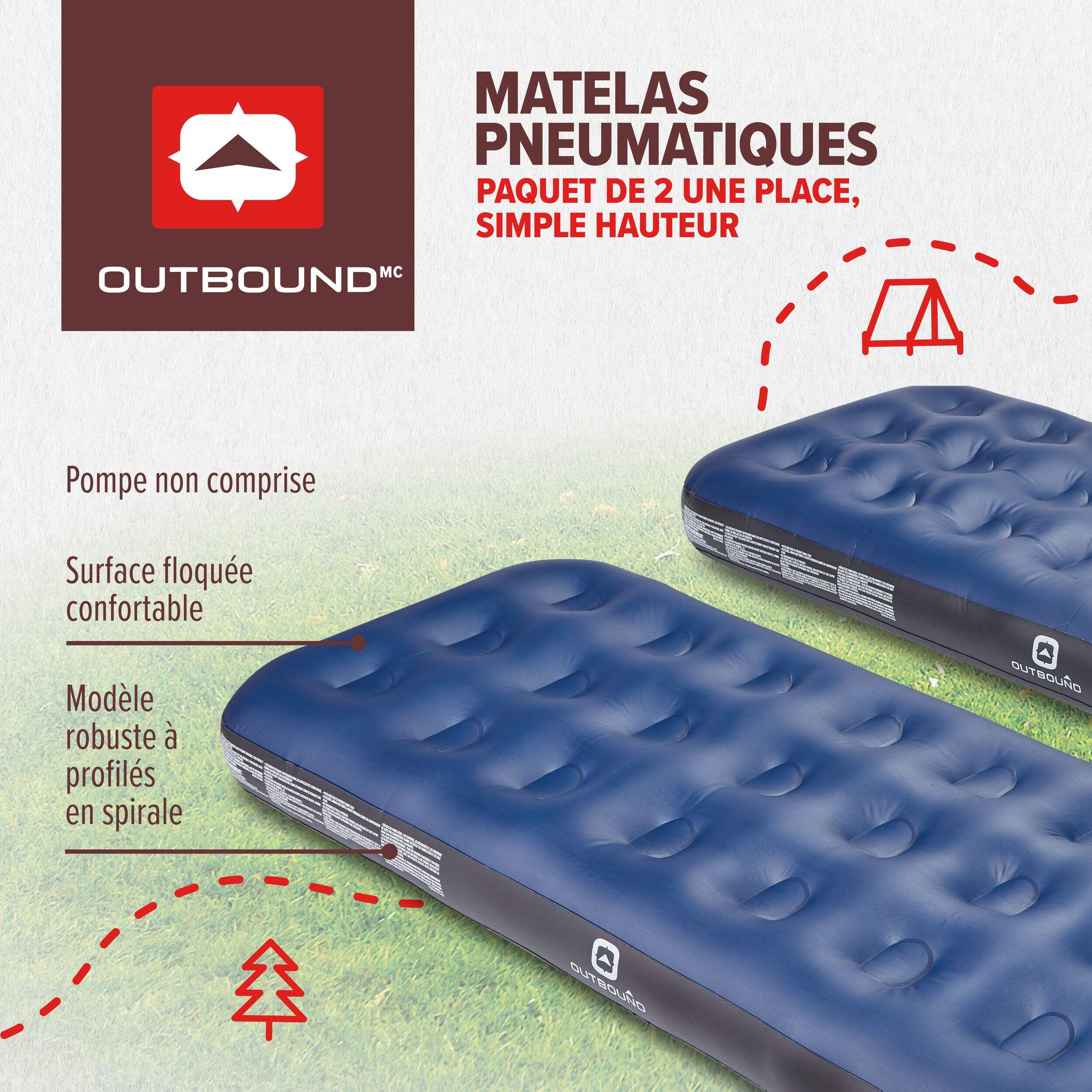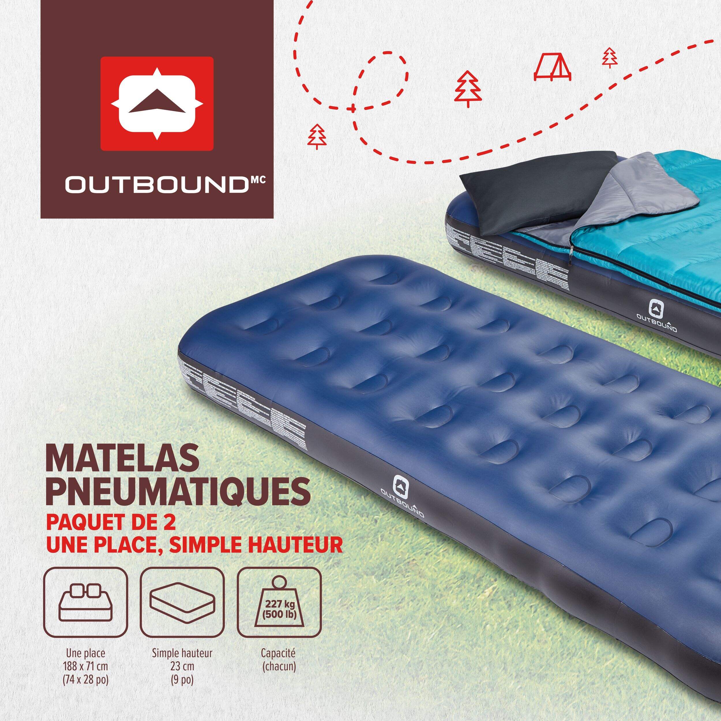 Les matelas pneumatiques simples hauteur simple Outbound en paquet de 2 offrent une solution confortable et pratique pour dormir en camping, en voyage ou pour accueillir des invités. Dotés d'une structure robuste à boudin en vinyle, ces matelas sont conçus pour durer longtemps. Chaque matelas se gonfle rapidement, atteignant une fermeté complète en seulement 3 à 5 minutes, avec une capacité maximale de 500 lb par matelas.