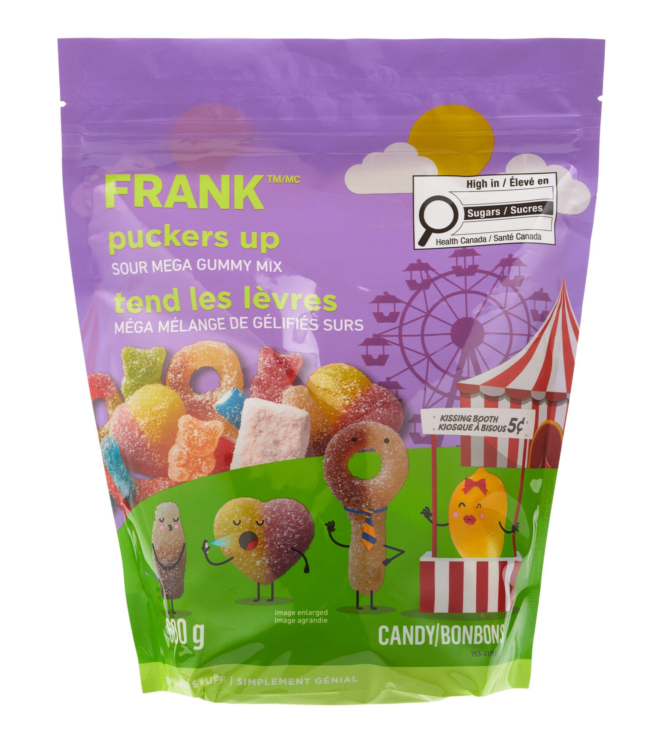 Mélange de bonbons gélifiés surs FRANK dans un sac rescellable pour plus de fraîcheur