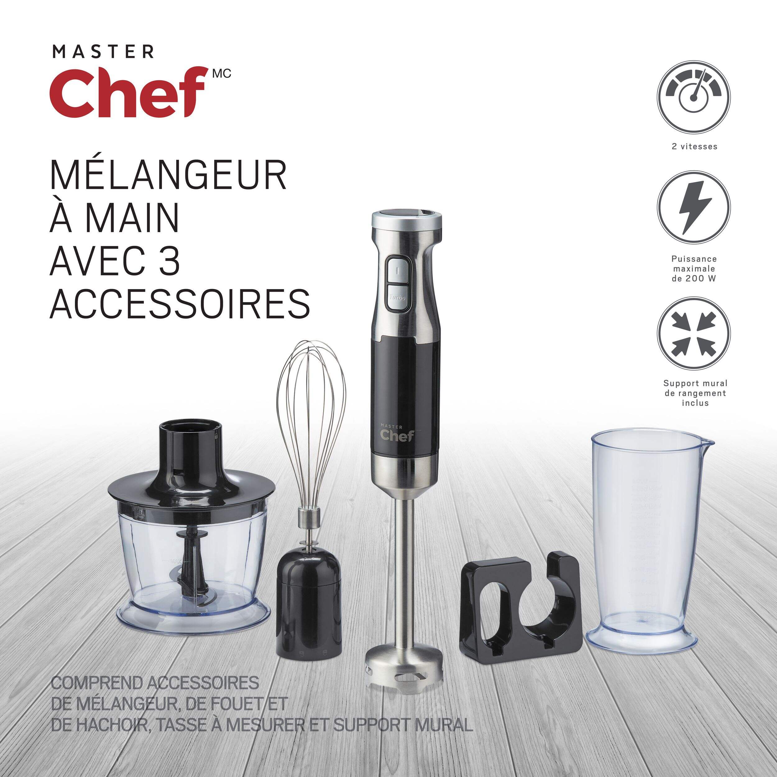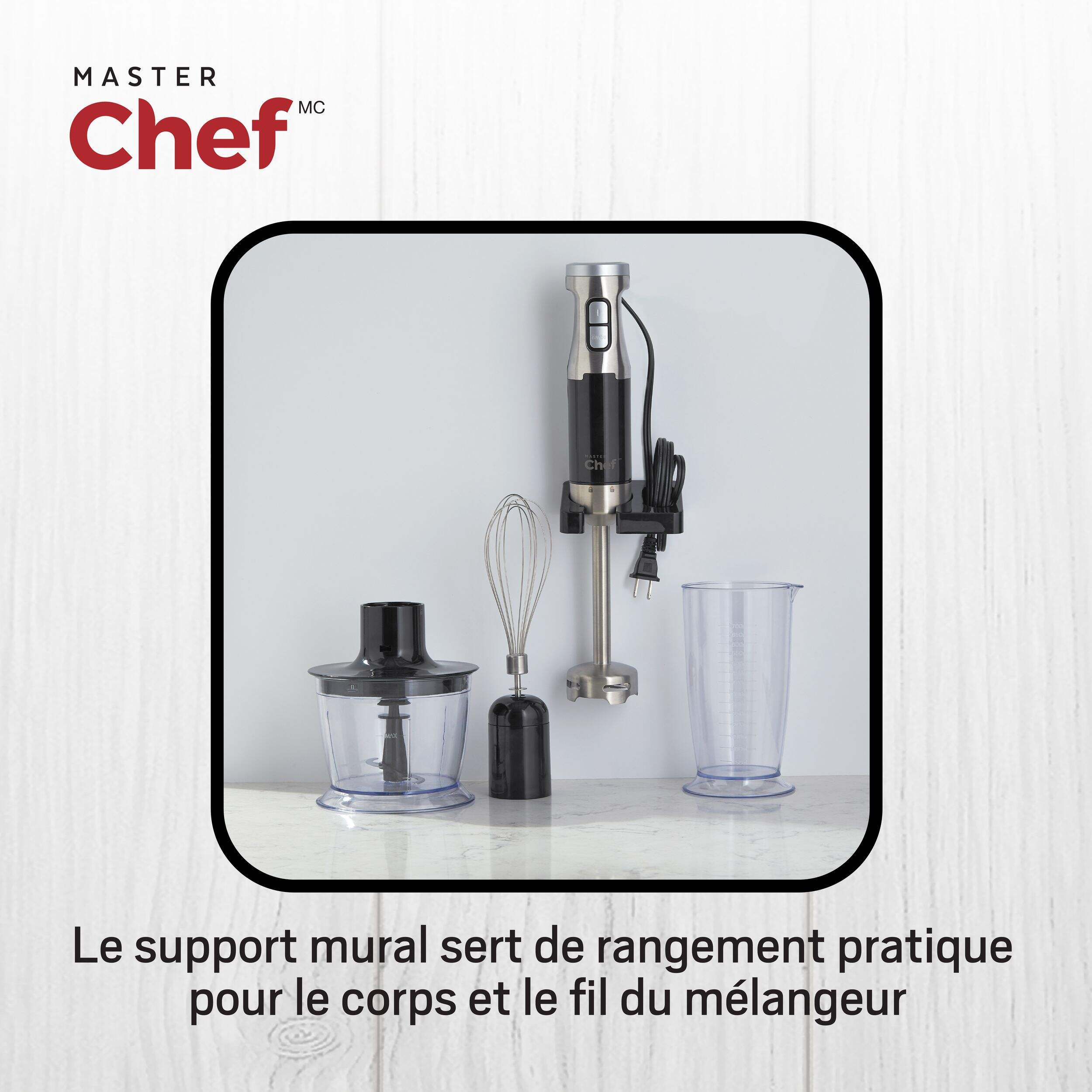 Batteur à main avec fil MASTER Chef vous permettant de préparer facilement des boissons frappées, des soupes, des sauces et plus encore. Doté de 2 réglages de vitesse et d'une vitesse variable en continu, il est facile de mélanger, de moudre et de hacher des ingrédients. De plus, ce batteur à main à immersion est fourni avec un fouet, un hachoir et un bol pour robot culinaire pour faciliter la préparation et compléter une gamme de recettes sucrées et salées. Support mural également inclus avec ce batteur à main avec fouet pour garder vos armoires de cuisine, comptoirs et tiroirs propres et sans encombrement. Modèle en acier inoxydable qui offre une apparence élégante et tige amovible qui facilite le nettoyage de ce batteur à main après votre repas. Compact et très polyvalent, ce batteur à main à immersion est un excellent ajout à n'importe quelle cuisine.