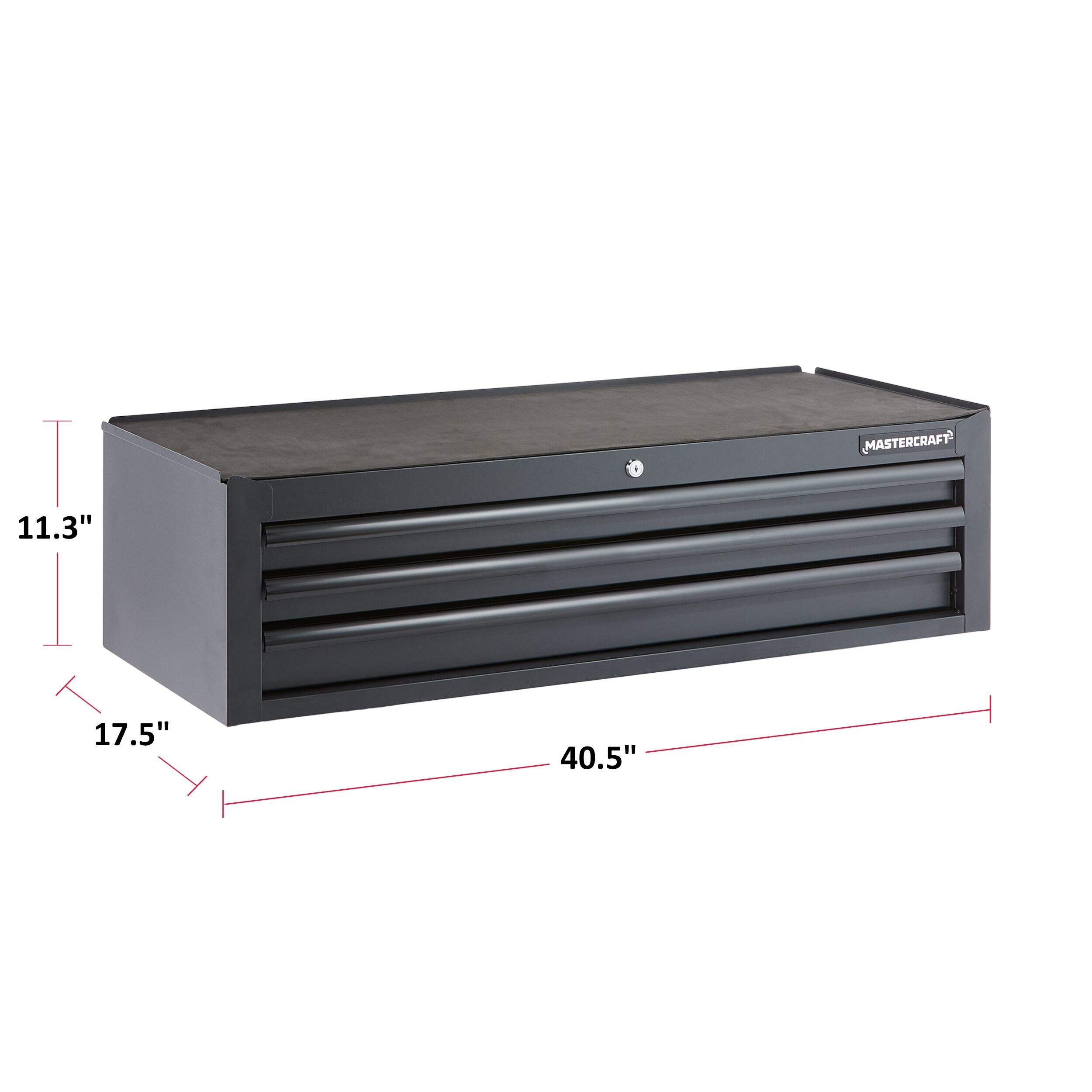 L'armoire de rangement pour outils au milieu de la commode Mastercraft de 104,14 cm (41 po) est dotée d'un fini peint par poudrage qui offre une protection exceptionnelle contre les bosses, les rayures et la corrosion. Les tiroirs de cette armoire Mastercraft sont dotés de glissières à roulement à billes avec une capacité de poids de 35 kg (77 lb) par tiroir pour un fonctionnement fluide et une utilisation intensive. Les jambes de suspension à gaz aident à soulever facilement le couvercle du coffre à outils, tandis que les doublures de tiroir et de caisse en EVA durable protègent l'intérieur. Cette armoire de rangement est entièrement assemblée, ne nécessite aucun outil et comprend un verrou plat avec une clé pour plus de sécurité.