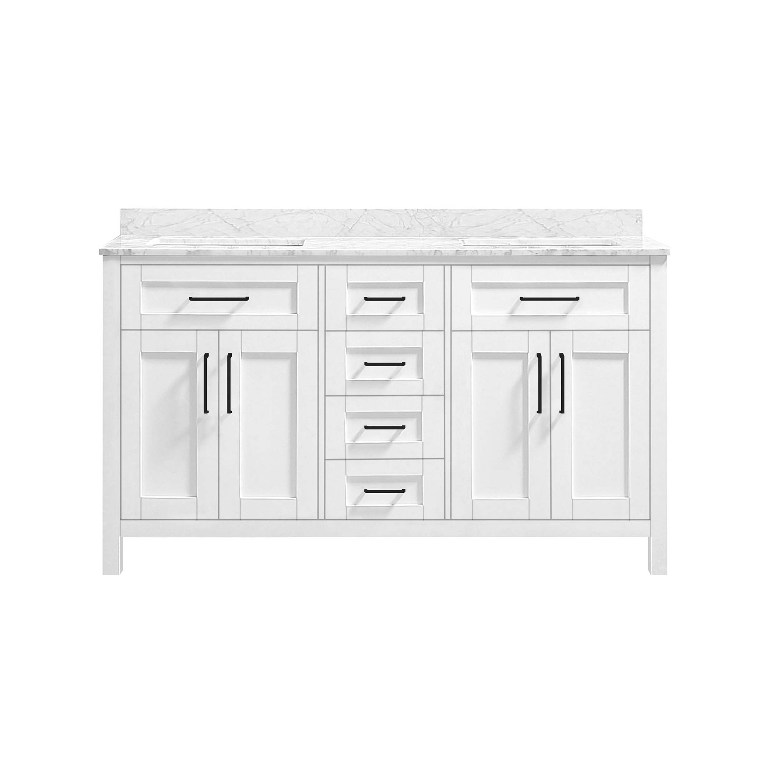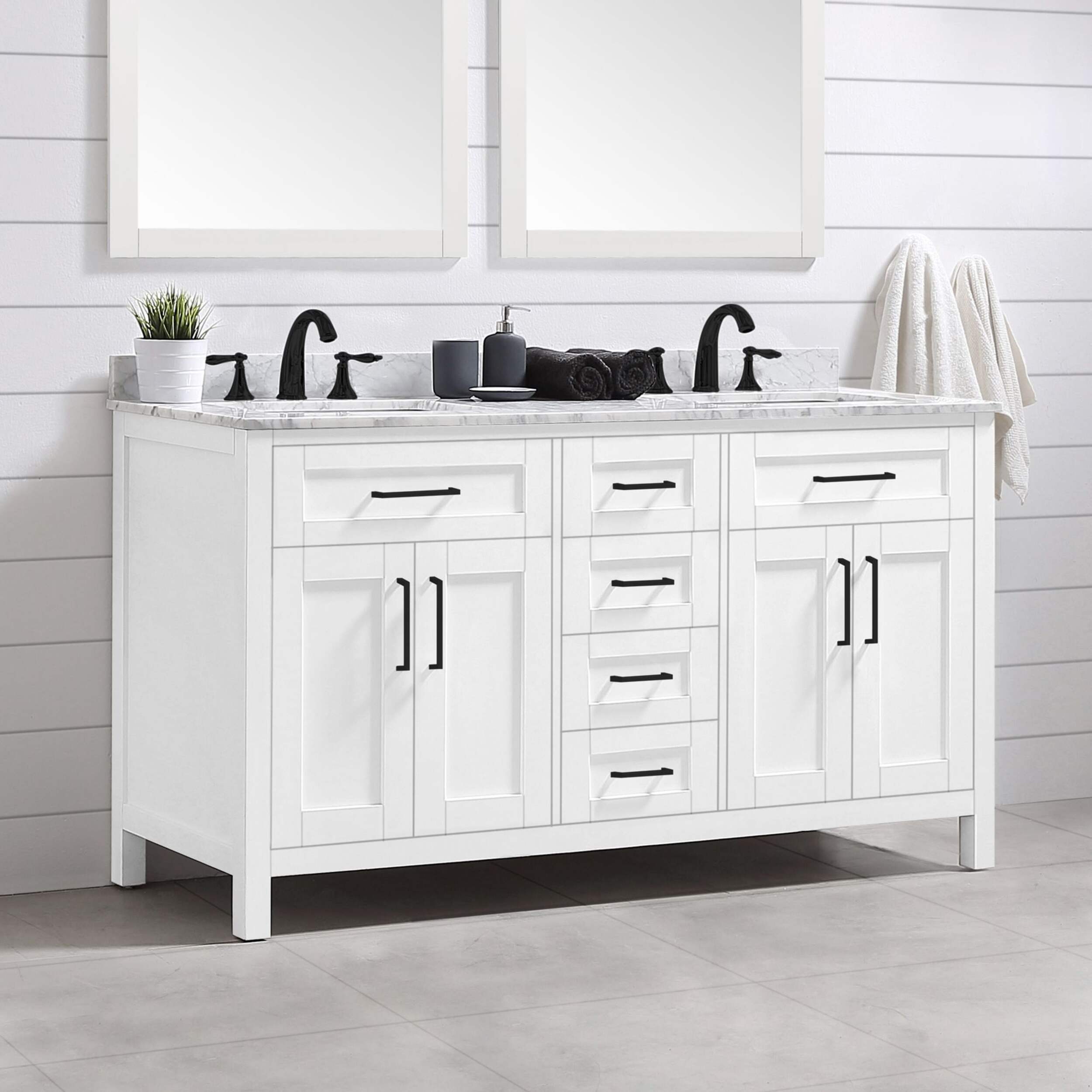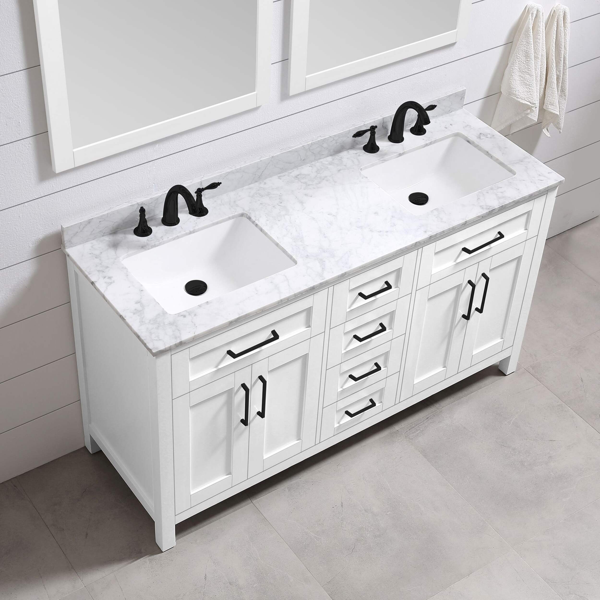 Meuble-lavabo double OVE Decors Tahoe doté d'un dessus en marbre blanc Carrara et d'un magnifique lavabo sous comptoir en céramique, ce qui le rend à la fois fonctionnel et magnifique