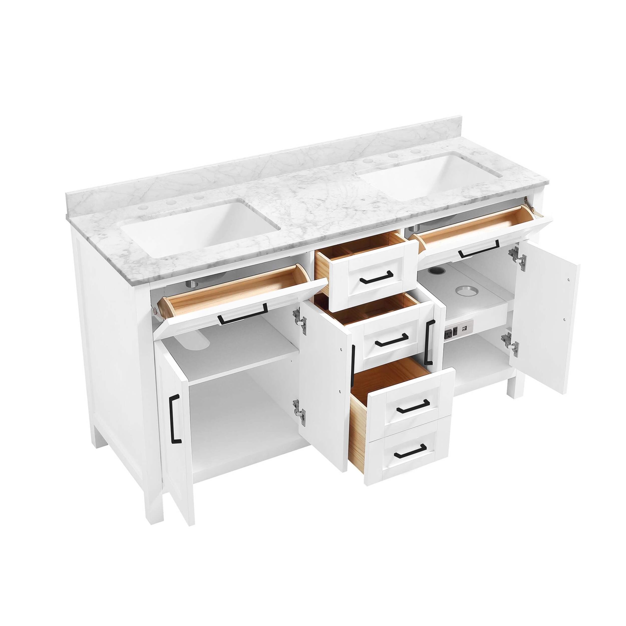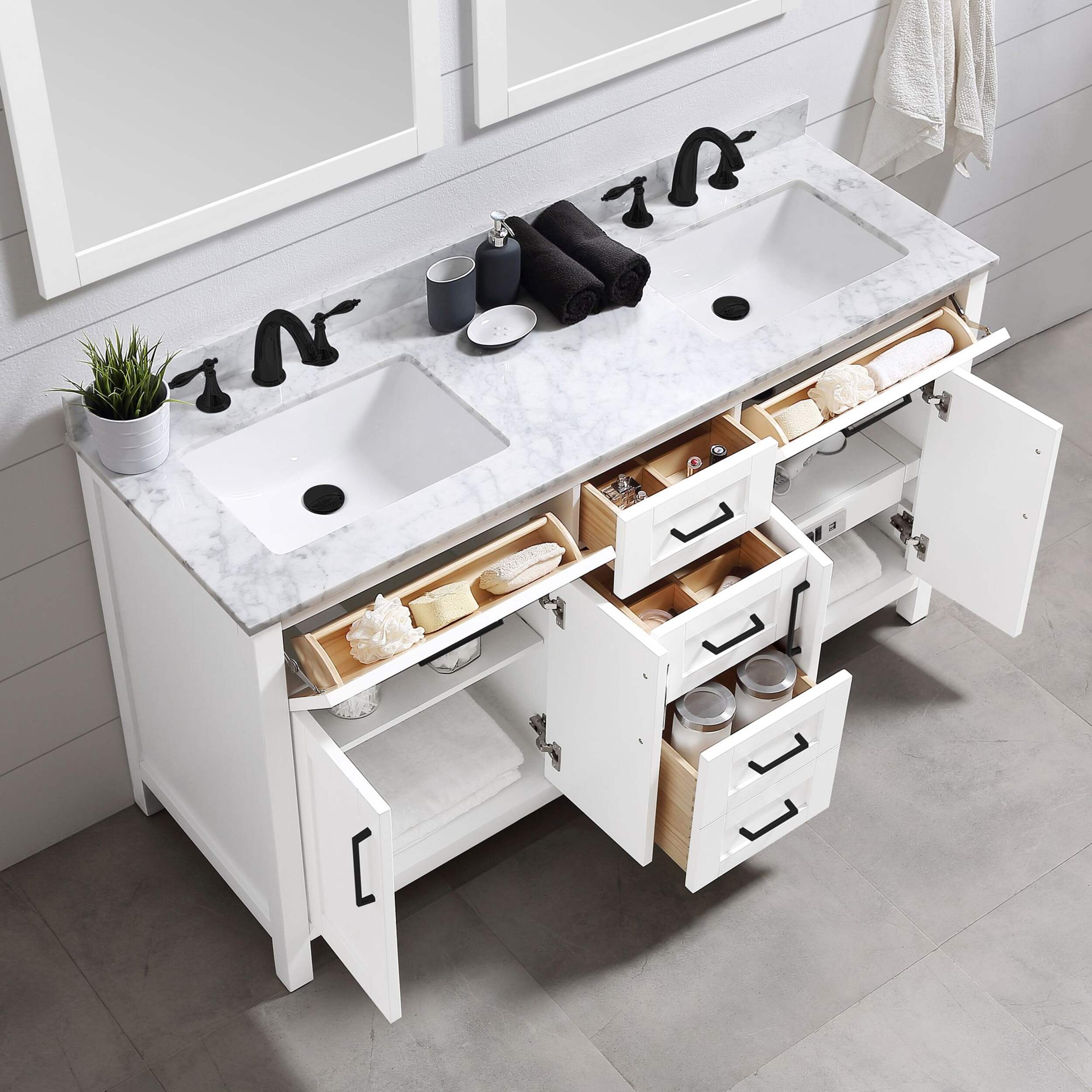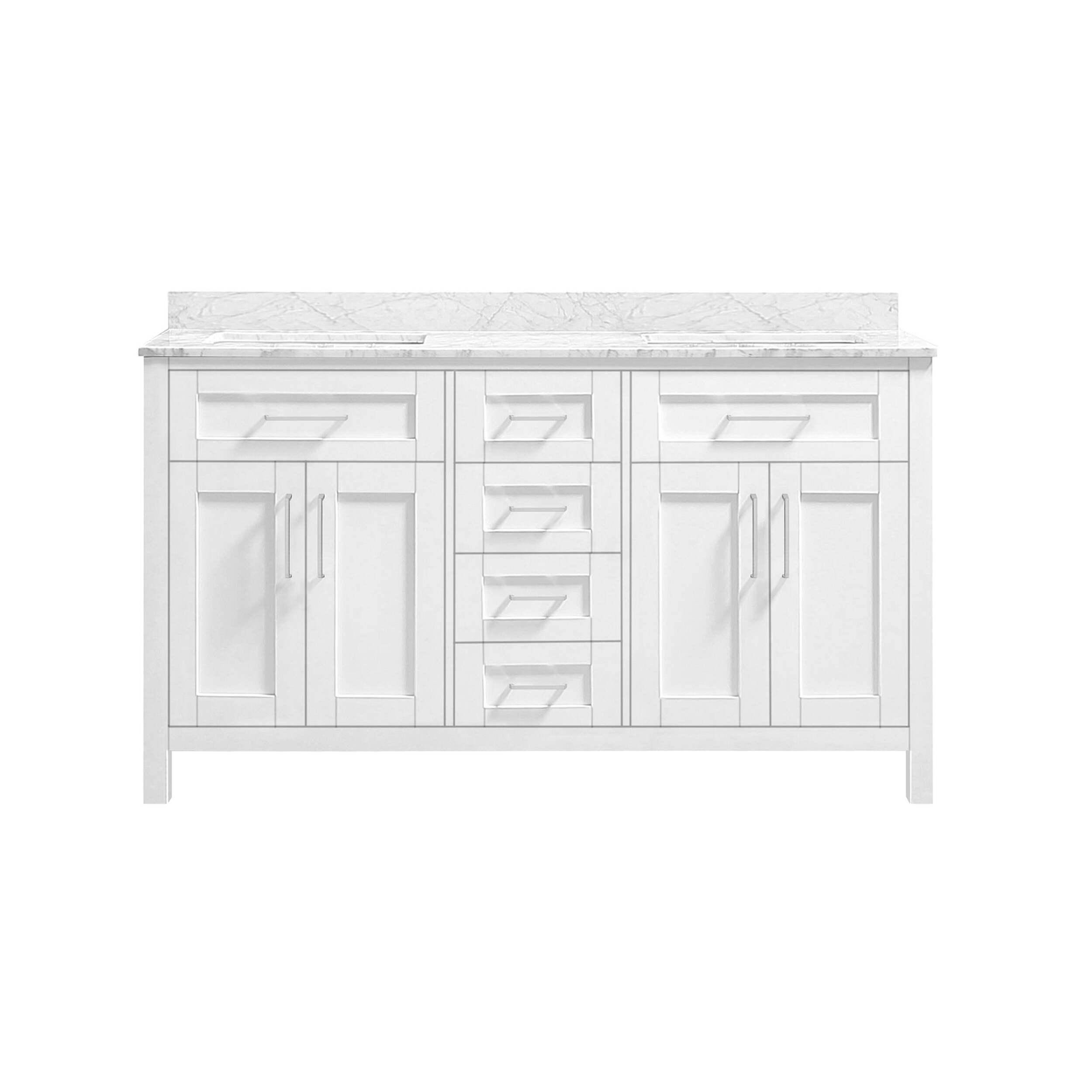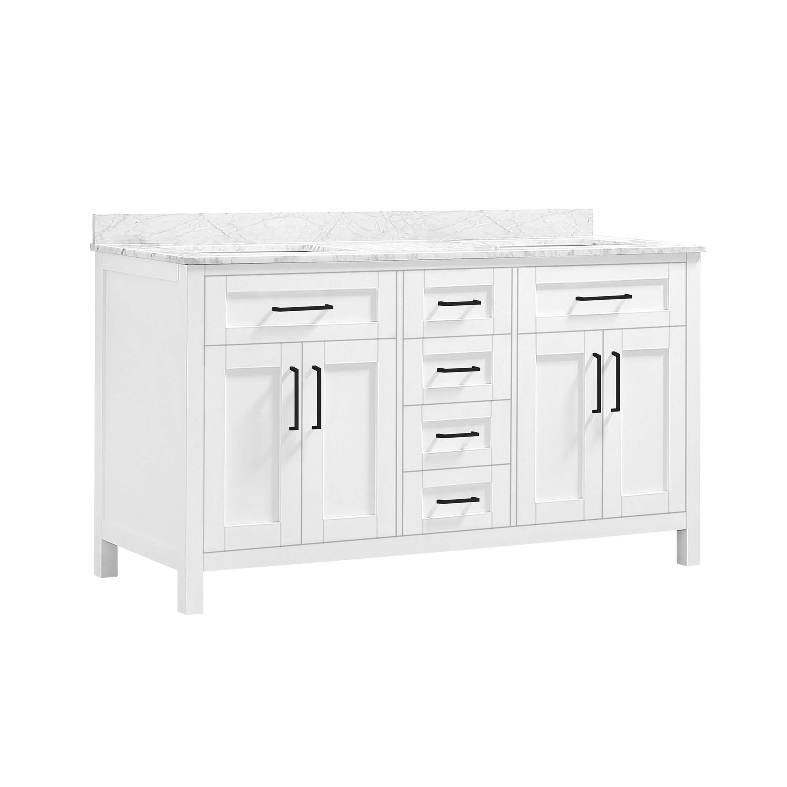 Meuble-lavabo double OVE Decors Tahoe doté d'un dessus en marbre blanc Carrara et d'un magnifique lavabo sous comptoir en céramique, ce qui le rend à la fois fonctionnel et magnifique