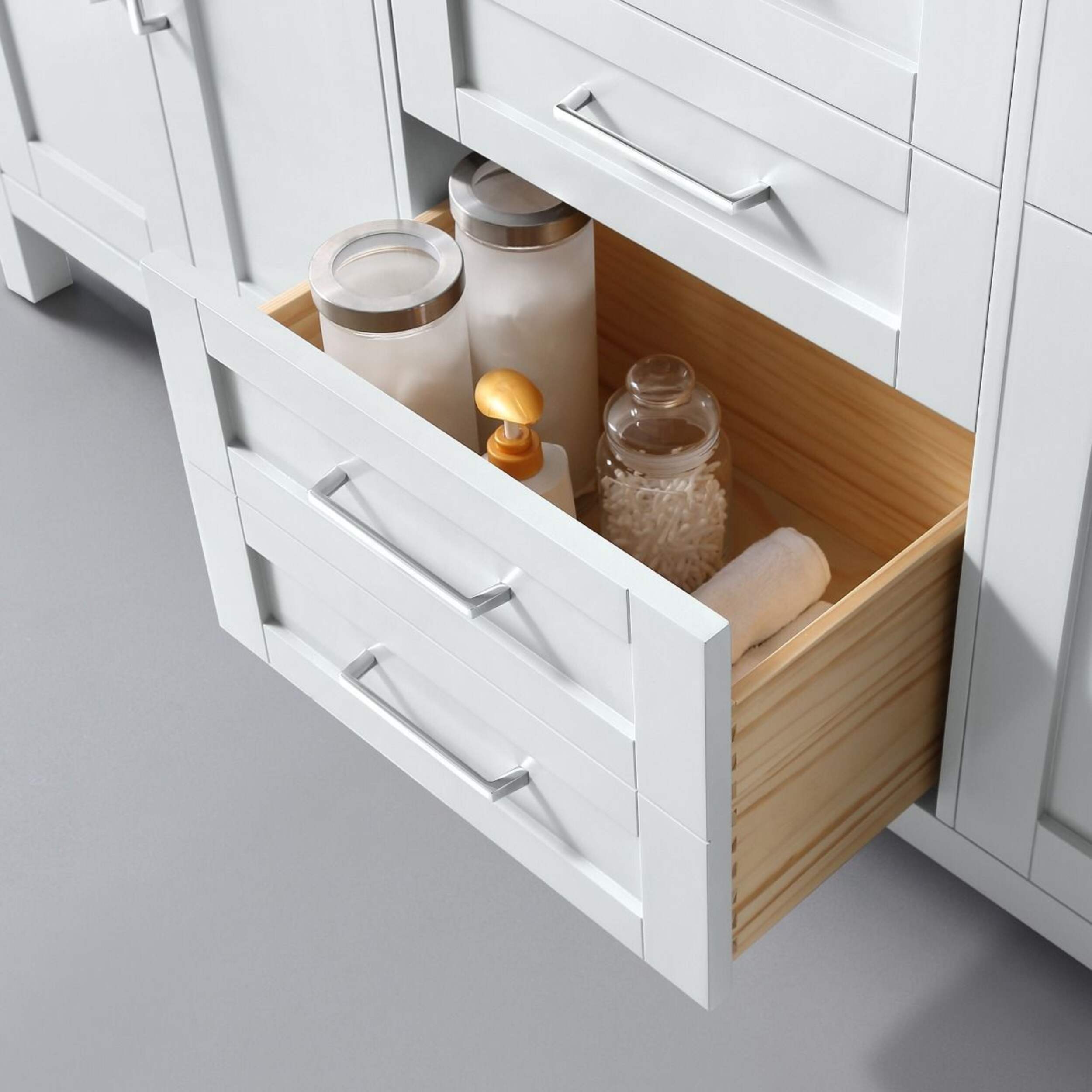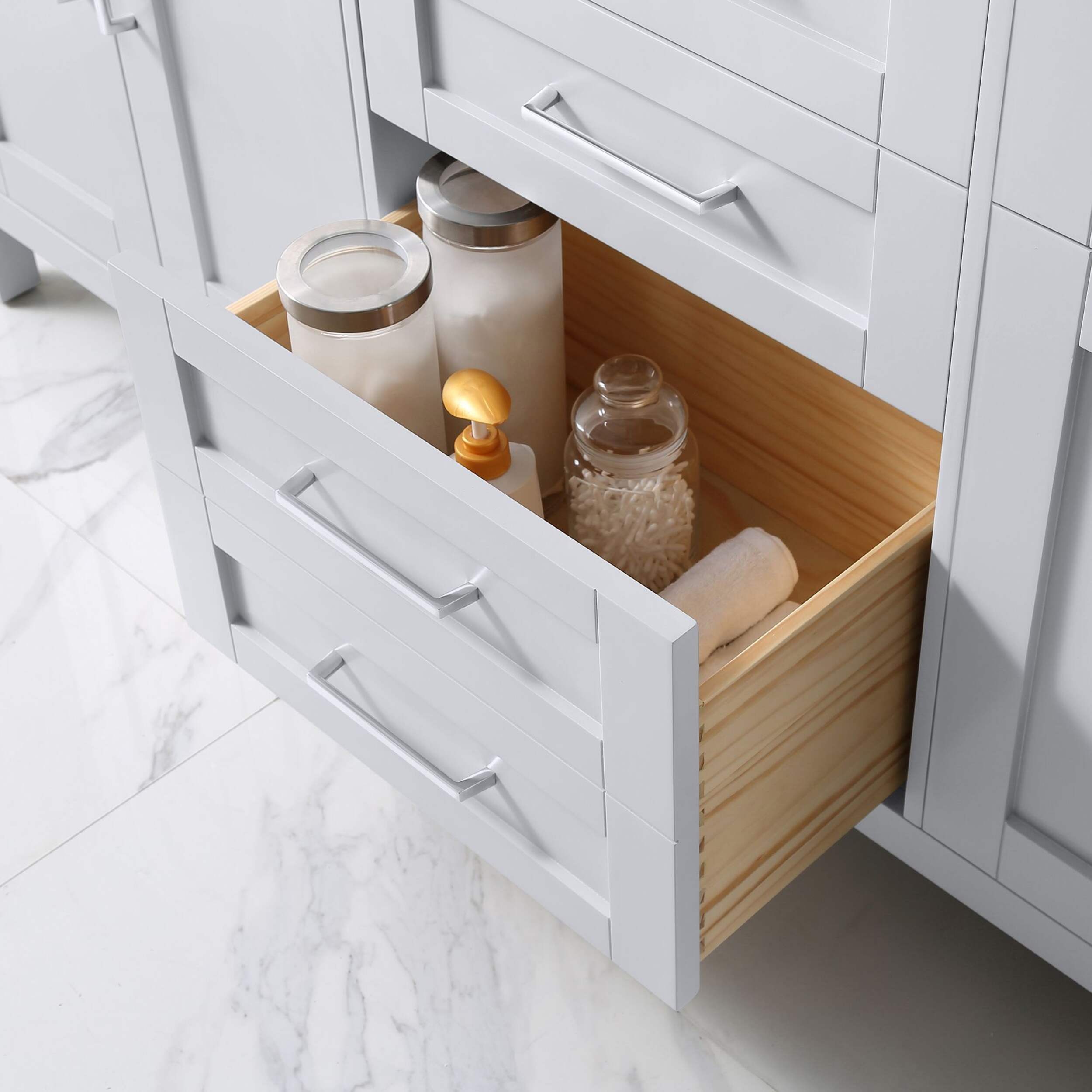 I absolutely love my gorgeous and functional new vanity! The midnight blue color is gorgeous and goes so well with the sparkling white top. The top center tilt drawer and the top left and right drawers with their modular dividers are absolutely ingenious. The other shelves and drawers are deep and can fit everything. I love the soft close drawers and doors and I love that any smudges on the surface of the vanity wipe away easily with a microfiber cloth. This is not only the nicest vanity I have ever owned--I think it is the nicest vanity I have ever seen!
