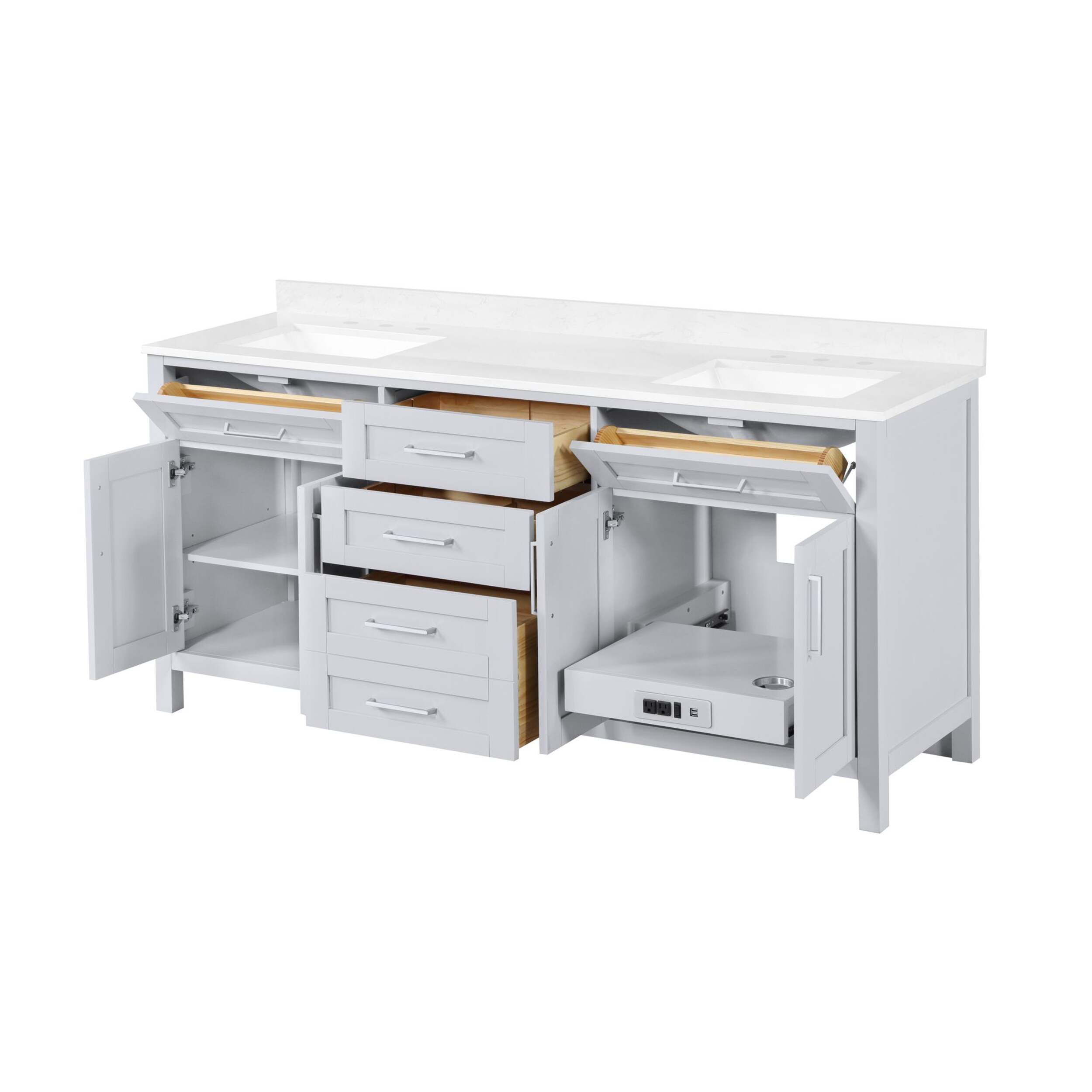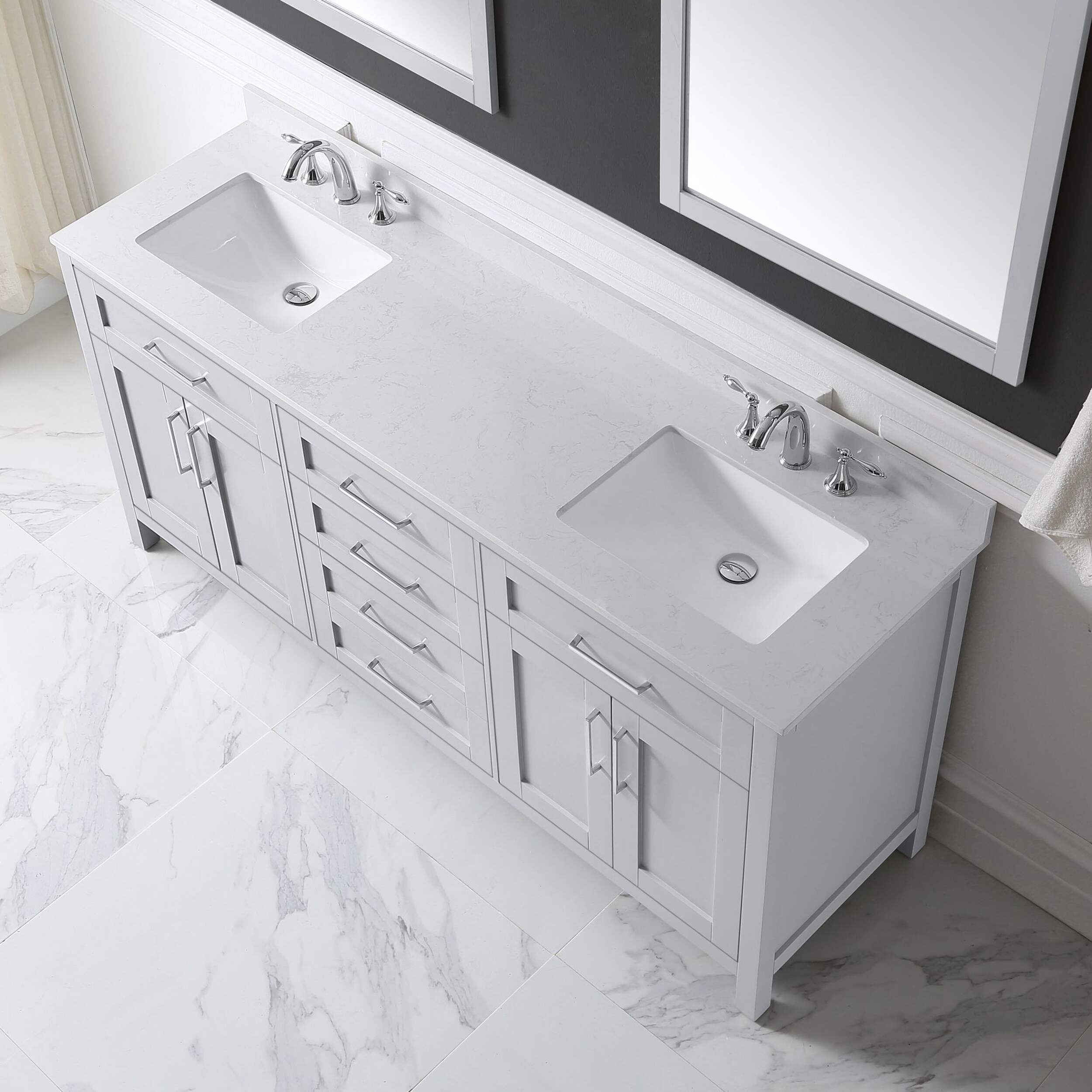 Le meuble-lavabo Tahoe de 72 po est l'incarnation même de la simplicité sophistiquée. Ses tiroirs sont munis d'organisateurs intégrés et il dispose d'un tiroir avant inclinable pour plus de commodité. La gamme Tahoe est disponible en fini blanc pur et gris tourterelle et comprend des charnières à fermeture douce, ainsi que des poignées chromées épurées, ce qui en fait un bel ajout pour toutes les salles de bain de votre maison. Dessus blanc en pierre d'ingénierie et magnifiques lavabos sous comptoir en céramique intégrés, pour un meuble-lavabo Tahoe à la fois fonctionnel et magnifique