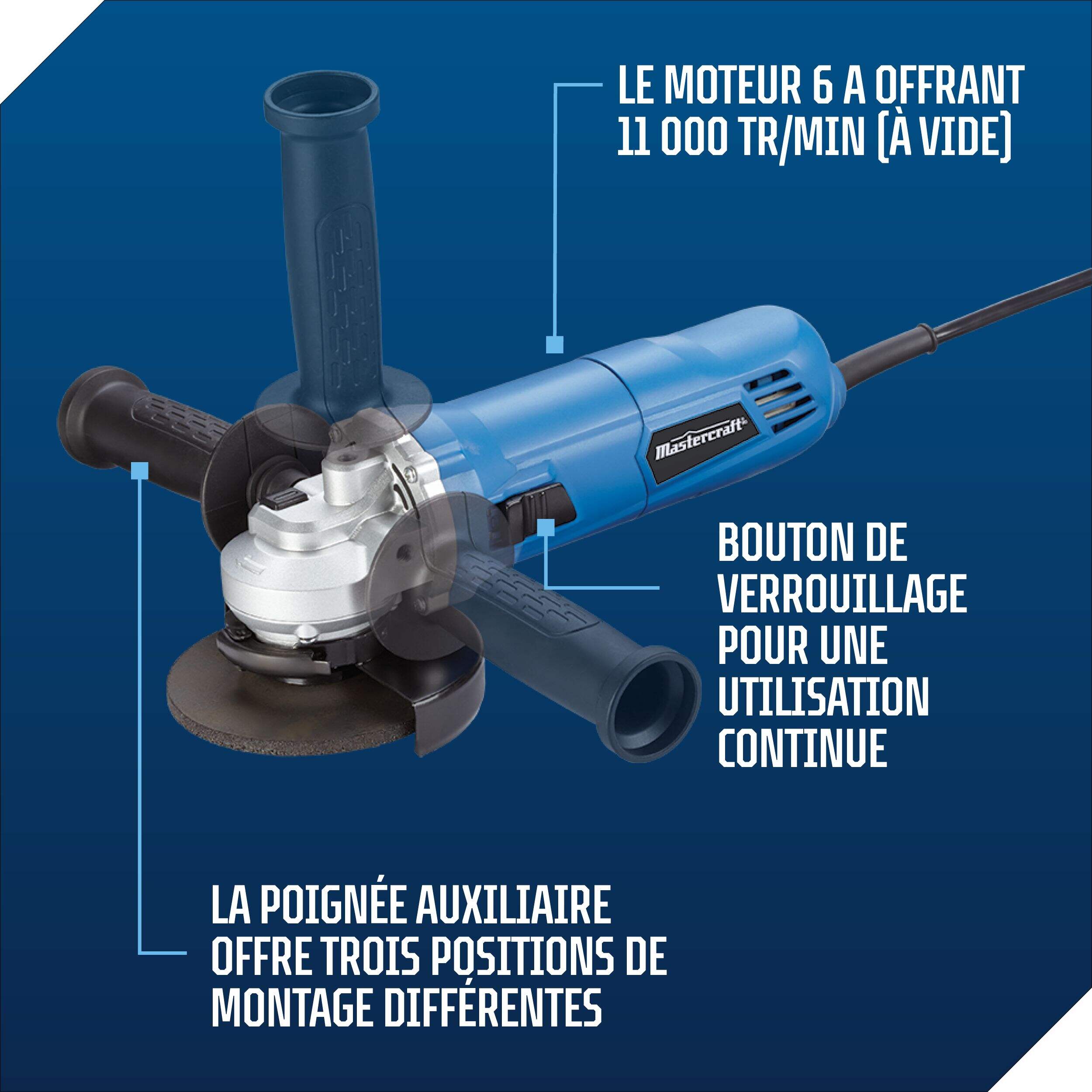 La meuleuse d'angle Mastercraft de 4,5 po et 6 A comprend deux disques à découper et des protecteurs pour une utilisation plus sécuritaire et une polyvalence maximale.