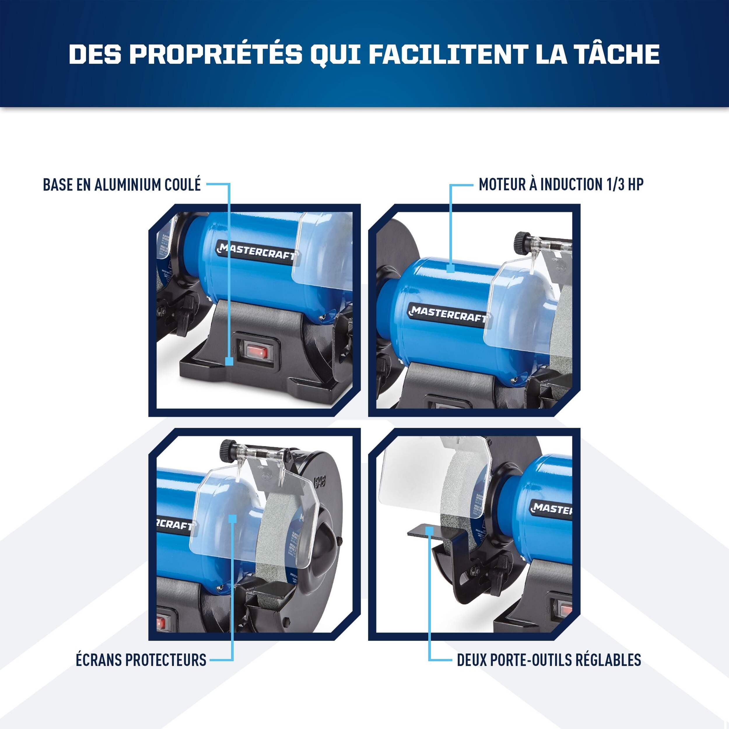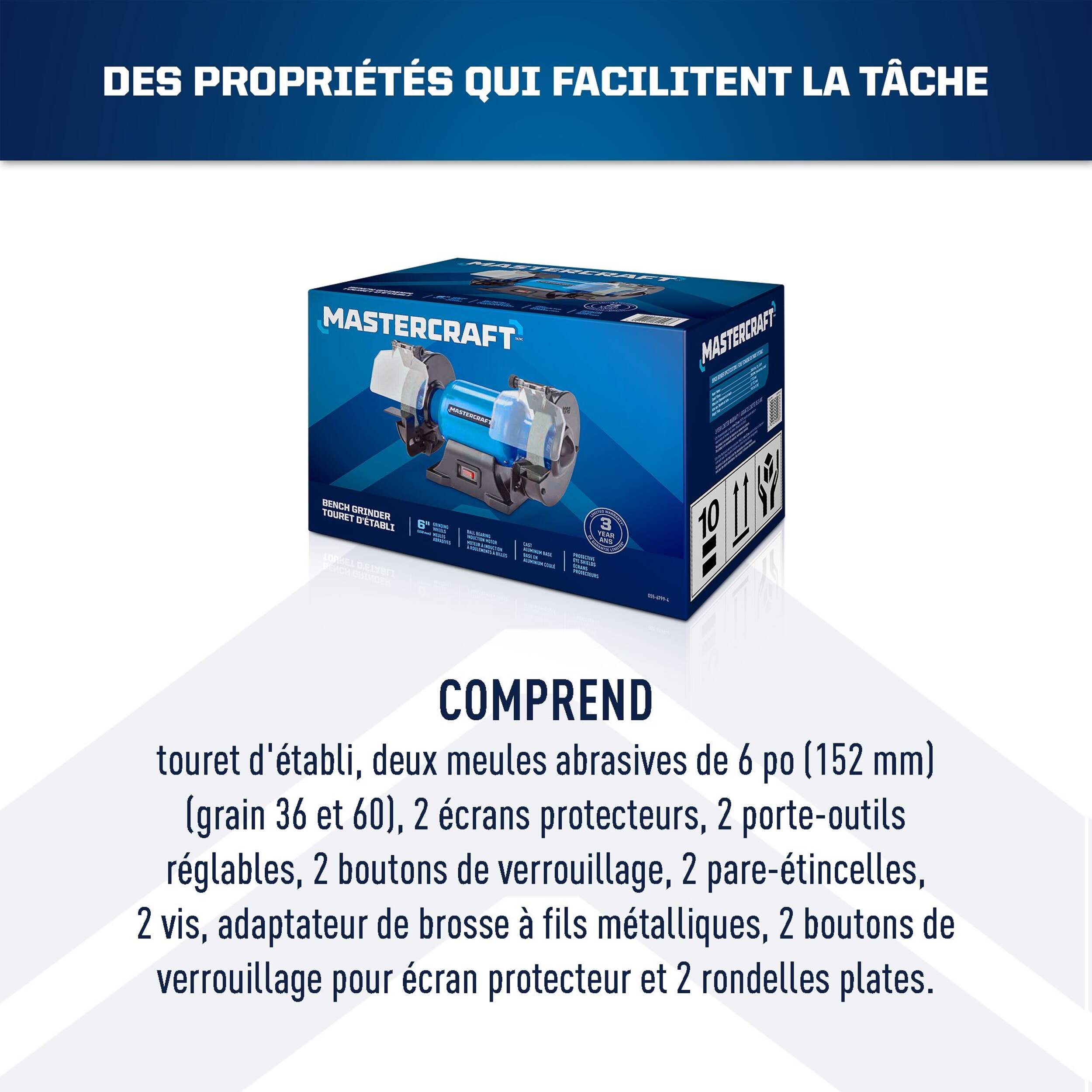 La meuleuse d'établi Mastercraft de 2,1 A est un outil essentiel pour tous les garages et ateliers. Conçue autour d'un moteur à induction de 2,1 A, cette meuleuse d'établi a une roue de 15,2 cm (6 po) de diamètre et une vitesse à vide de 3 590 tr/min. L'interrupteur à l'épreuve de la poussière aide à garder votre travail propre et 2 écrans de protection protègent contre les débris, les étincelles et les fragments. Base en fonte dotée de pieds en caoutchouc pour plus de stabilité lors de l'utilisation.