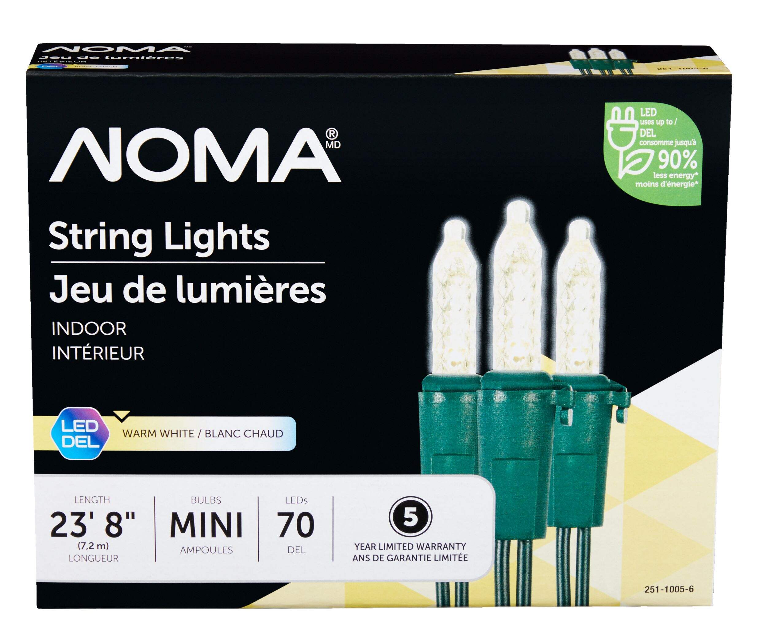 Donnez vie à votre maison grâce à la lueur chaleureuse de 70 mini-ampoules à DEL. Conçues pour une utilisation intérieure, ces lumières de Noël NOMA permettent d'ajouter facilement de la magie des Fêtes à votre arbre, vos rampes, vos fenêtres ou n'importe quel décor festif. Leur éclairage blanc chaud écoénergétique crée une ambiance chaleureuse, tandis que les mini ampoules vous permettent d'être créatif pour placer les lumières. Pour une allure encore plus éblouissante, vous pouvez connecter jusqu'à 45 jeux de lumières pour impressionner vos invités avec un décor lumineux à couper le souffle. Cette saison des Fêtes, illuminez-vous avec les mini-ampoules d'intérieur NOMA.