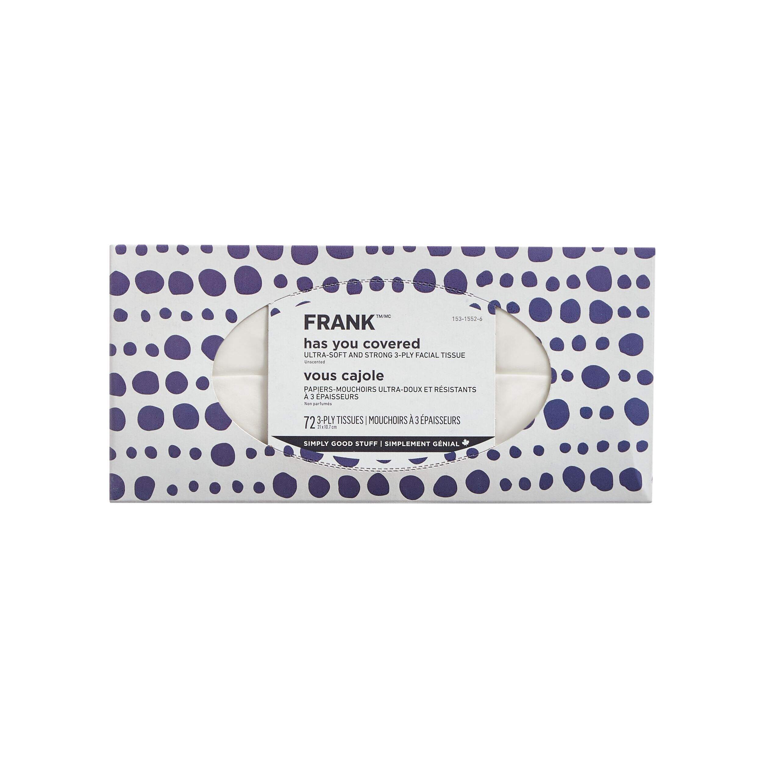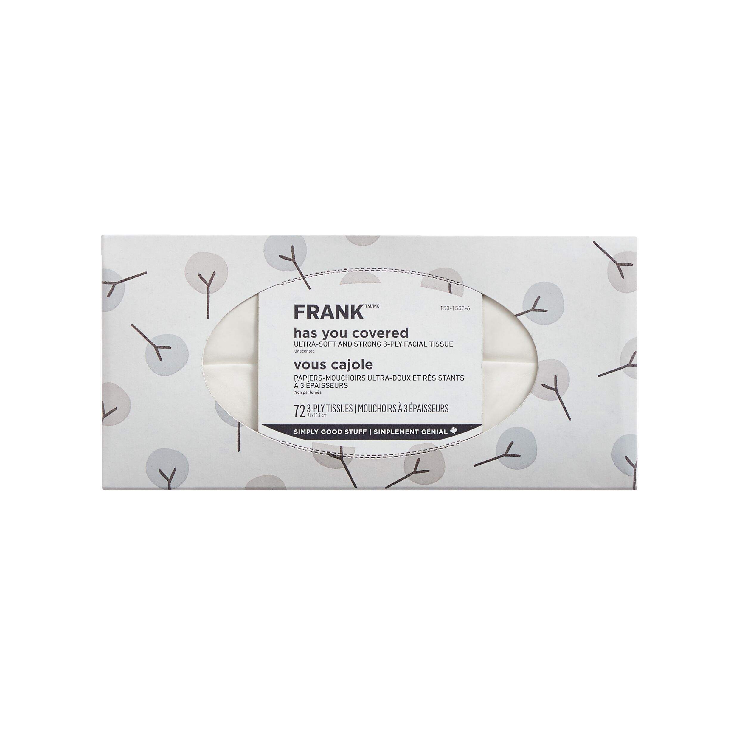 La prochaine fois que vous aurez besoin d'un mouchoir, essayez le confort et la commodité des mouchoirs FRANK très doux et robustes. Ces mouchoirs épais et doux sont le choix idéal pour une utilisation quotidienne, offrant un toucher doux qui n'irrite pas la peau. Dans un emballage moderne et brillant pour compléter sans effort votre décor, cette boîte de mouchoirs FRANK très doux et robustes est un ajout pratique à votre maison, votre voiture ou votre bureau.