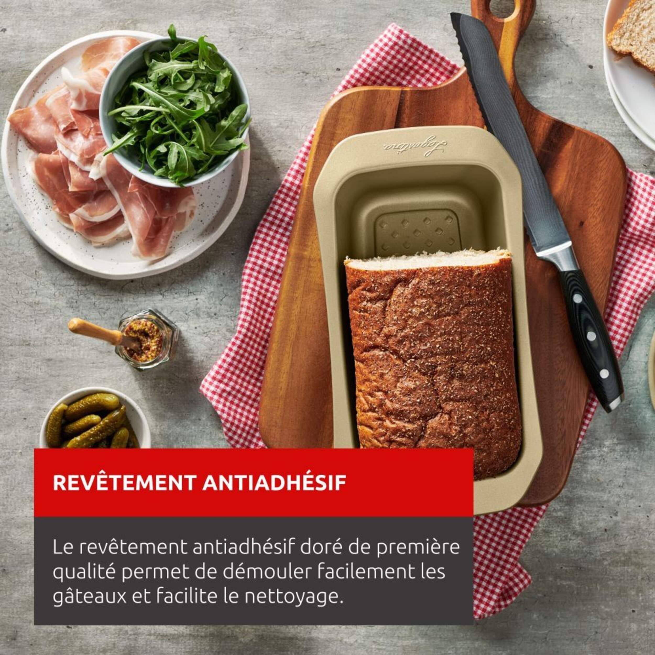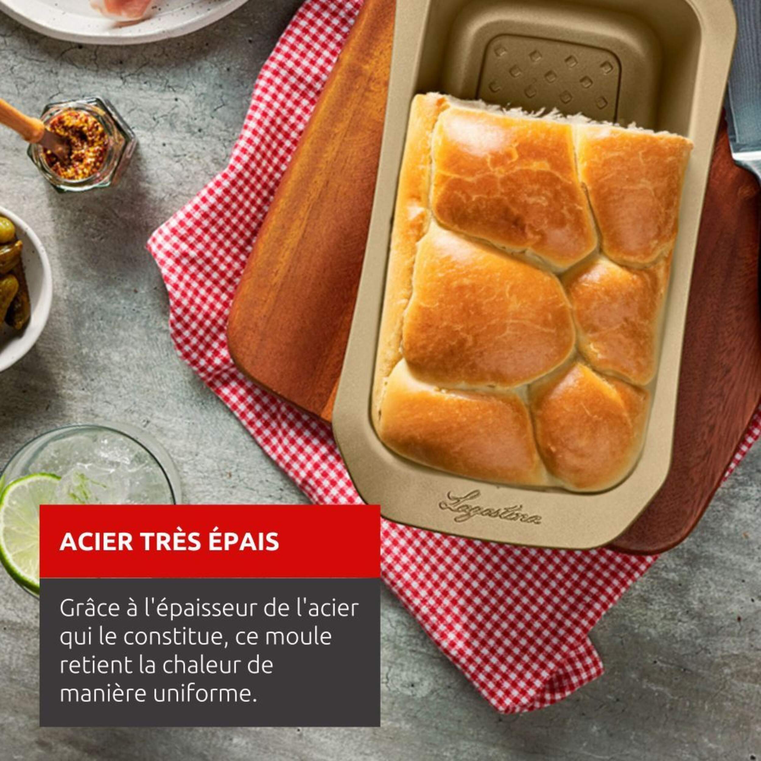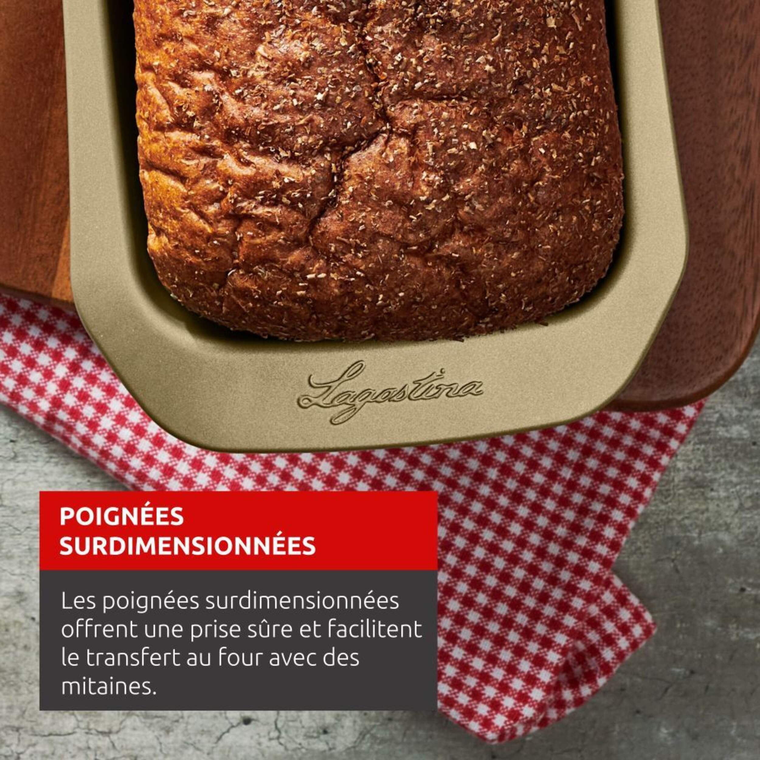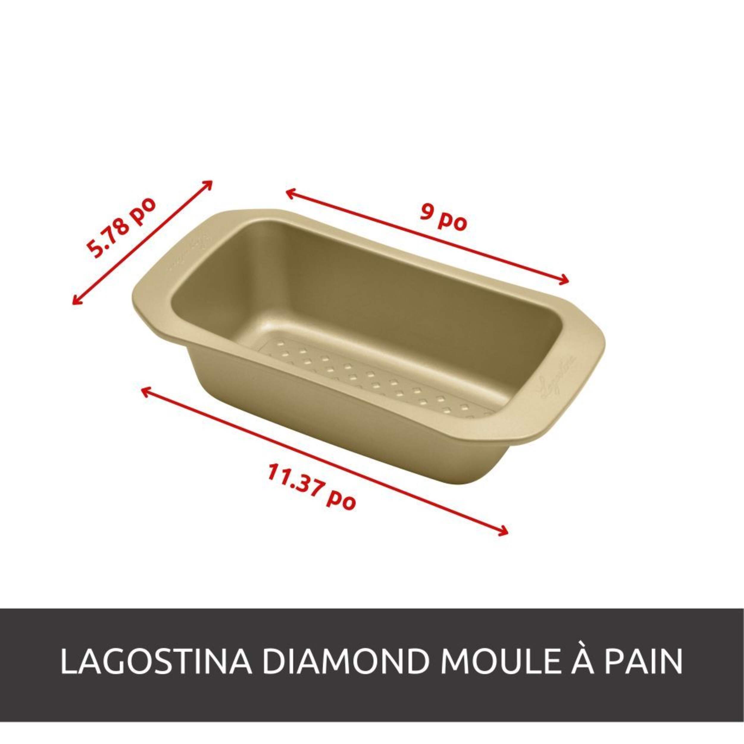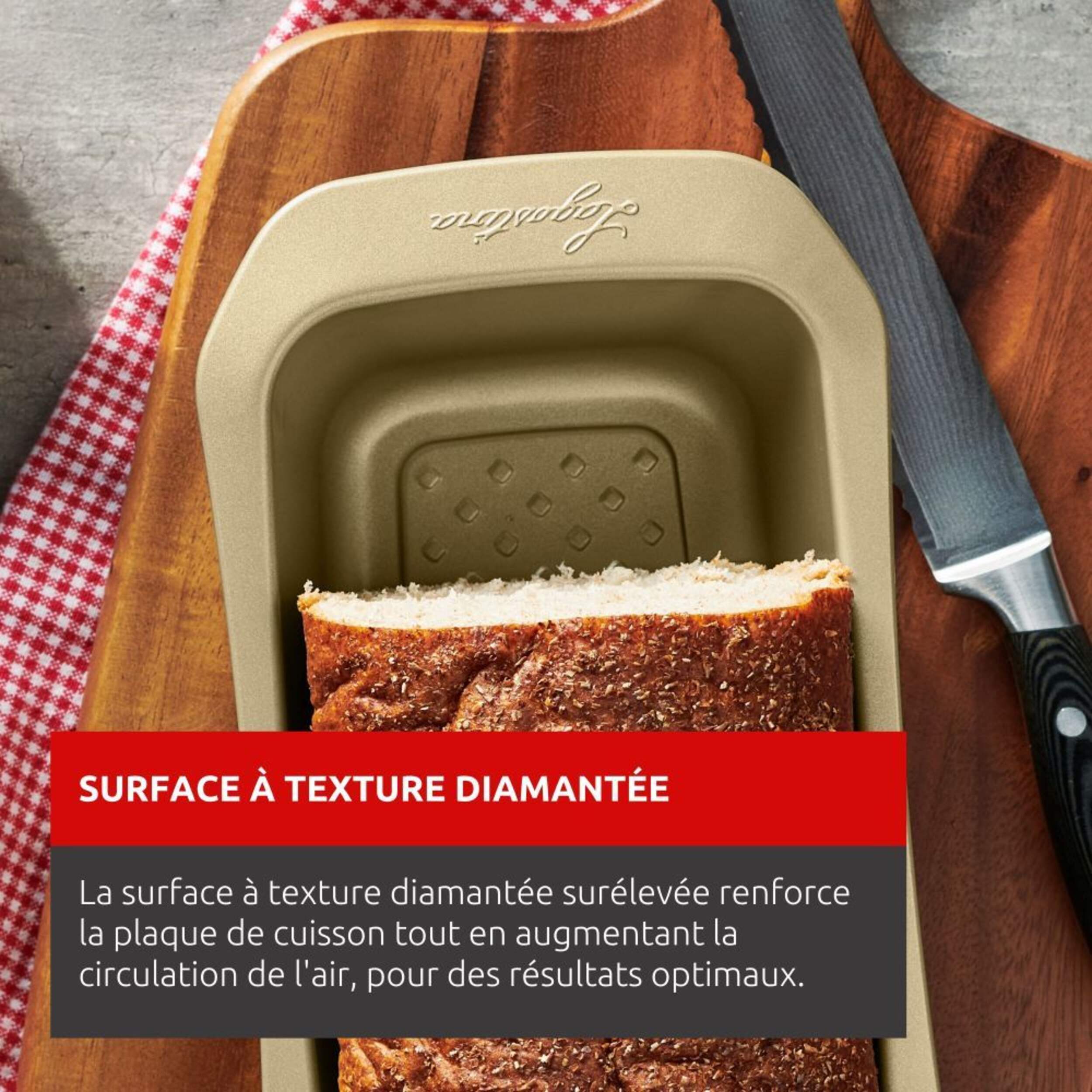 Obtenez les meilleurs résultats de vos recettes de pain sucré et salé avec le moule à pain Lagostina Diamond. Fait d'acier épais pour conserver la chaleur uniformément, il est doté d'une surface texturée à motif de diamants surélevés augmentant la circulation d'air pour une meilleure cuisson. Le revêtement antiadhésif doré de qualité supérieure permet de décoller les aliments et se nettoie facilement. Poignées surdimensionnées offrant une prise ferme pour faciliter le transfert au four avec des gants de cuisine.