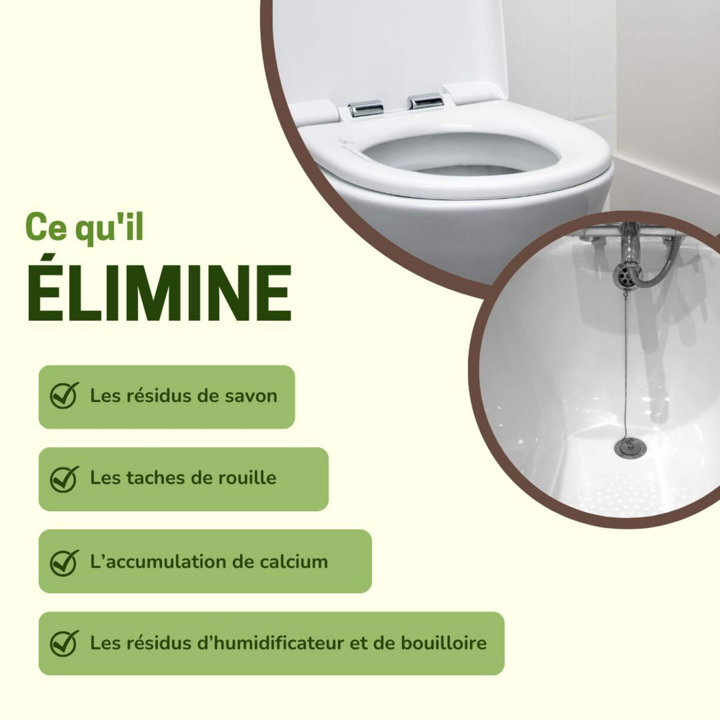 Idéal pour éliminer l'accumulation de résidus de savon et de calcaire; dissout les accumulations sans frotter