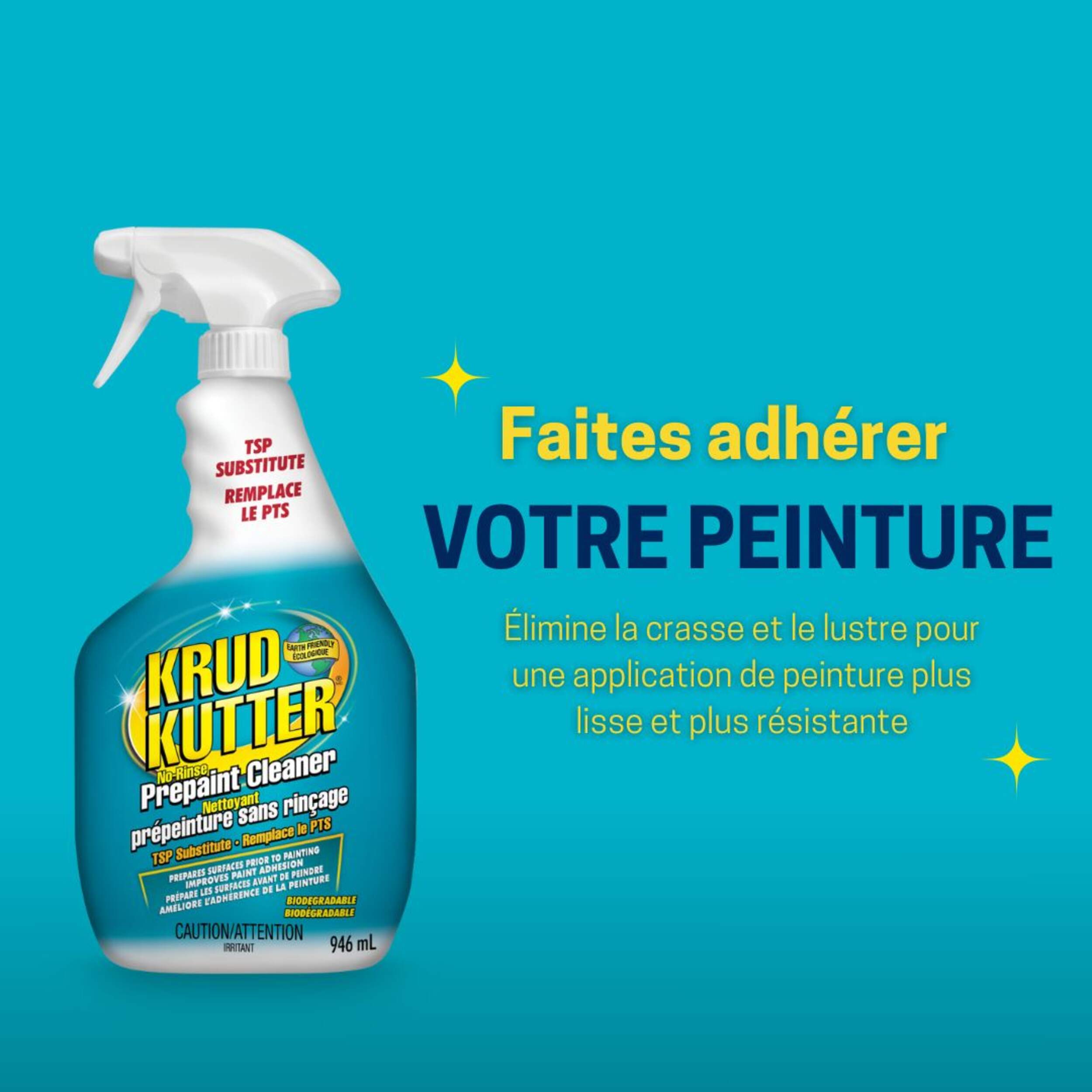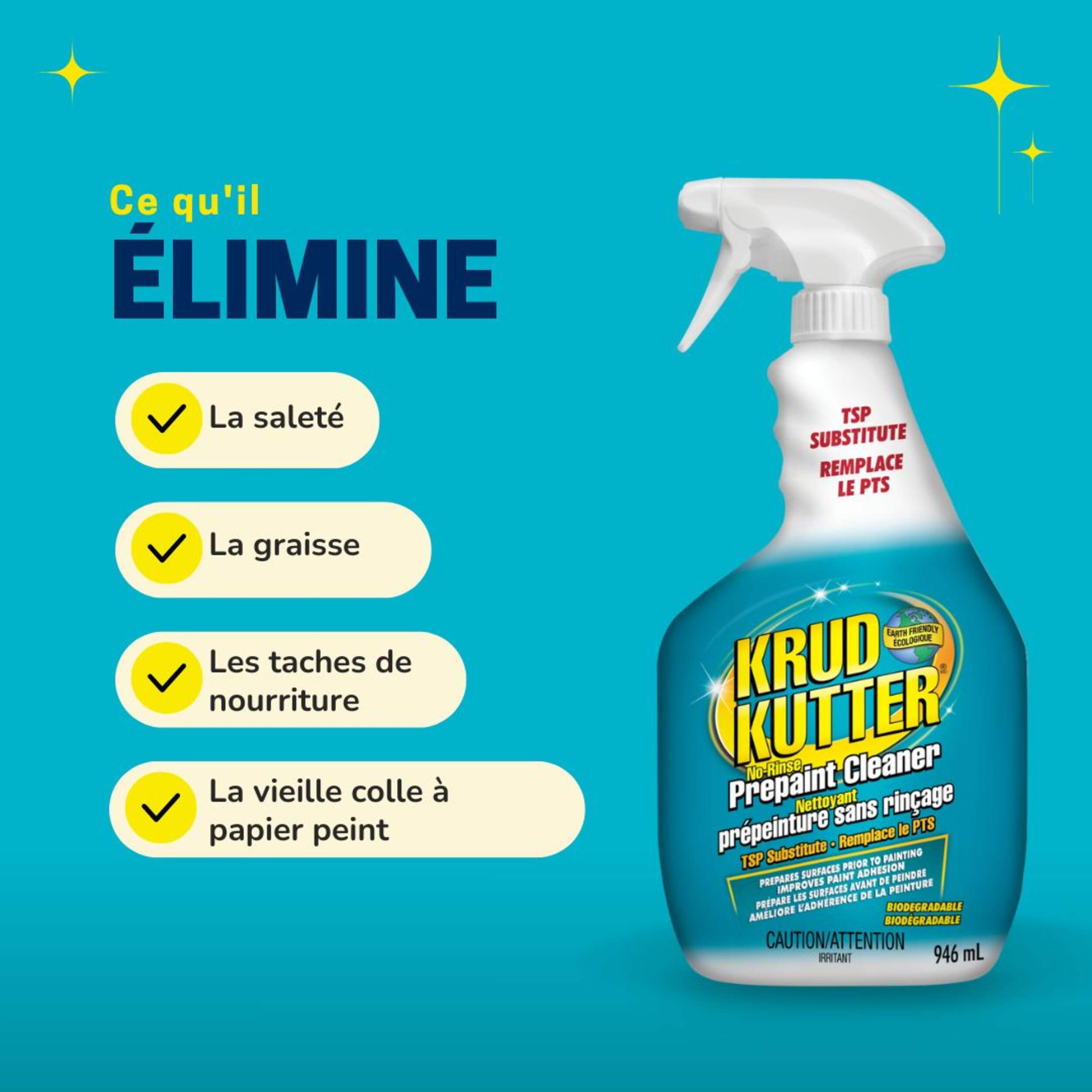 Le nettoyant avant peinture sans rinçage Krud Kutter TSP Substitute nettoie et dépolit la surface pour que la peinture adhère mieux. Utiliser sur tout type de peinture, vernis, laque et polyuréthane, ou pour préparer un mur au collage d'un papier peint. Il élimine la saleté, la graisse, la crasse, la fumée, la moisissure, les taches de nourriture, les marques de talon, les crayons de cire, la vieille pâte de papier peint et la cire sur une surface peinte ou non en bois, en métal ou en vinyle.