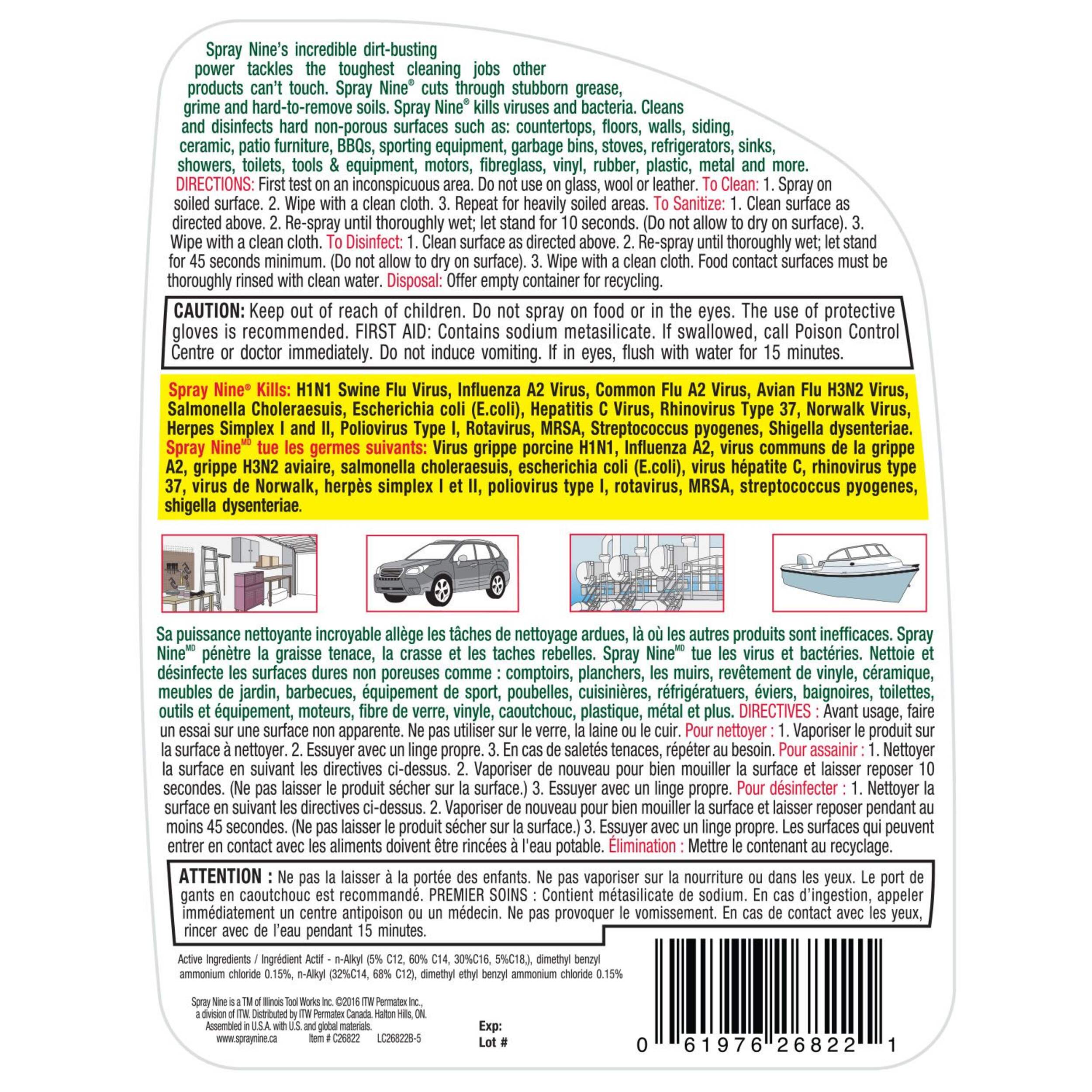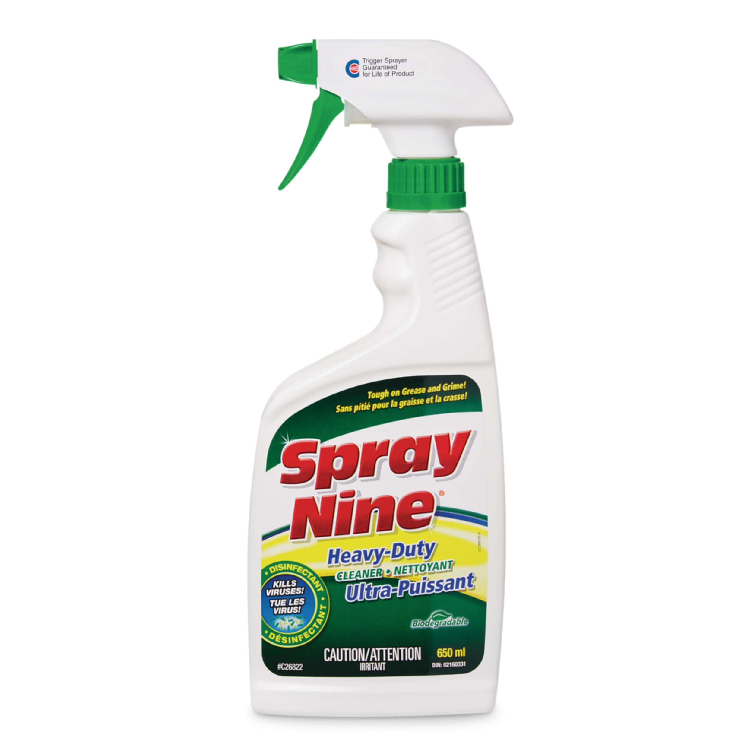 Nettoyant désinfectant et dégraissant Spray Nine de service intense pour venir à bout des tâches difficiles à l'intérieur et à l'extérieur de la maison Cette formule puissante élimine les germes et neutralise les odeurs tout en contrôlant efficacement la moisissure. Les applications suggérées comprennent notamment les bateaux, les coques, la fibre de verre, les cuisines, les housses pour bateau, les jet-skis, le matériel de camping, les VR, les remorques, les motomarines, les auvents, les glacières, les articles gonflables, les gilets de sauvetage, le vinyle et les seaux à appâts.