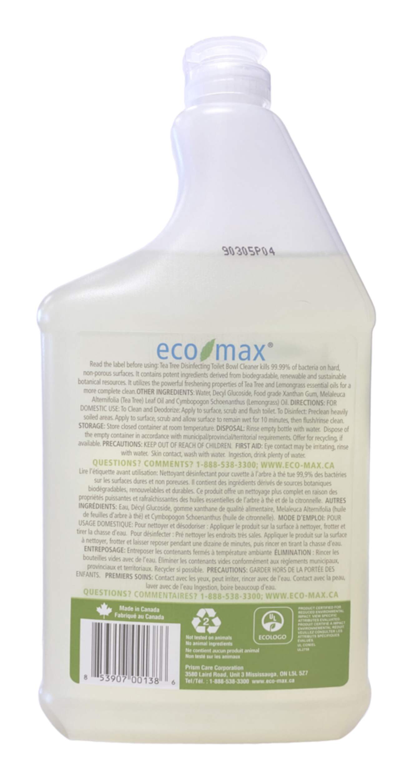 Nettoyant désinfectant pour cuvette arbre à thé Eco-Max qui est le produit idéal pour garder votre toilette fraîche et hygiénique de façon naturelle. Infusée des propriétés antiseptiques de l'huile d'arbre à thé, cette formule non abrasive désinfecte le bol tout en laissant un parfum subtil qui vous remontera le moral chaque fois que vous l'utiliserez. Il suffit de vaporiser le nettoyant, de le laisser reposer quelques minutes et d'actionner la chasse d'eau; il n'y a pas besoin de frotter fort, ce qui risquerait d'endommager votre toilette. Bouteille de 1 L qui assure que vous avez assez de nettoyant à portée de main pour plusieurs nettoyages.