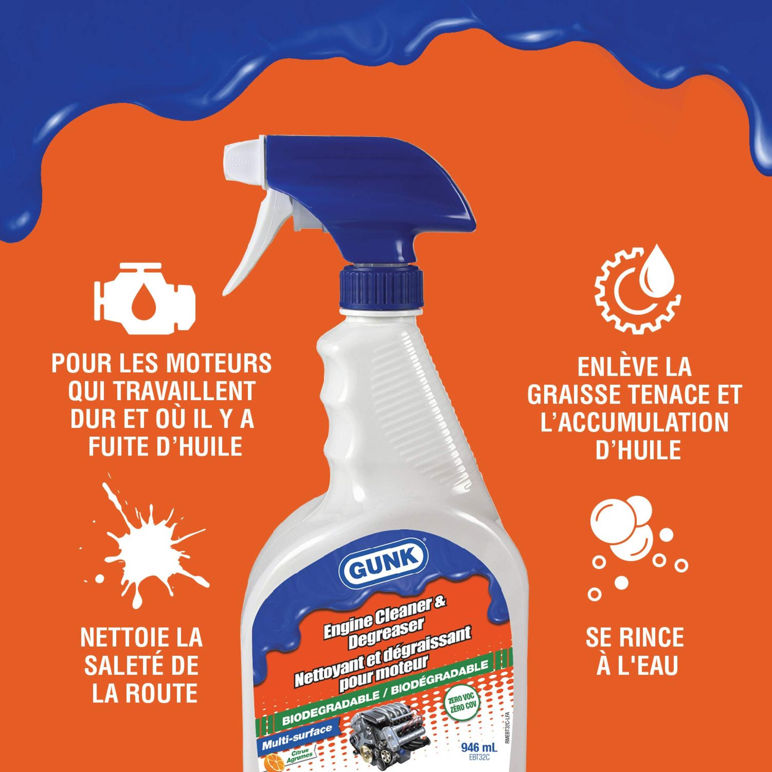 Faites confiance au chef de file mondial du dégraissage des moteurs et qui fabrique certains des meilleurs nettoyants au monde depuis plus de 55 ans. Empêchez l'huile, la graisse et la saleté de la route de priver votre moteur de ses meilleures performances. Le dégraissant à moteur GUNK multisurface élimine rapidement les accumulations de graisse, de saleté et d'huile des moteurs qui travaillent dur et qui fuient. Gardez votre huile de coude pour d'autres travaux. Vaporisez simplement le dégraissant à moteur GUNK multisurface sur votre moteur, attendez 10 minutes, nettoyez-le au jet d'eau et le tour est joué. Tout comme notre formule originale, ce produit est conçu pour s'attaquer à la saleté, à la graisse et à l'huile, mais il s'agit également d'une formule sans COV qui est facilement biodégradable. Utilisez le dégraissant à moteur GUNK multi-surface sur les voitures, camions, tondeuses à moteur, moteurs de bateau, poids lourds, équipement agricole, tracteurs, machines industrielles et plus encore.
