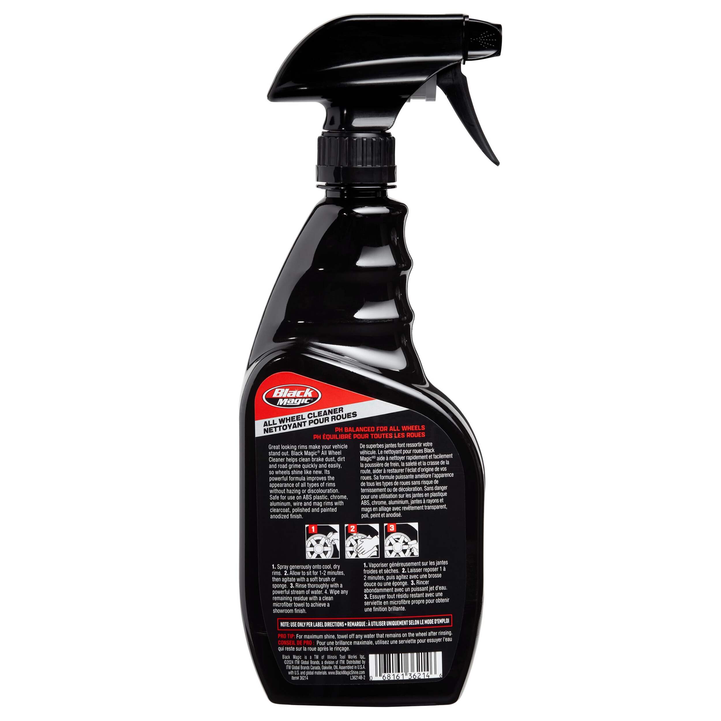 Nettoyez et maintenez vos roues en bon état grâce au nettoyant pour roues Black Magic. Cette formule puissante améliore l'apparence de tous les types de roues en éliminant les polluants de la route inesthétiques et corrosifs et peut être utilisée sans danger sur les roues en plastique ABS, en chrome, en aluminium, en fil métallique et en acier avec des finis transparents, polis, peints ou anodisés. Le nettoyant pour roues est offert en vaporisateur de 680 mL pour une application facile, et laisse les roues et les jantes propres et étincelantes.