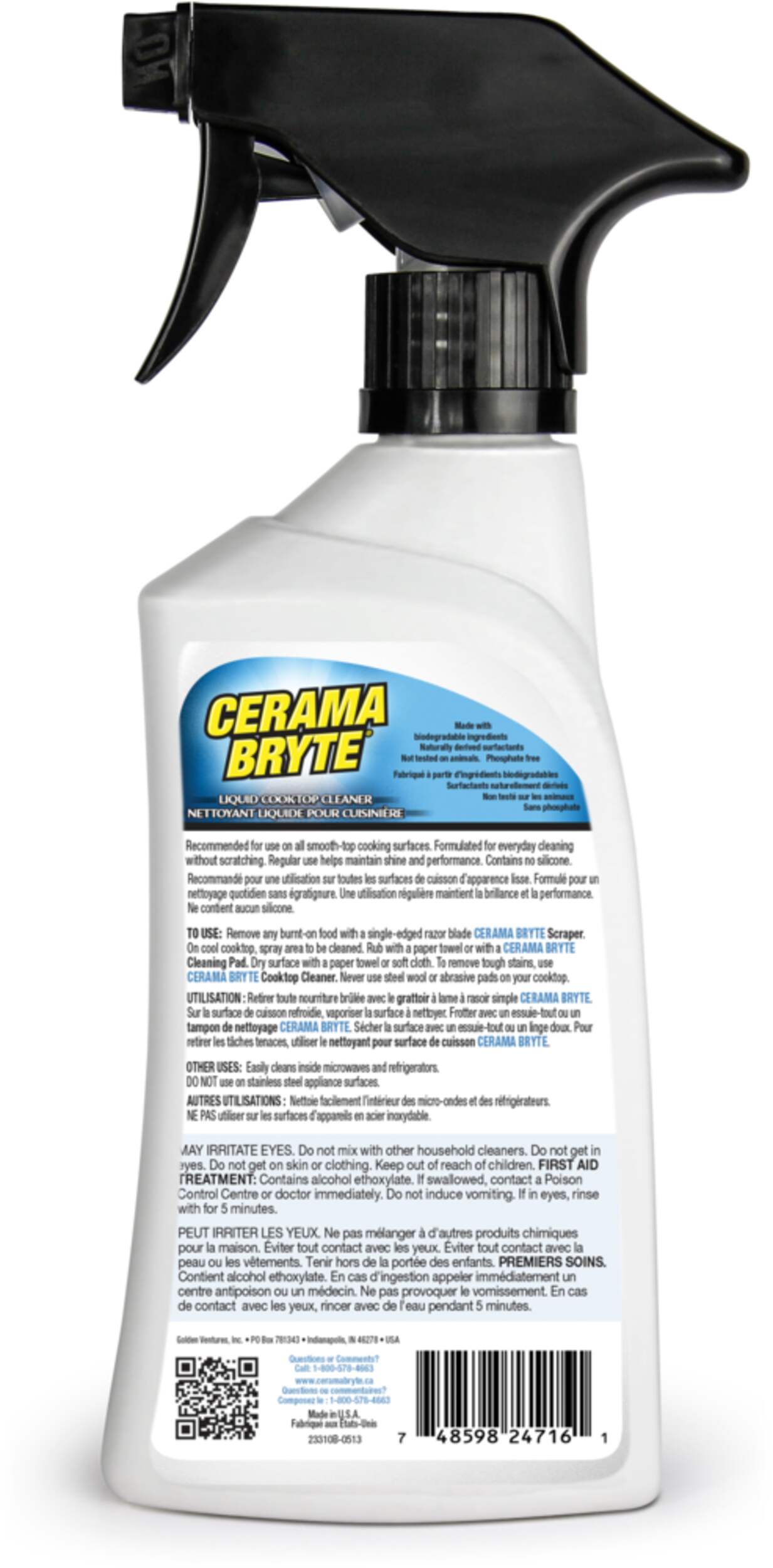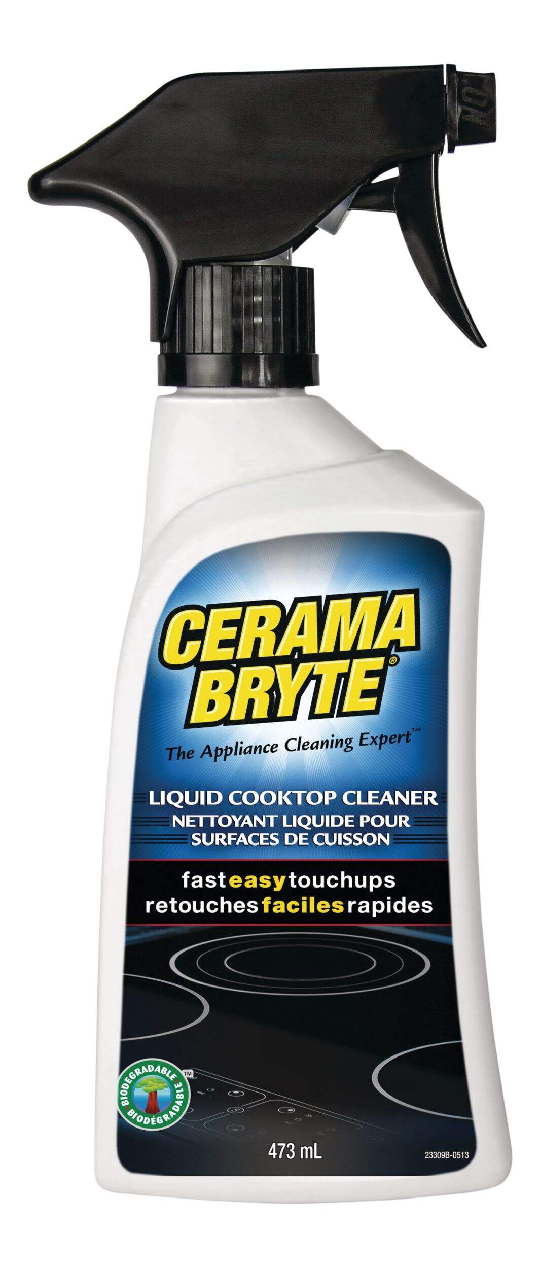 Le nettoyant liquide pour surface de cuisson Cerama Bryte en vaporisateur, nettoie rapidement et facilement les taches et les traces de doigts tenaces sur vos surfaces de cuisson en vitrocéramique. La formule biodégradable permet de conserver l'aspect neuf de votre cuisinière en éliminant les graisses et les résidus cuits. Pour obtenir de meilleurs résultats sur les taches tenaces, jumelez le vaporisateur avec un tampon nettoyant ou un grattoir et un tampon Cerama Bryte.