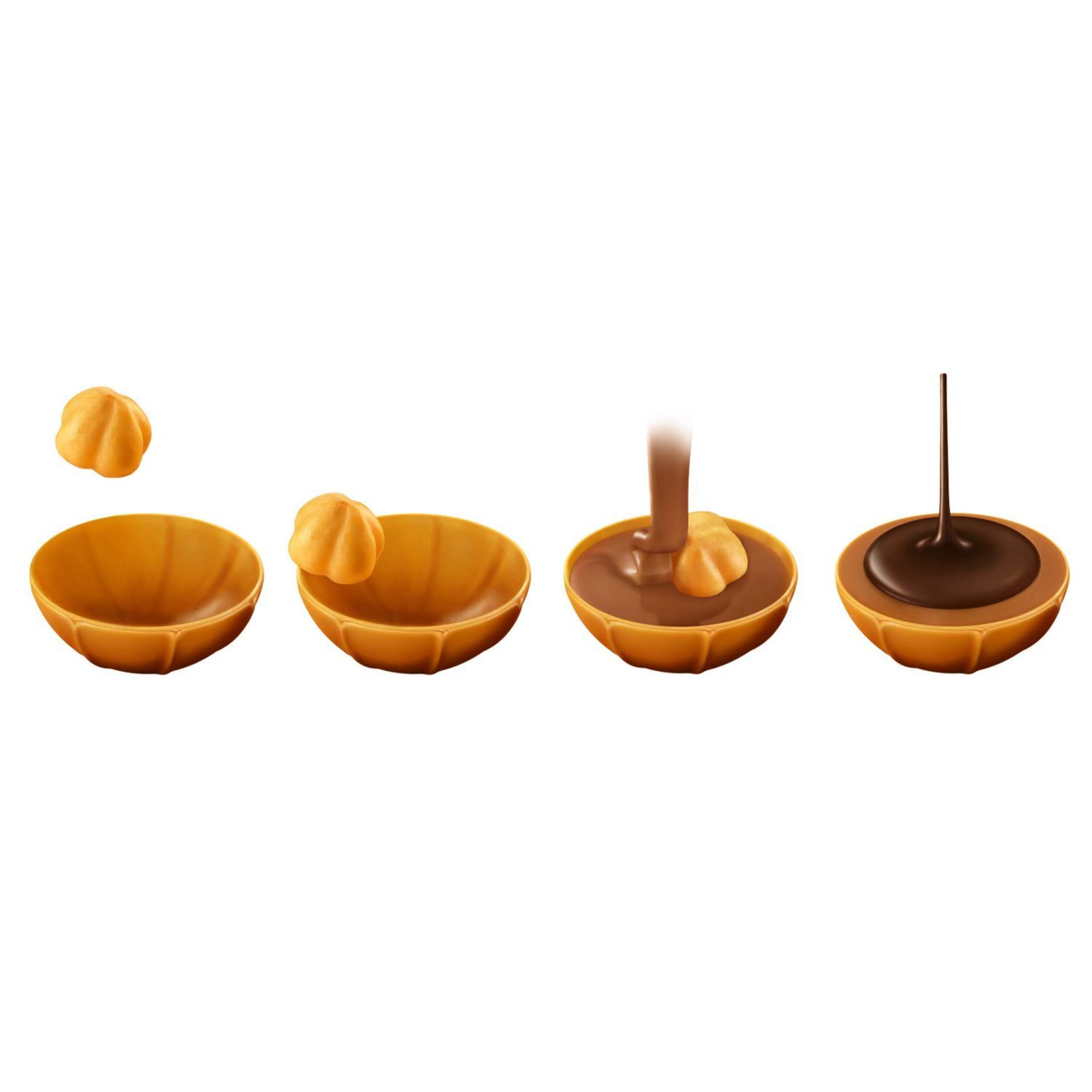 Noisette grillée dans une délicieuse coquille de caramel, garniture de nougat lisse et crémeuse et soupçon de riche chocolat