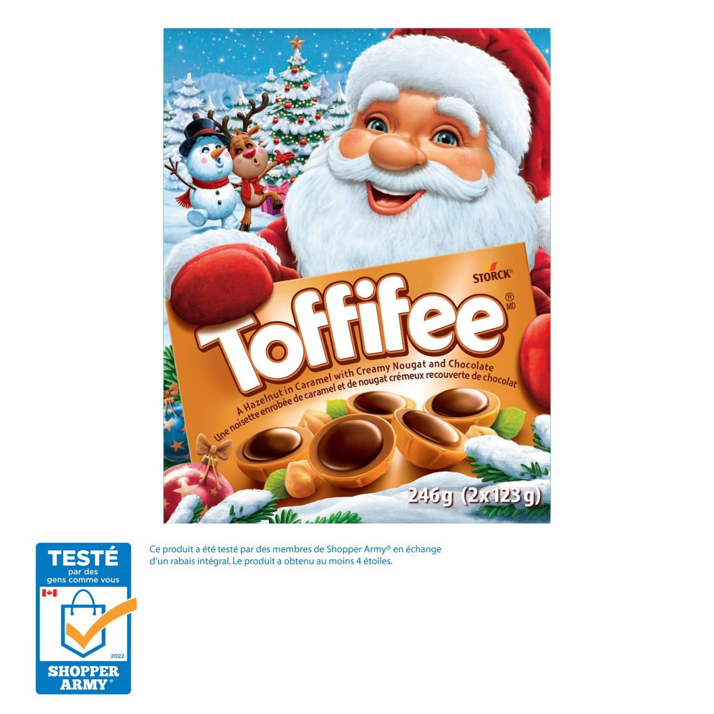 La friandise unique ToffifeeMD 246 g plaira à tous : une noisette rôtie dans une délicieuse coquille de caramel, une garniture de nougat onctueuse et crémeuse, en plus d'un soupçon de riche chocolat noir! Le format ToffifeeMD de 246 g contient 30 morceaux et est idéal pour partager avec votre famille et vos amis! Fabriqué en Allemagne et apprécié au Canada depuis plus de 30 ans, Toffifee est synonyme de bonheur!