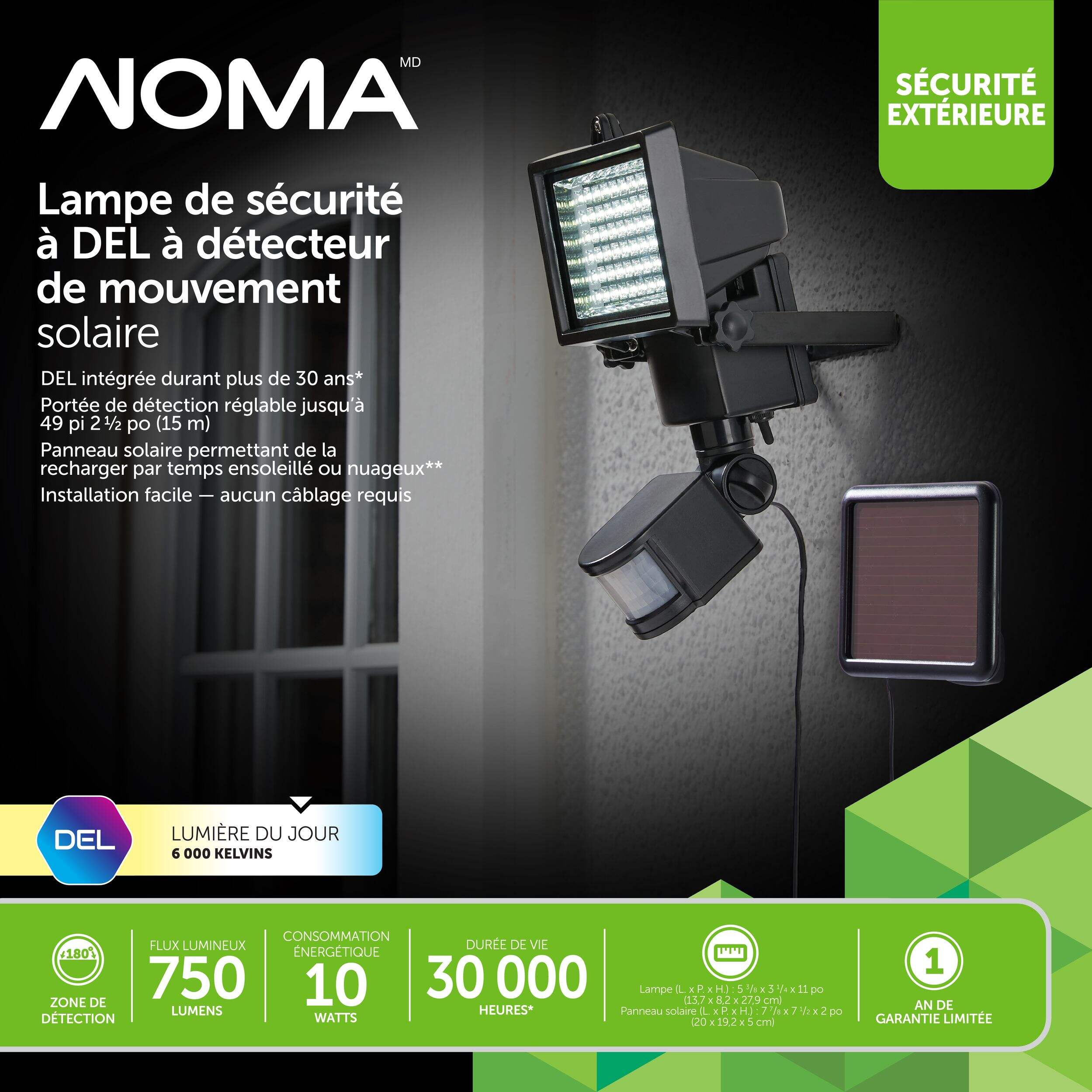 Lampe solaire à DEL de 750 lumens avec détection de mouvement sur 180 degrés