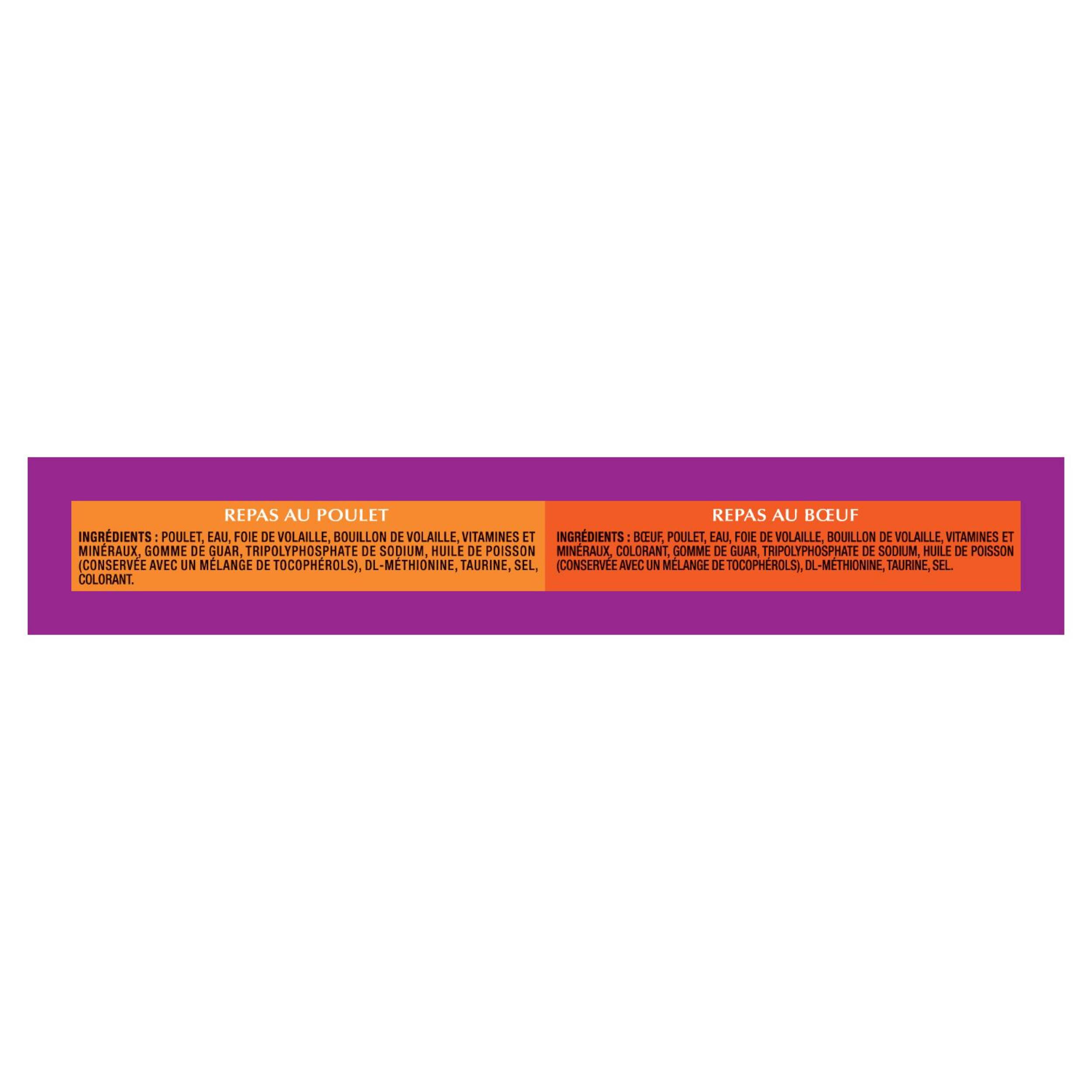 Deux repas frais. Pas de dégâts. Pas de restants. Après la première portion, la nourriture humide n'est pas toujours fraîche pour votre chat, et certains chats trouvent les restes réfrigérés moins appétissants. De plus, les restes de nourriture humide peuvent vous compliquer la vie et entraîner des dégâts. C'est pourquoi nous avons créé un repas en portion individuelle pour les chats. Grâce à ce format individuel, votre chat déguste un repas frais chaque fois, sans dégâts ni restants*. Le repas parfait pour votre compagnon idéal. La nourriture a une texture de pâtée attrayante et est offerte avec des saveurs véritables comme poulet, dinde, boeuf, saumon, poisson blanc et thon, fruits de mer, poulet et foie, poulet et thon. WHISKASMD PERFECT PORTIONSMD est une révolution dans la nourriture humide pour chats. 6 sachets de 75 g au poulet (deux portions par emballage). 6 sachets de 75 g au boeuf (deux portions par emballage). Total de 24 portions.