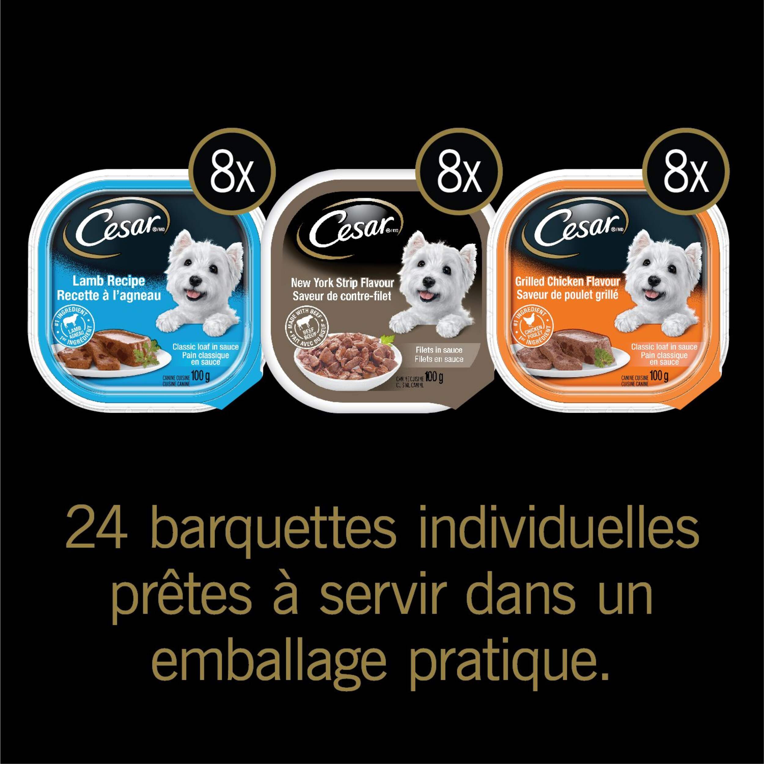 Chaque paquet contient 8 conserves à saveur de poulet grillé, 8 conserves à saveur de boeuf et 8 conserves à saveur d'agneau