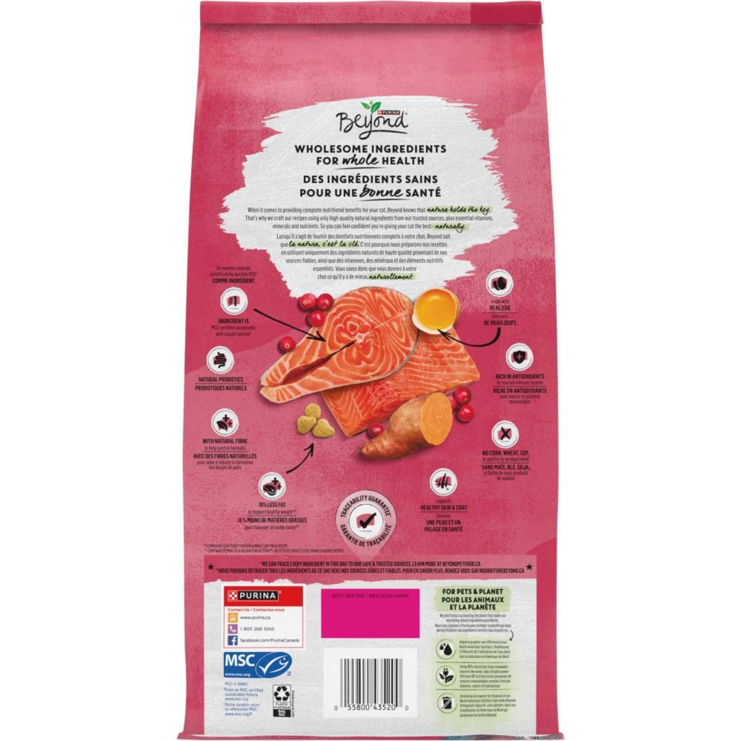 Servez à votre chat d'intérieur une nourriture conçue pour répondre à ses besoins uniques grâce à la nourriture sèche pour chats adultes d'intérieur Purina MD Beyond MD Simply, recette au saumon, aux oeufs et aux patates douces. Chaque ingrédient de haute qualité de notre recette de nourriture pour chats sans grains provient de nos sources fiables et a été soigneusement sélectionné pour aider votre chat à vivre longtemps et en bonne santé avec vous. Notre nourriture pour chats à haute teneur en protéines commence par du vrai saumon sauvage comme premier ingrédient et contient des antioxydants pour aider à soutenir un système immunitaire sain. De plus, elle contient des fibres naturelles pour contrôler les boules de poils et des probiotiques pour favoriser la santé digestive de votre chat. Avec 10 % de matières grasses en moins que notre recette de blanc de poulet et de farine d'avoine entière Purina Beyond Simply, cette nourriture riche en protéines et destinée au contrôle du poids aide également votre chat à maintenir un poids santé.
