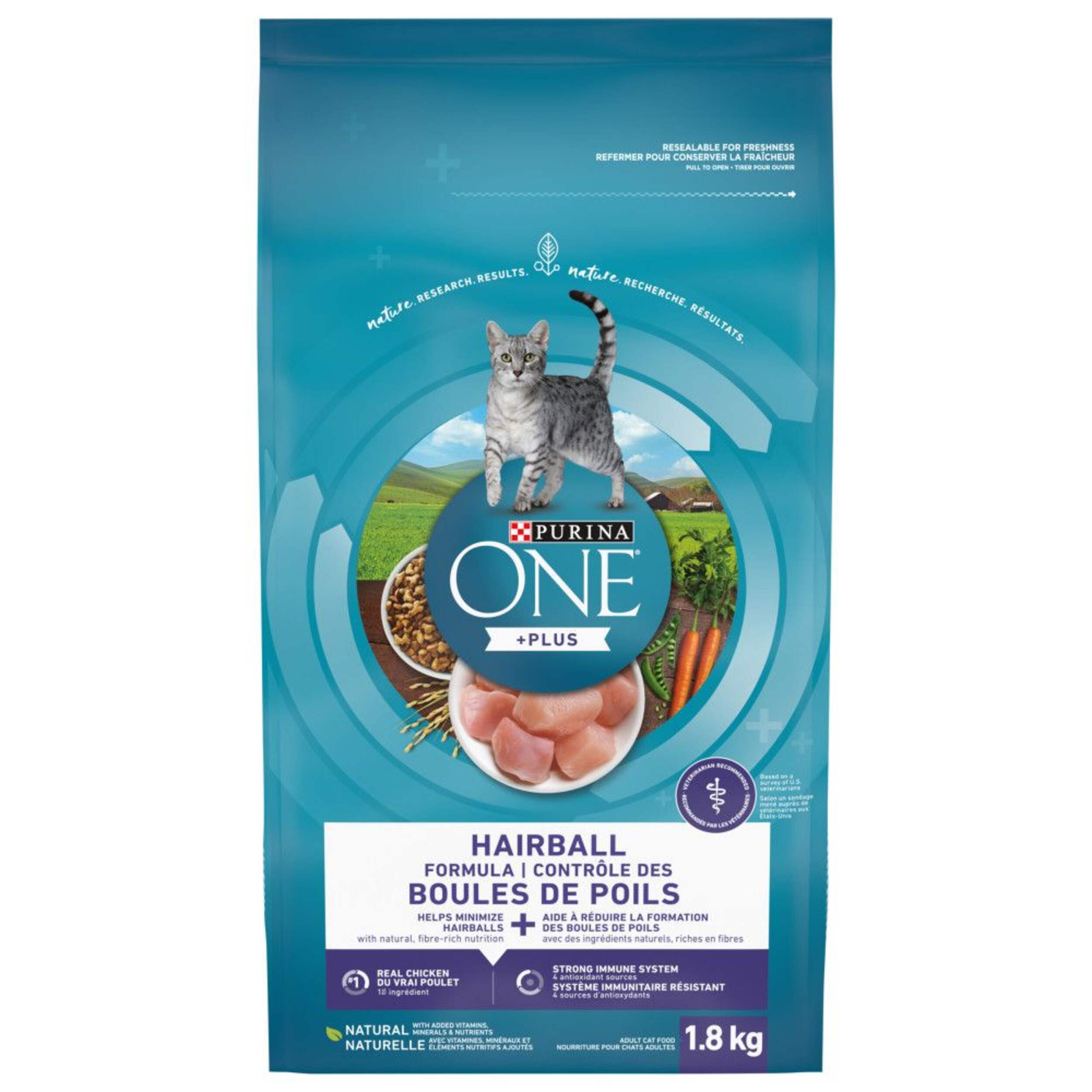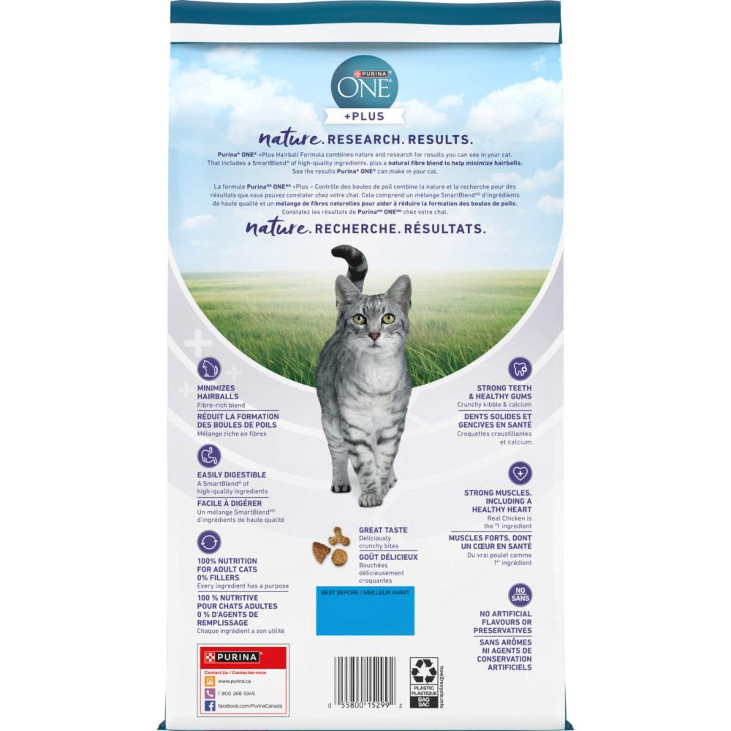 Nourriture sèche pour chats adultes PurinaMD ONEMD SmartBlend Contrôle des boules de poils contient un mélange de fibres naturelles qui aide à réduire les boules de poils