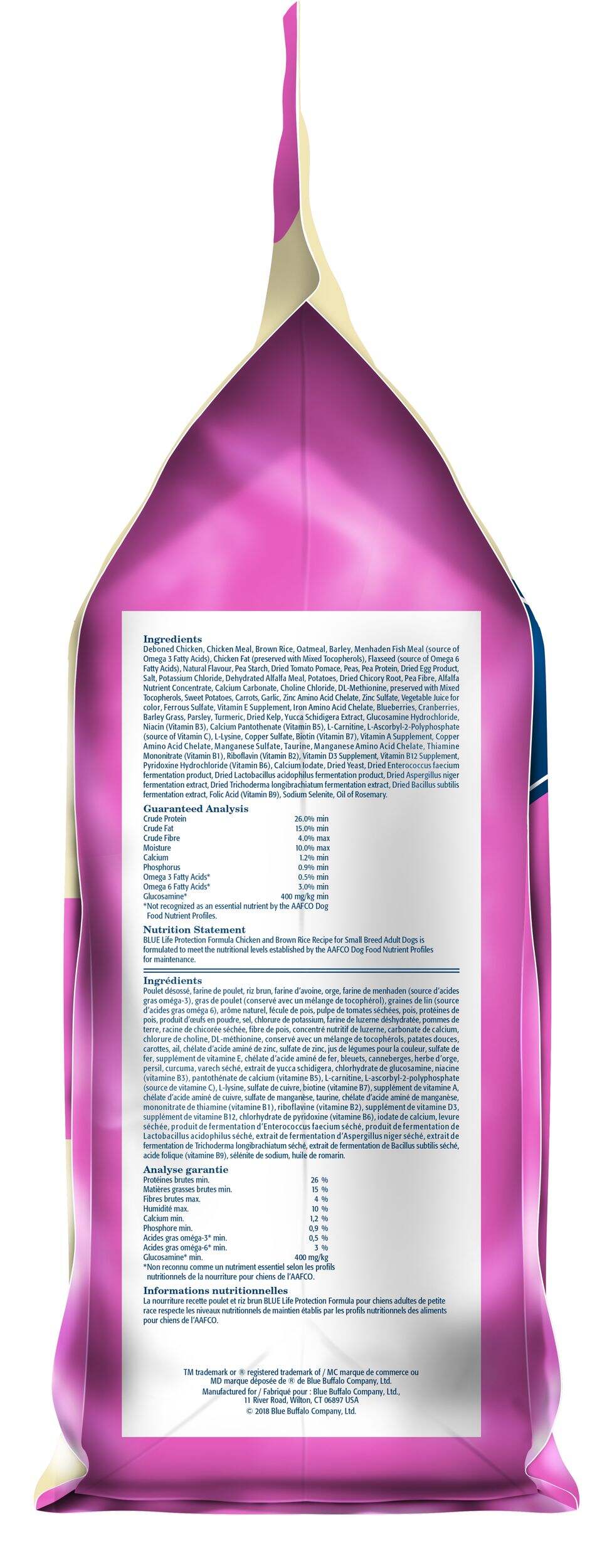 Conçue pour la santé et le bien-être des chiens, la nourriture BLUE Life Protection est faite des meilleurs ingrédients naturels et caractéristiques. En commençant par un délicieux poulet de grande qualité, elle contient des fruits et des légumes riches en antioxydants et des grains entiers nutritifs. Formulée avec un mélange précis de protéines et de glucides, cette recette aide à répondre aux besoins énergétiques plus élevés des petits chiens.