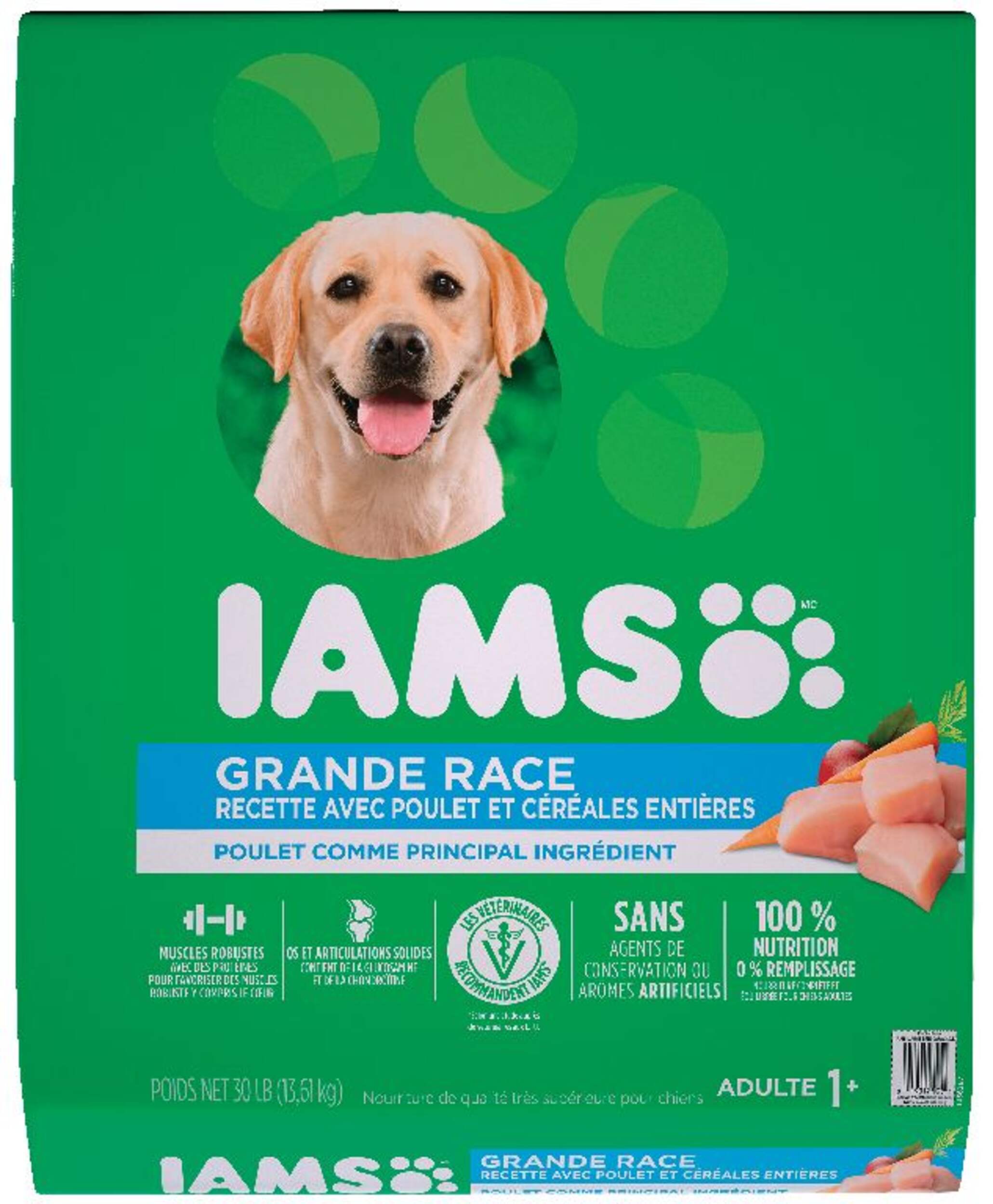 La nourriture sèche pour chiens adultes de grandes races IAMS est recommandée par les vétérinaires et est faite avec de vrais ingrédients riches en protéines pour une santé optimale. Notre recette est à base de poulet élevé à la ferme et contient des grains et des légumes nutritifs. Elle est formulée avec de la glucosamine et du sulfate de chondroïtine pour des articulations en santé. De plus, nos ingrédients de qualité faciles à digérer fournissent à votre grand chien un excellent système immunitaire, des os solides, une peau, un pelage et un métabolisme sains. Recherchez la différence IAMS.