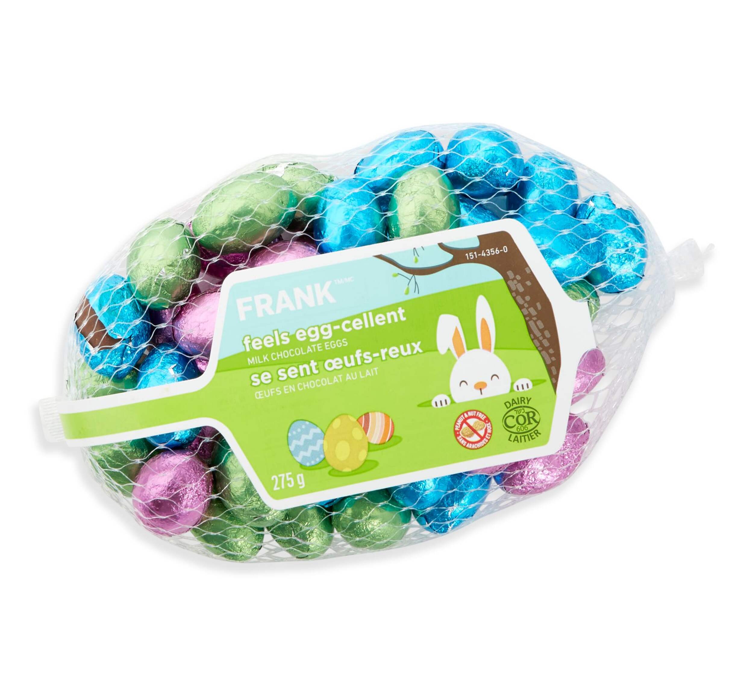 Les oeufs FRANK au chocolat au lait à caves en aluminium, 275 g, sont parfaits pour les envies de chocolat en tout temps. Les oeufs emballés individuellement dans du papier d'aluminium permettent de prendre des collations sans dégâts directement dans le garde-manger. Mordez dans l'un de ces oeufs au chocolat au lait pour un après-midi à savourer, ou partagez-en quelques-uns avec vos collègues pour une gâterie au bureau. À 275g h, cet ensemble offre une foule de collations chocolatées idéales pour les fêtes de Pâques et les rassemblements des Fêtes.