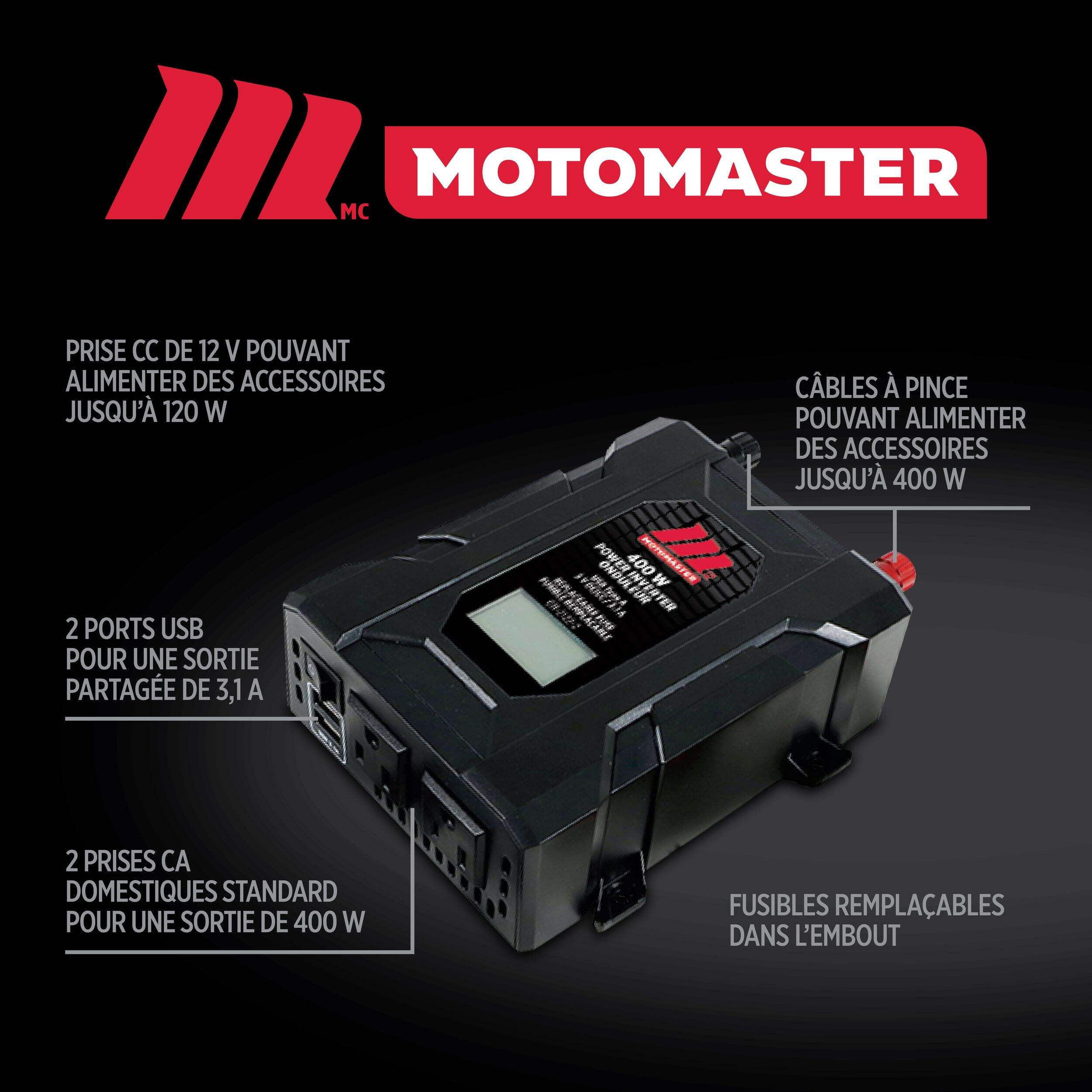 L'onduleur MotoMaster 400 W est doté d'un écran ACL affichant le pourcentage de puissance de sortie en temps réel et avertit l'utilisateur lorsque la protection en temps réel est activée. Il est doté de deux ports c.a. pour une sortie de 400 W et d'un port USB 5 V 3,1 A partagé. Conçu pour la sécurité, l'onduleur protège contre les tensions basses et hautes, les surcharges et les surchauffes. L'embout contient des fusibles de remplacement pour un entretien facile. L'onduleur produit une onde sinusoïdale modifiée et présente un fini gris élégant.