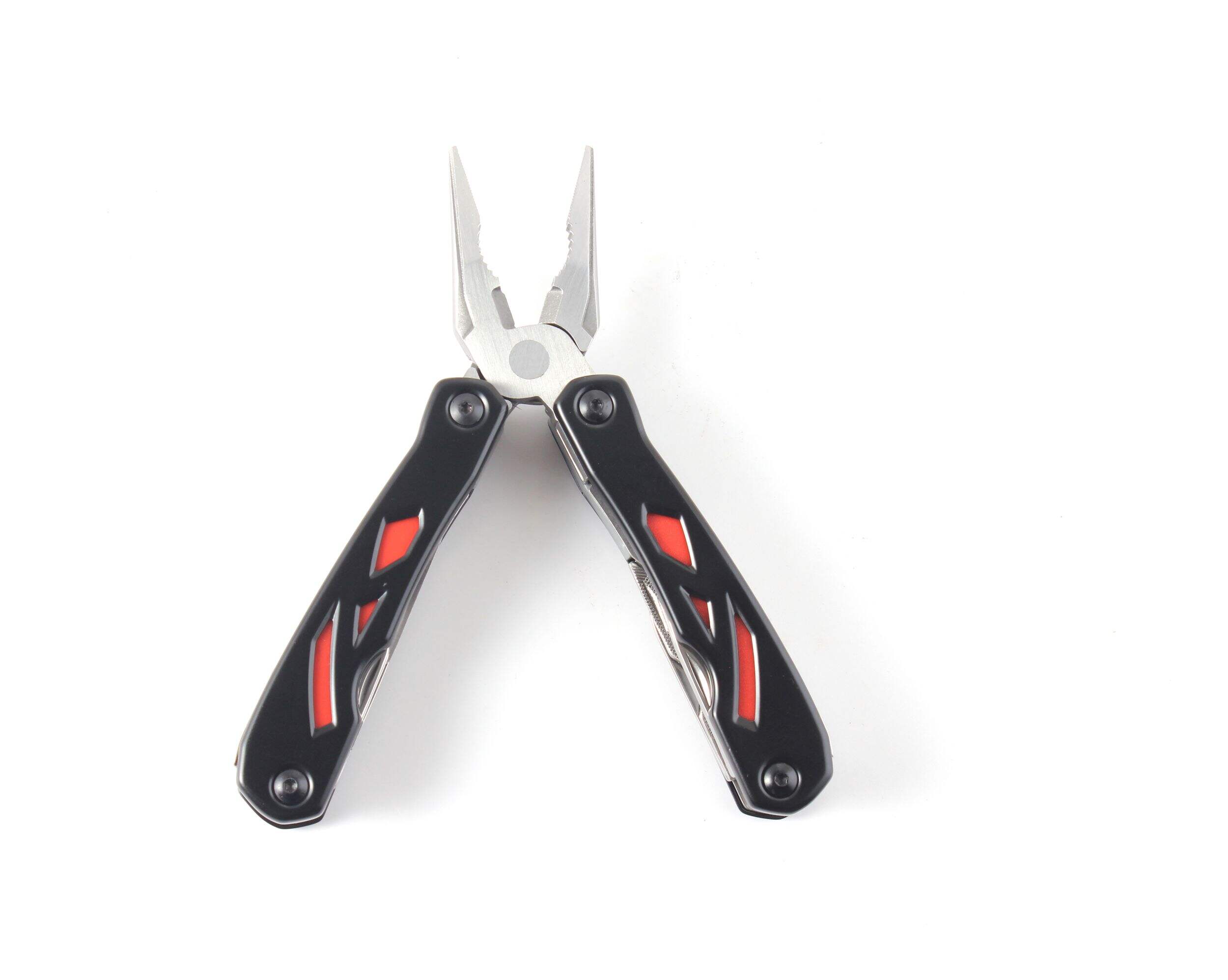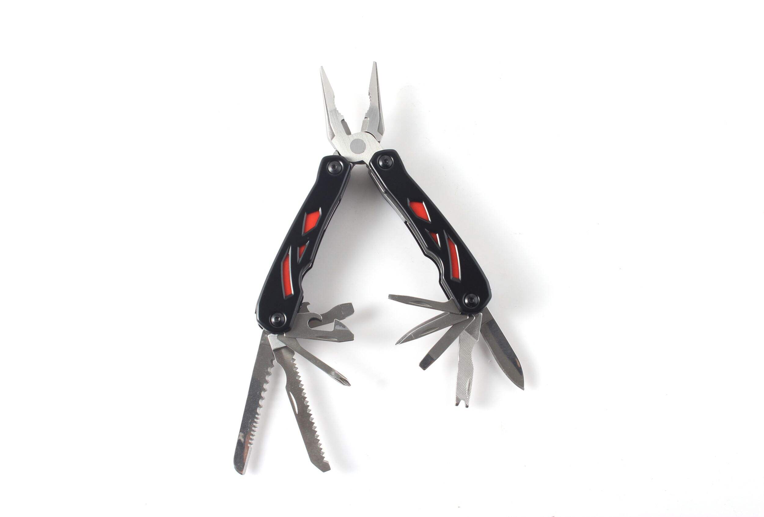 Comprend : pince ordinaire, coupe-fil, pince à dénuder, lime, scie, couteau, couteau dentelé, dégorgeoir, tournevis plat, mini tournevis plat, grand tournevis plat, tournevis cruciforme, pochette en cuir, ouvre-boîte, ouvre-bouteille, lampe de poche à DEL