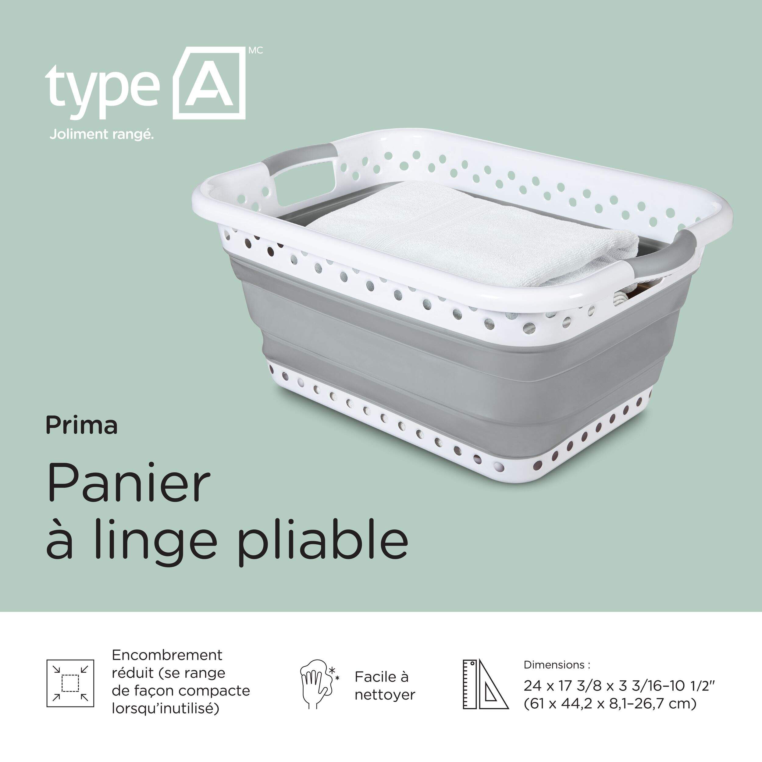 Gagnez de l'espace dans la salle de lavage ou le placard à linge avec le panier à linge repliable type A. Ce panier polyvalent est facile à ouvrir, à remplir et, grâce à ses poignées pratiques, à transporter lorsque vient le jour du lavage. Lorsque vous ne l'utilisez pas, ce grand panier se replie à plat, ce qui le rend idéal pour les petits appartements ou condos. De plus, vous pouvez le ranger dans le coffre de votre voiture pour y placer de l'équipement de sport ou de l'épicerie, ce qui en fait un ajout pratique à n'importe quelle maison.