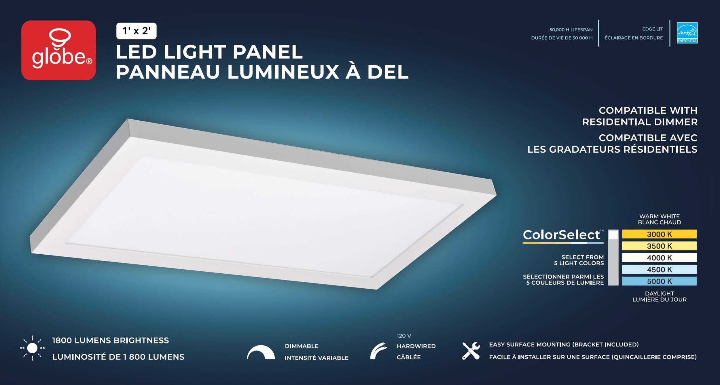 Panneau à DEL Globe avec 5 choix de température de couleur (3000 K / 3500 K / 4000 K / 4500 K / 5000 K)