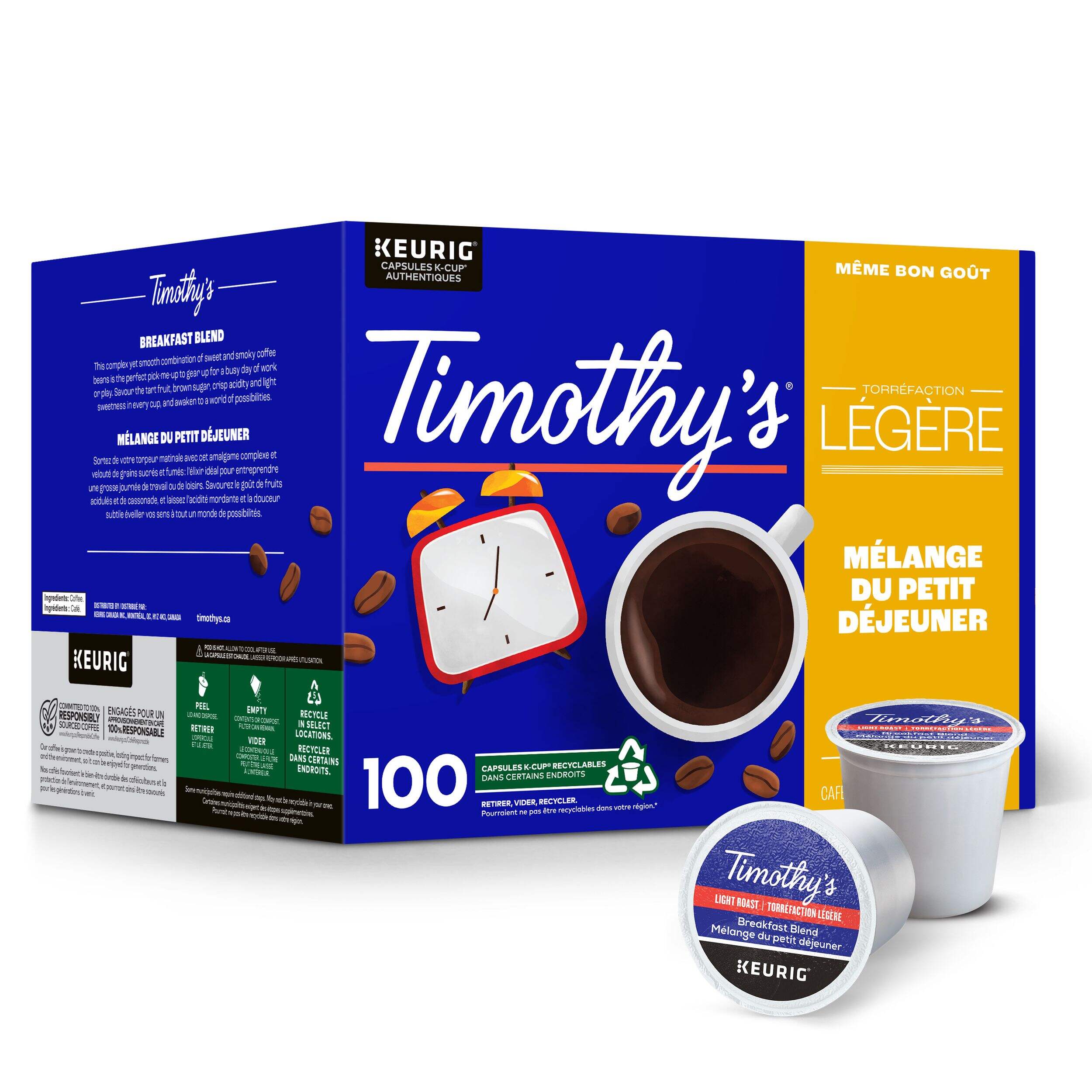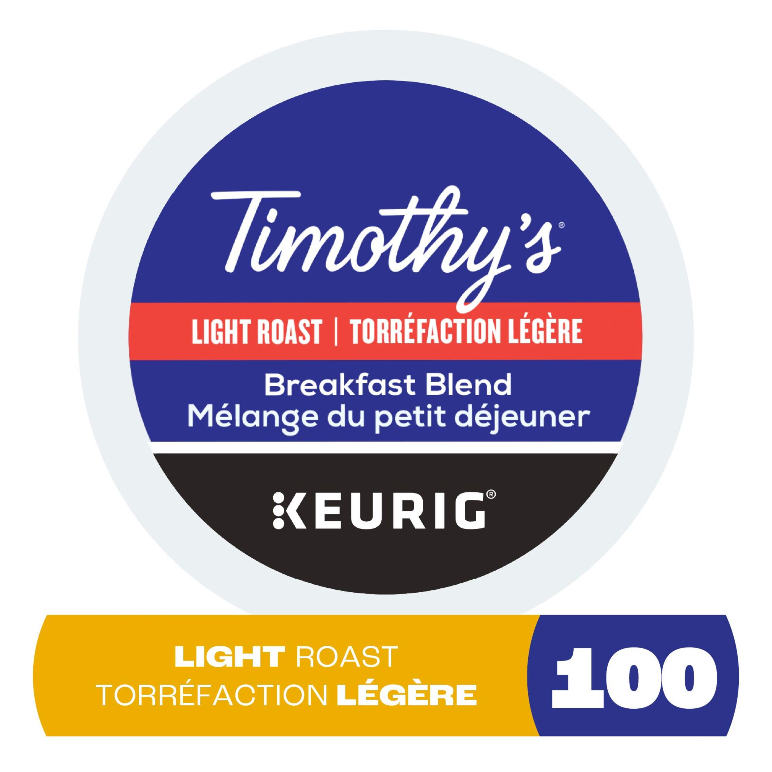 Dosettes K-Cup Keurig Timothy's, Mélange du petit déjeuner, proposent une combinaison de grains de café du Costa Rica et du Guatemala pour créer un café doux et agréable de torréfaction légère
