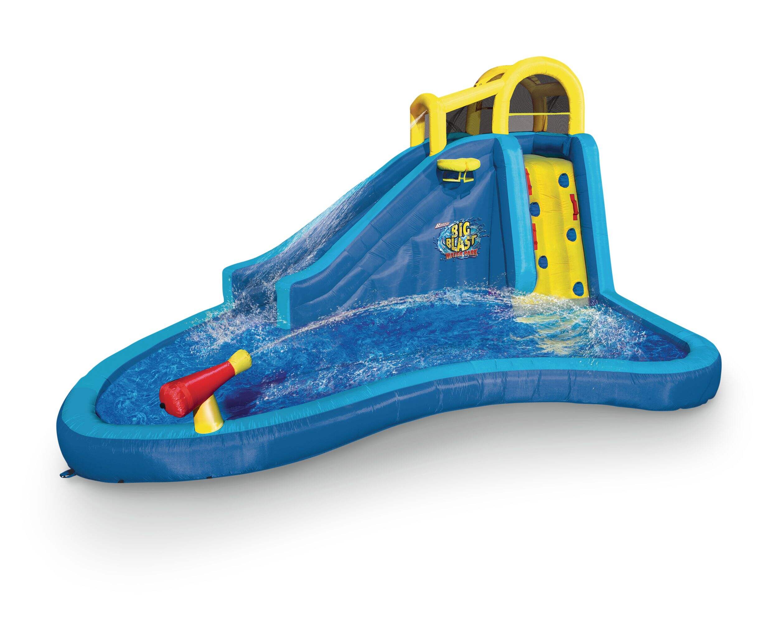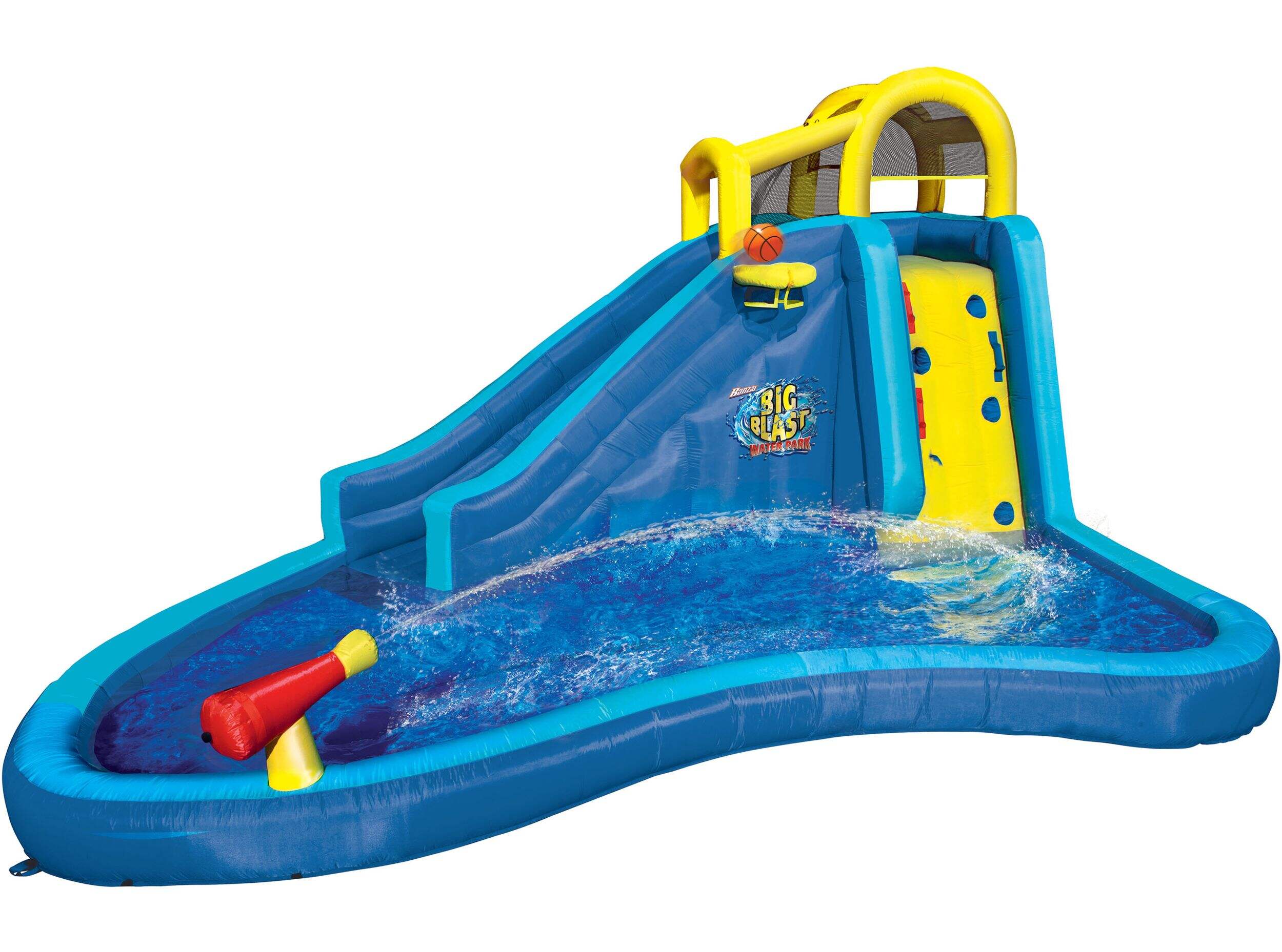 Préparez-vous à faire des vagues cet été avec le Parc aquatique Big Blast! Grimpez jusqu'au sommet et sautez dans le toboggan en glissant et en vous éclaboussant dans la piscine en style lagon. Jouez contre un ami en un-contre-un au jeu de basketball gonflable inclus, ou tirez-le en plein dans le mille avec le canon à eau. Avec sa pompe à jet d'air continu, cet ensemble amusant se gonfle en moins de 2 minutes. Sa construction de service intense Dura-Tech est très robuste et durable. Gageons que vous ne pourrez plus arrêter de vous amuser!